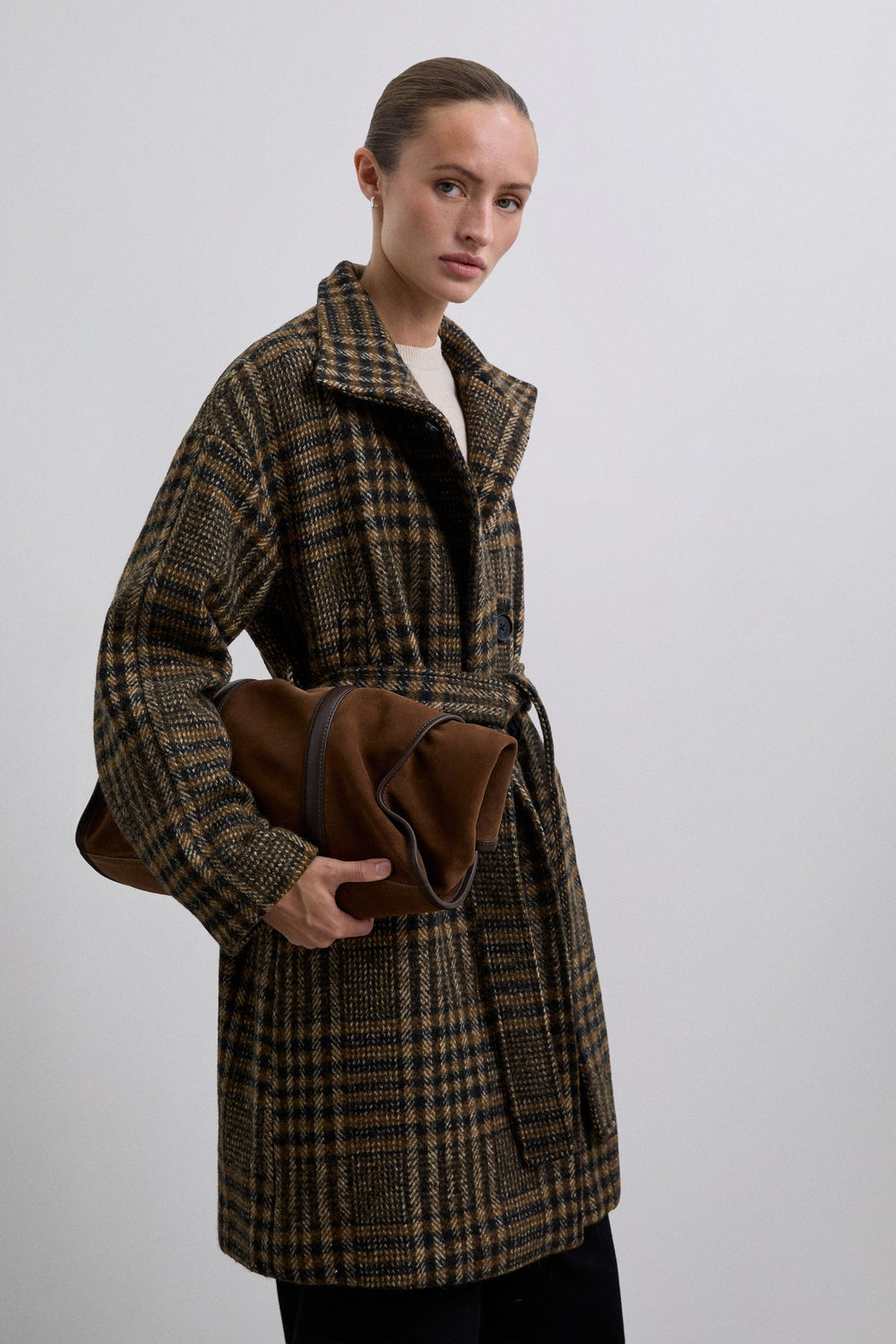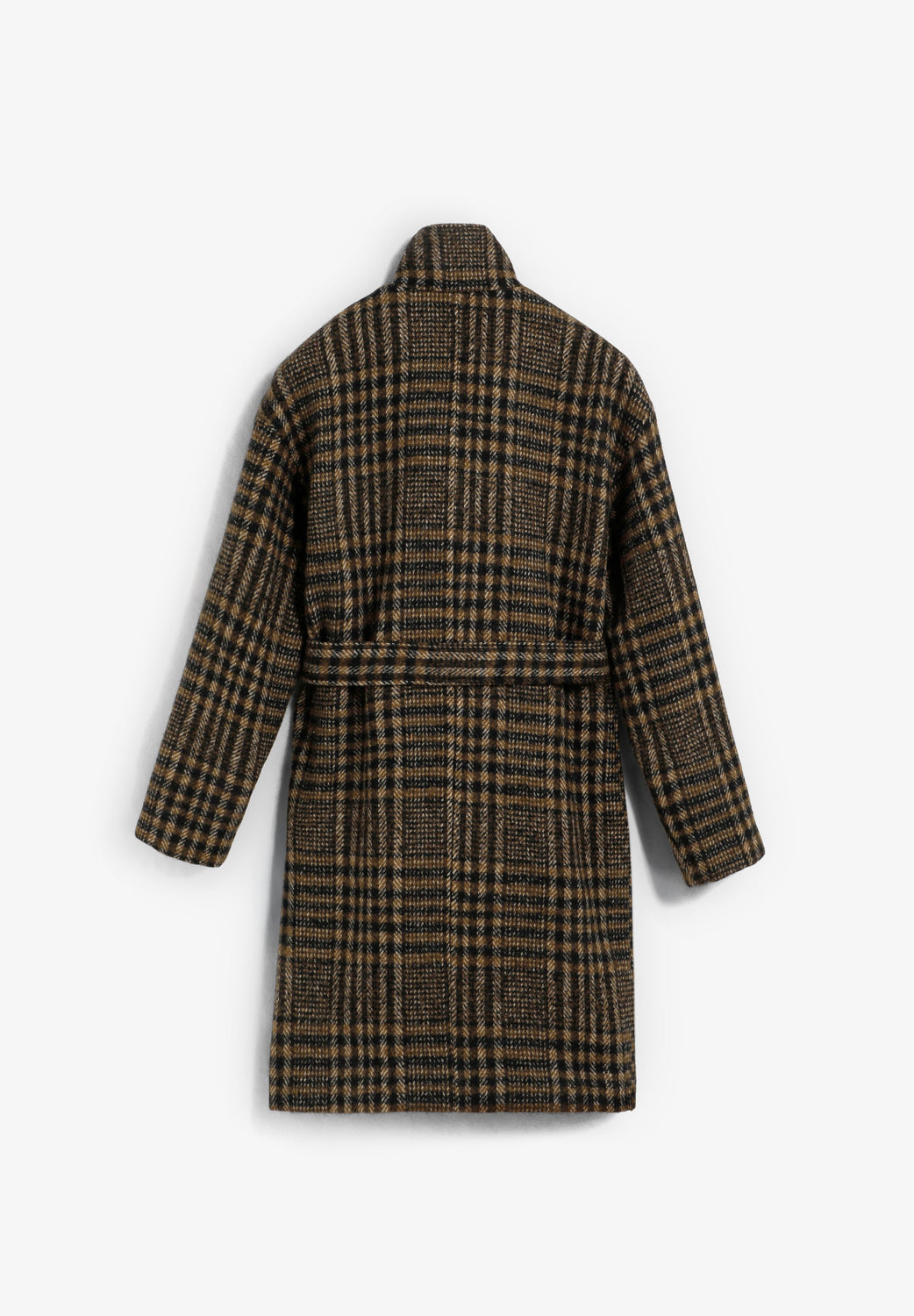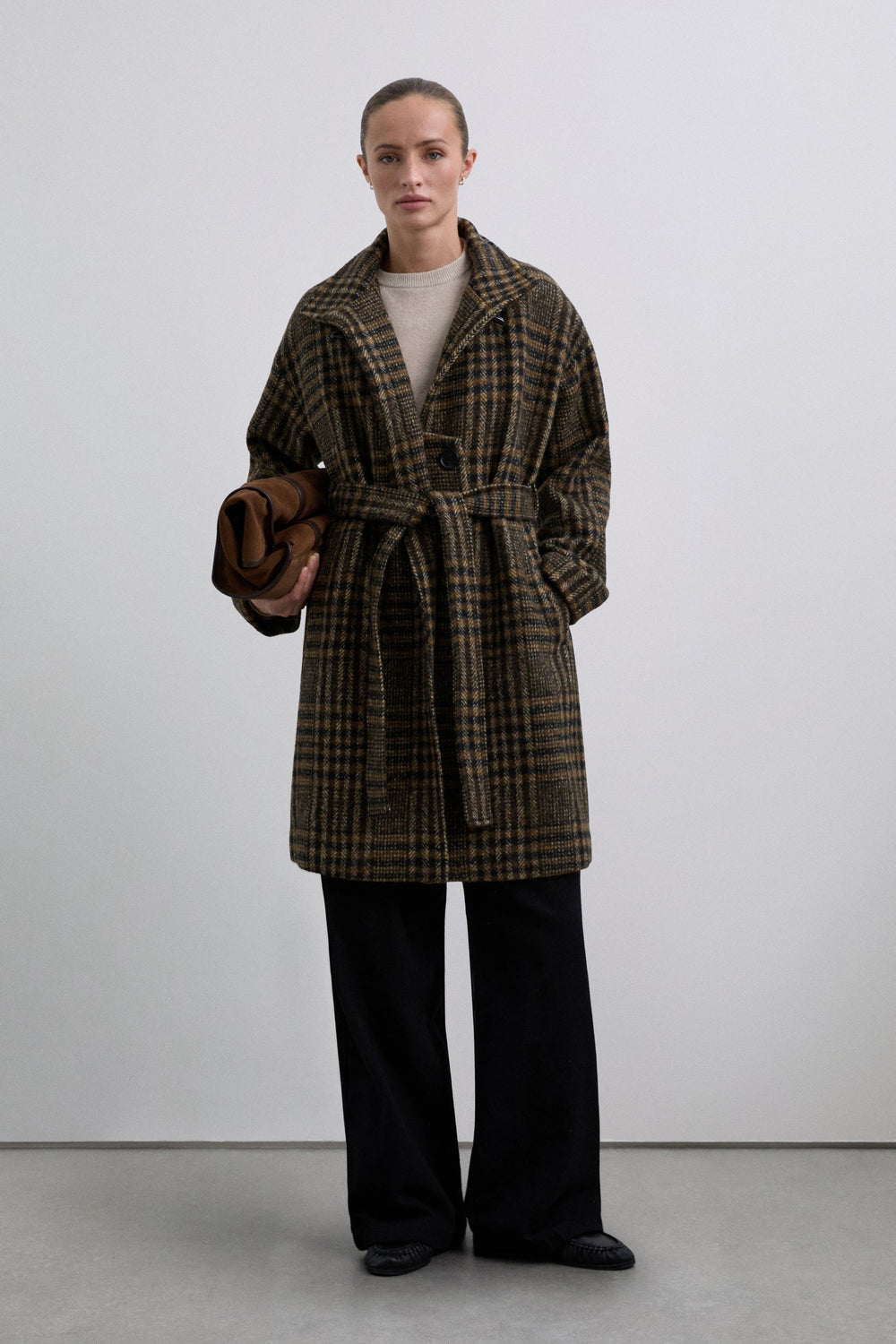 Cropped coat made of wool. Straight stand-up collar. Toggle style button at the top. Inner fastening with 2 buttons and outer fastening with adjustable belt. Long sleeves with turn-back cuffs.