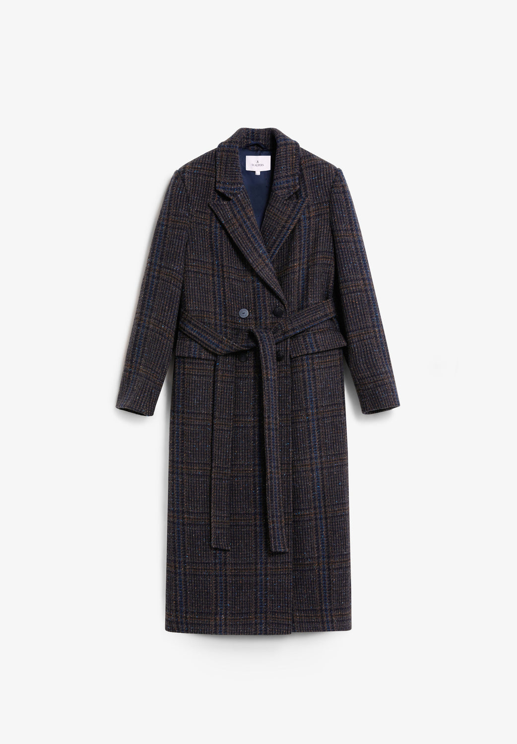 Long wool coat with subtle check pattern. Features shoulder pads, straight cut and classic lapels. Front button fastening and matching belt to adjust the waist. Side pockets.