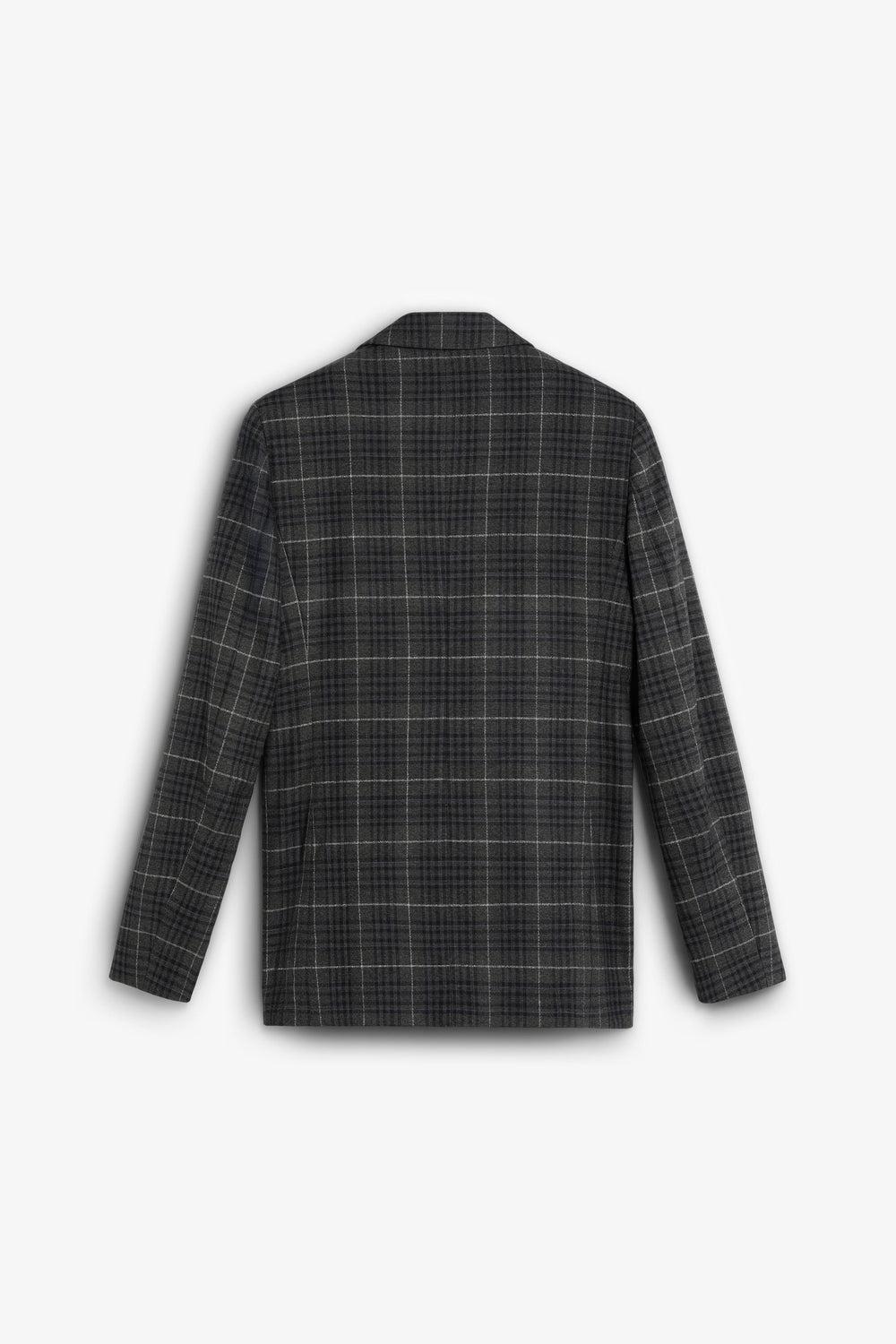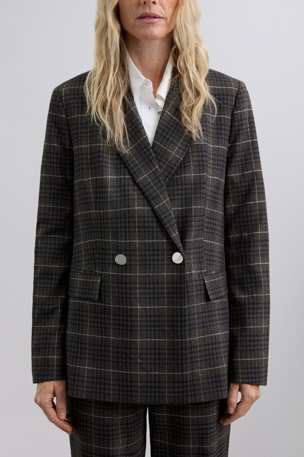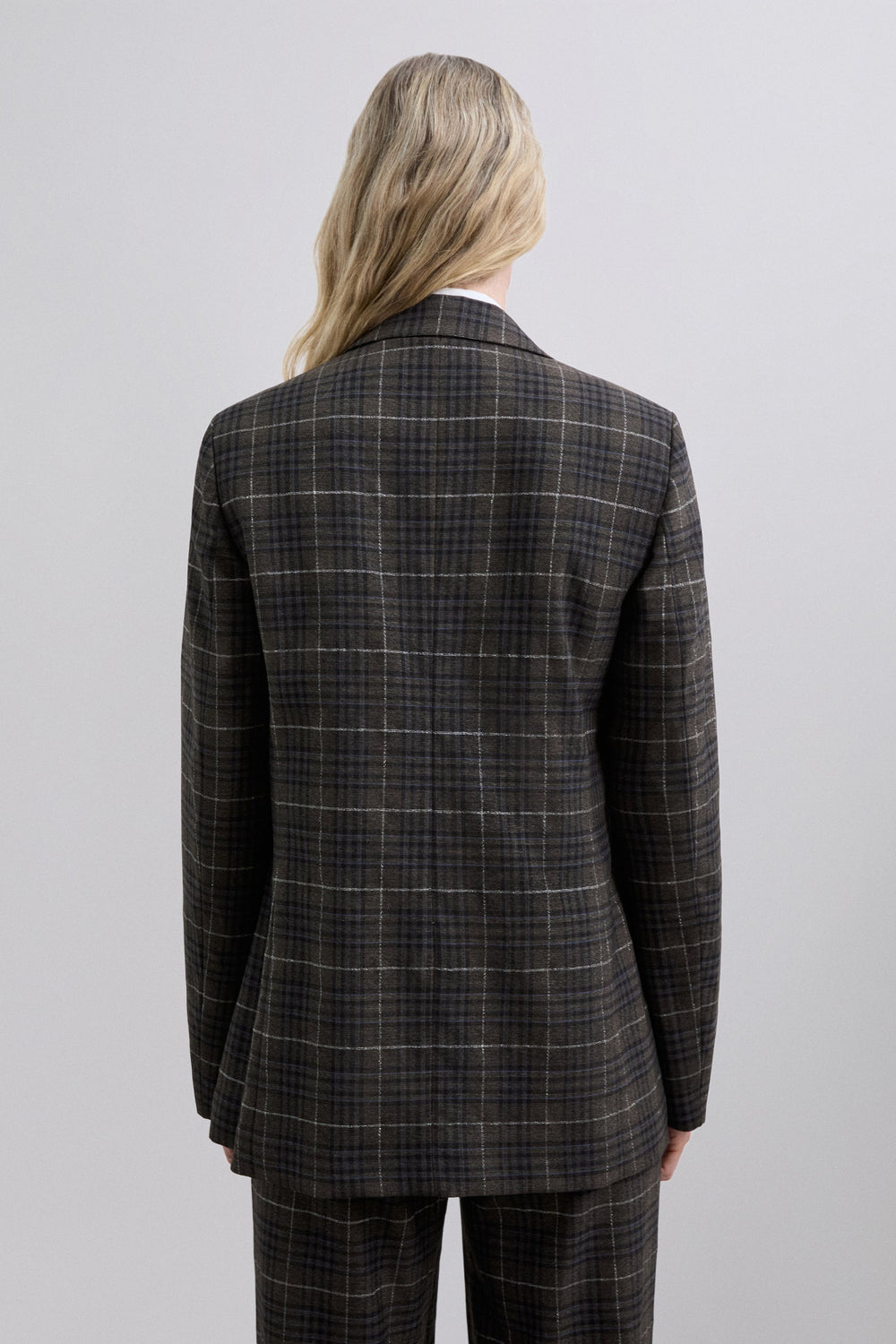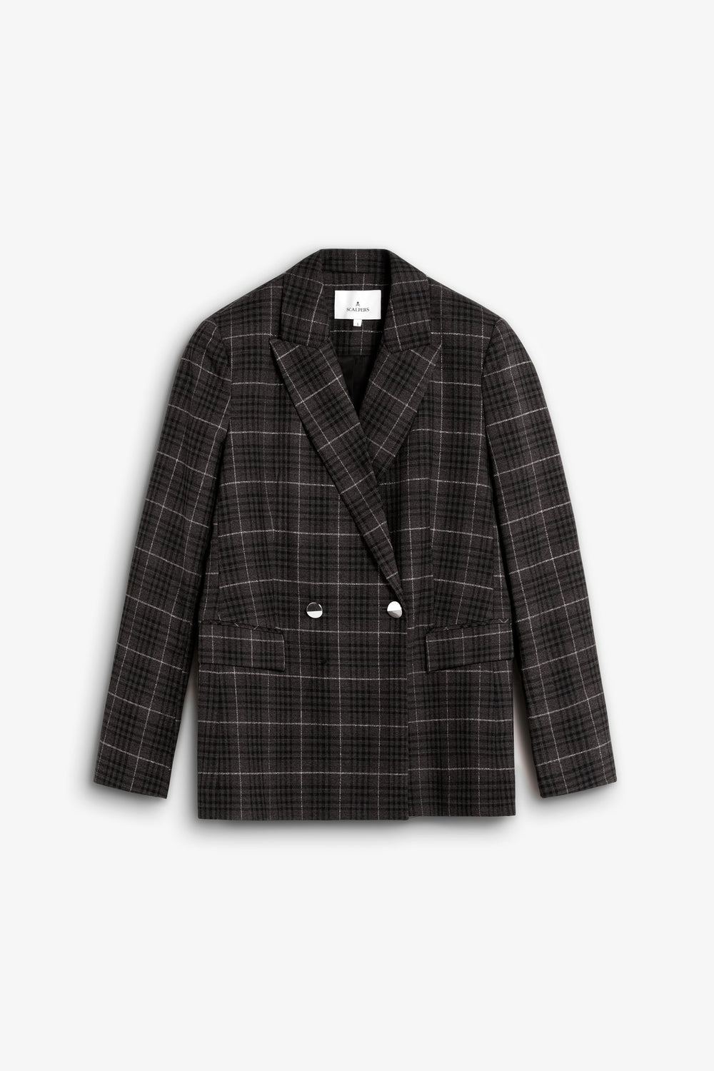 Blazer with pointed lapel. Long sleeves. Double-breasted front button fastening. Two welt pockets. Check print.