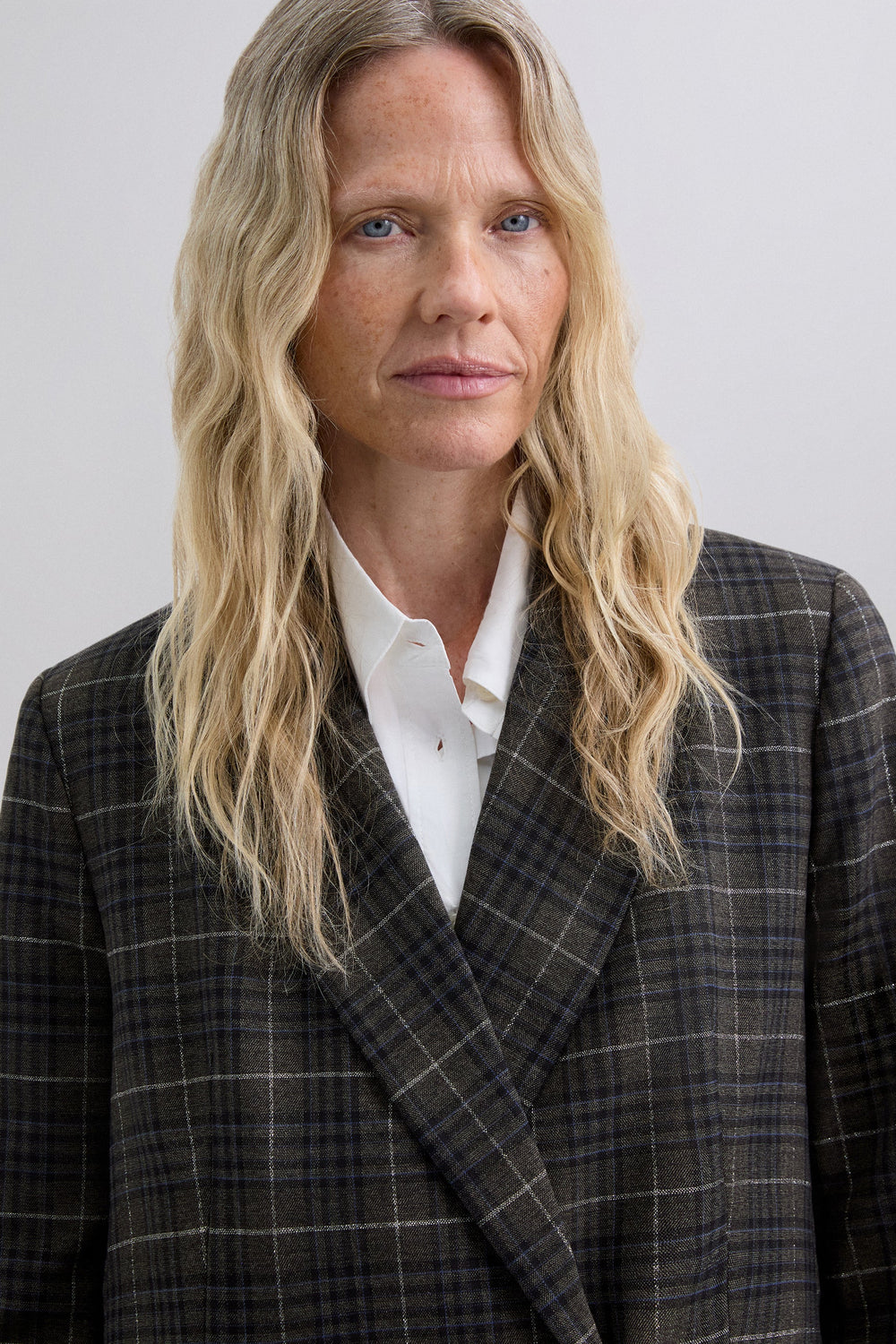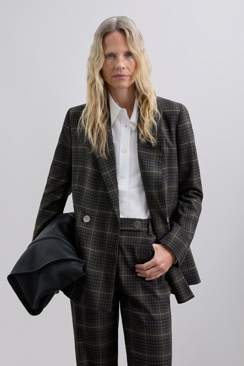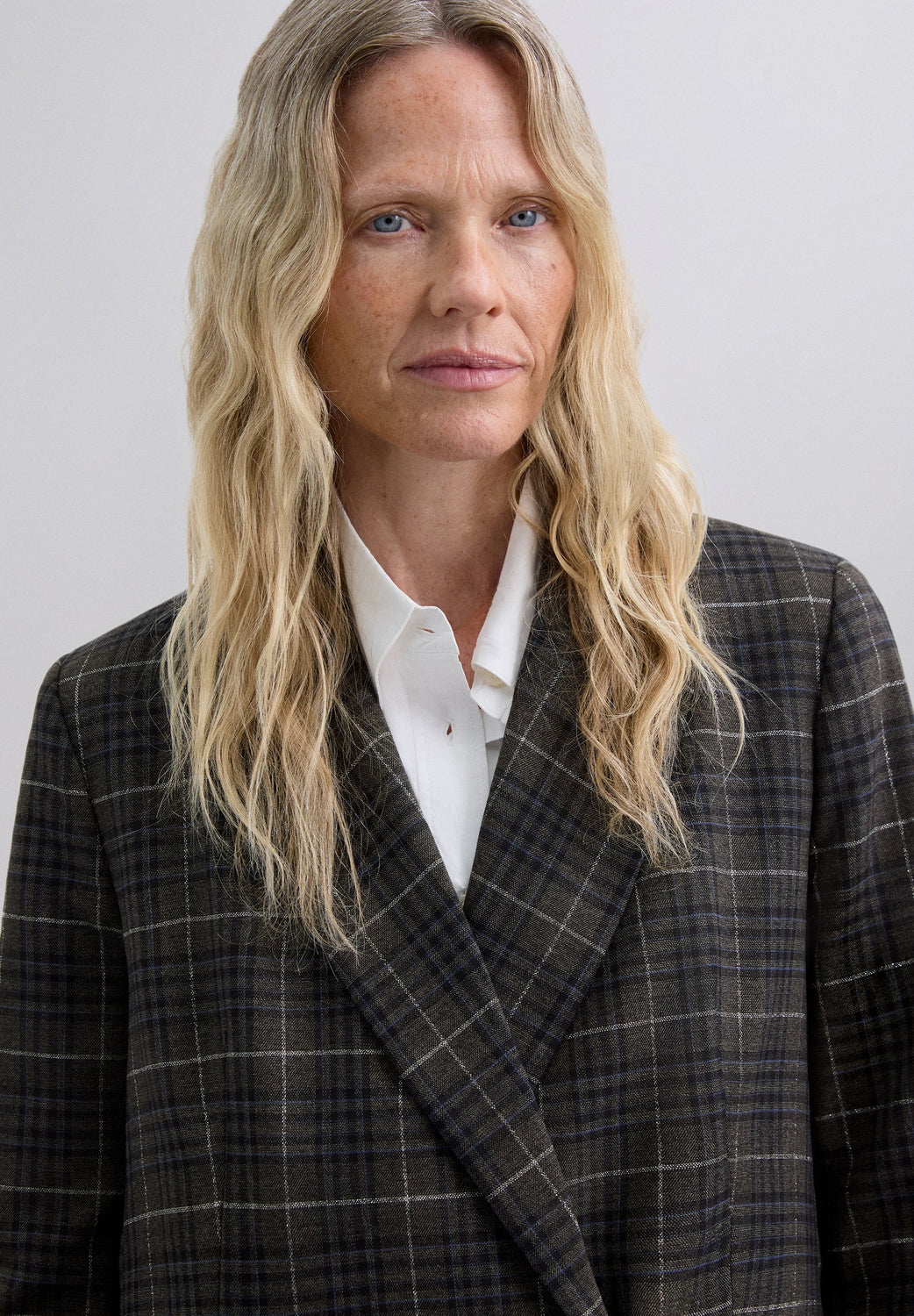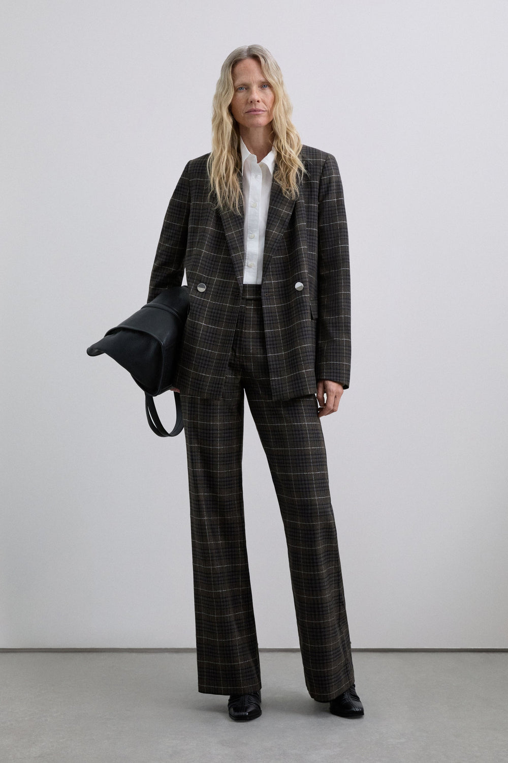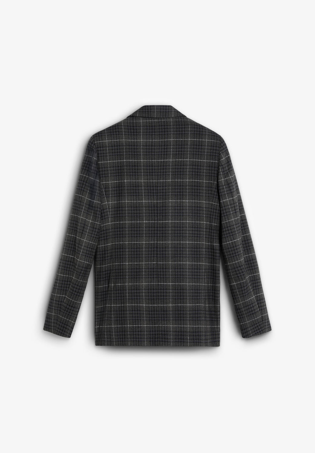 Blazer with pointed lapel. Long sleeves. Double-breasted front button fastening. Two welt pockets. Check print.