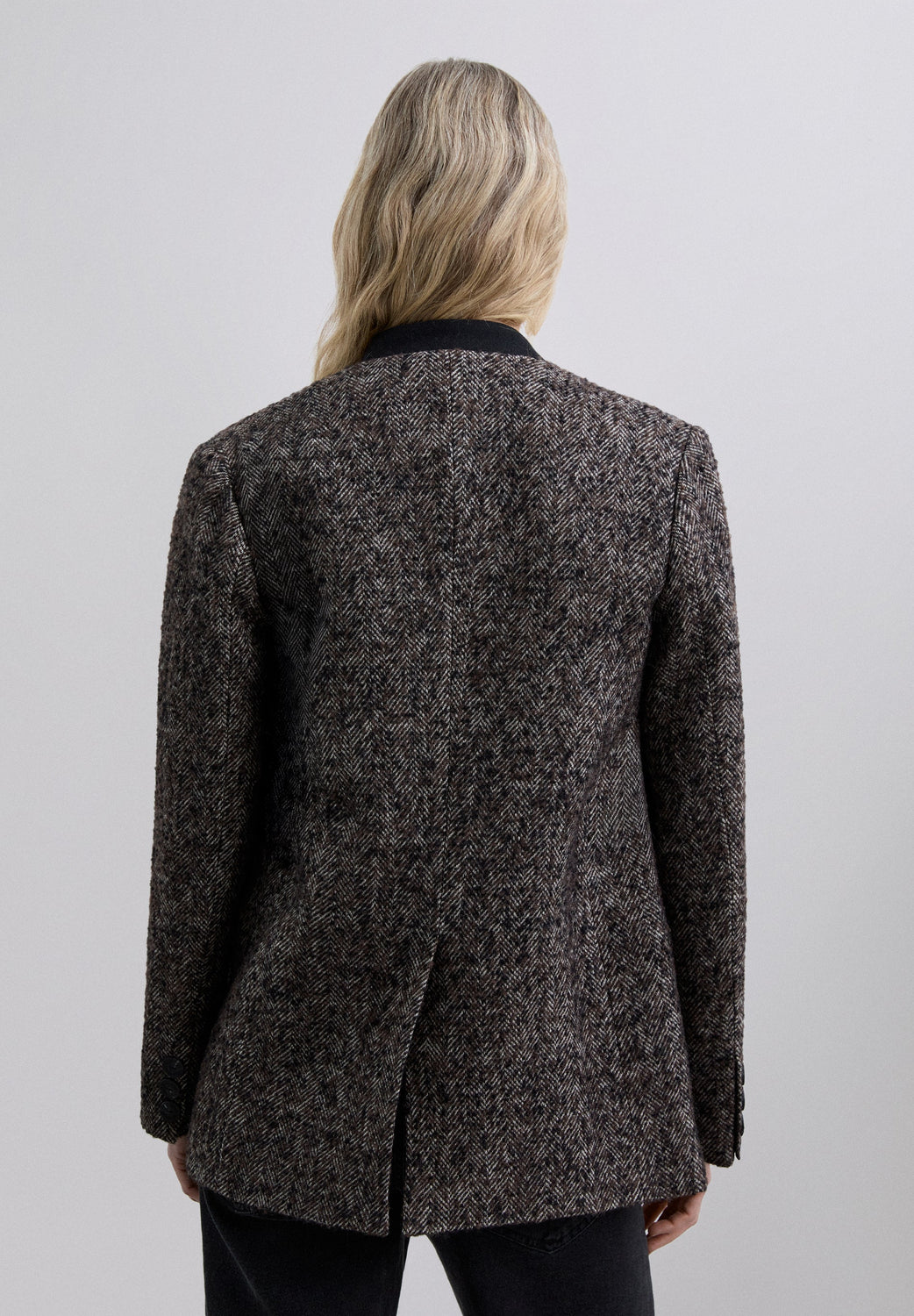 Collarless wool blazer. It comes with a short, fitted waistcoat. Long sleeves. Two back pockets with flaps. Front button fastening.