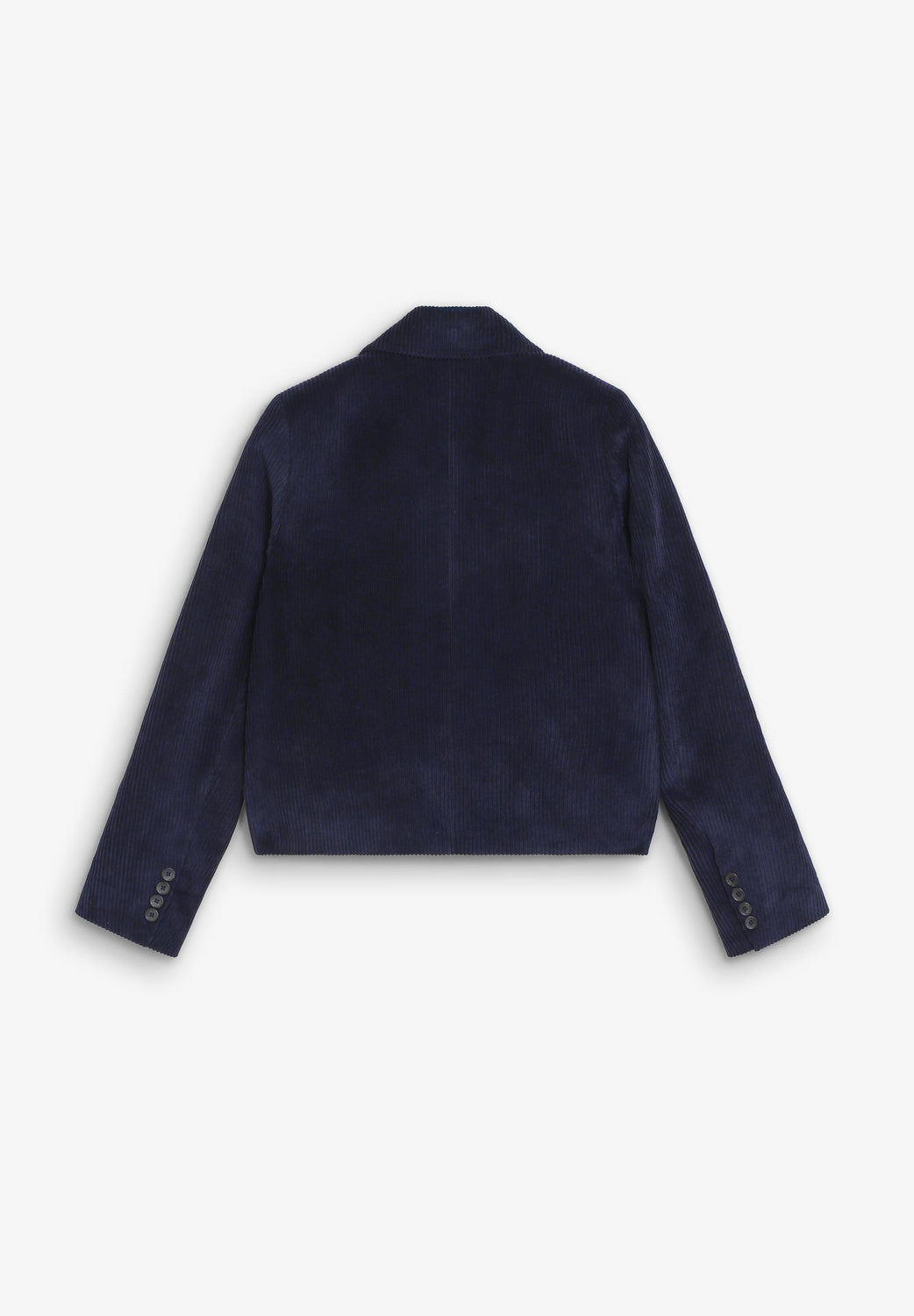 Corduroy blazer with notch lapel. Long sleeves. Double-breasted button fastening at front. Two front flap pockets. Button fastening at cuffs.
