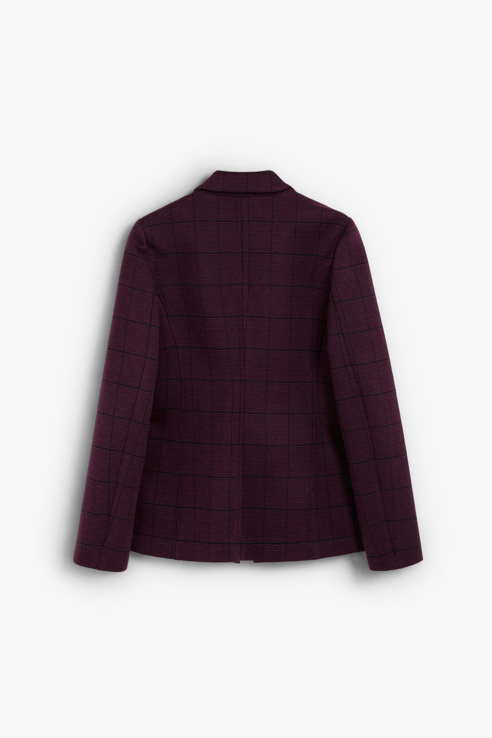 Textured burgundy blazer with check print. Lapel collar. Slightly fitted. Long sleeves. Button closure. Front patch pockets.