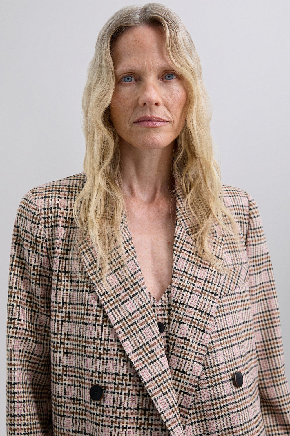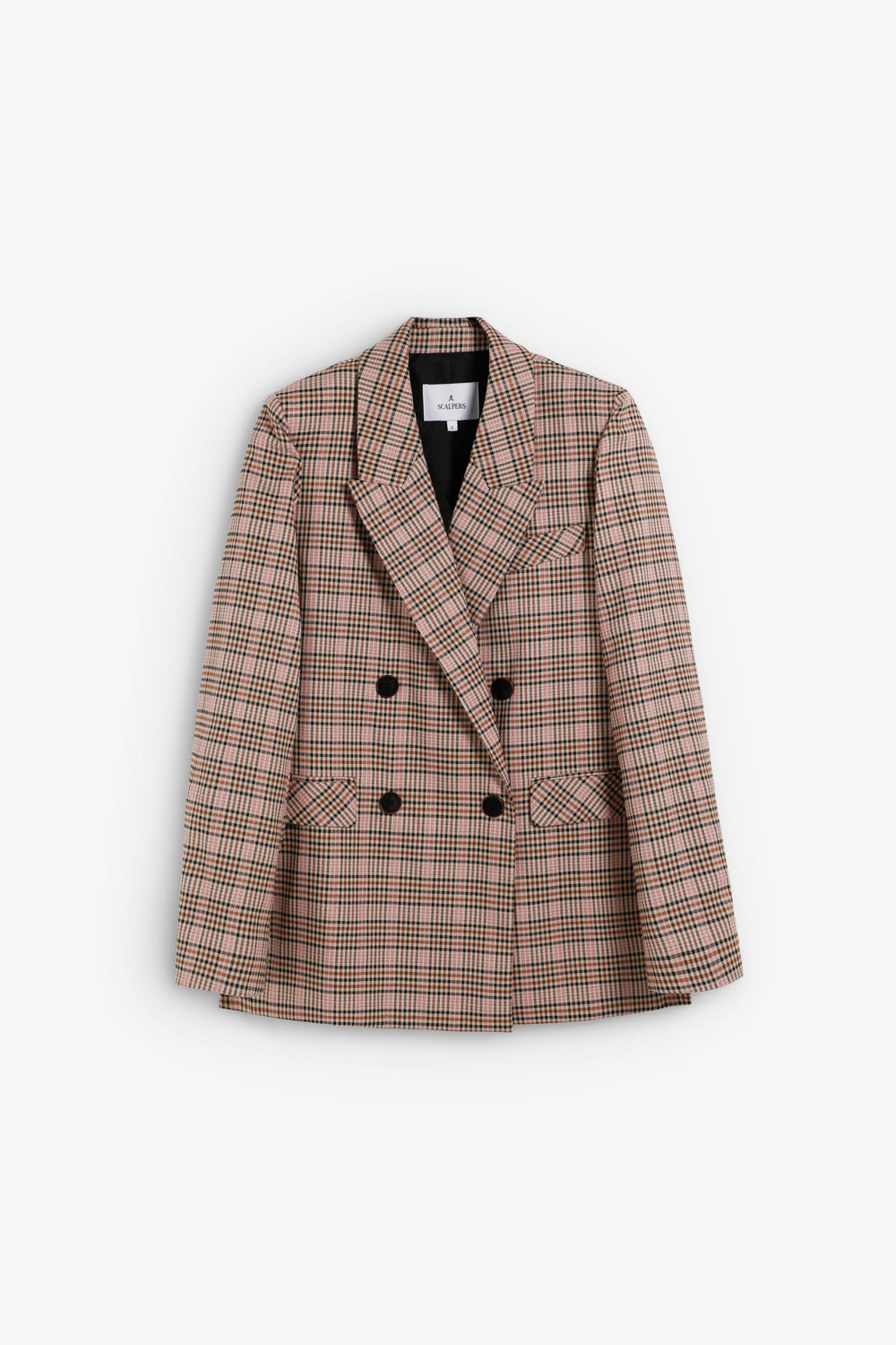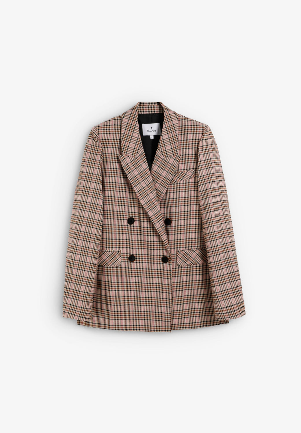 Double-breasted blazer with check print. Lapel collar. Button fastening. Long sleeves with buttoned cuffs. Front flap pockets.