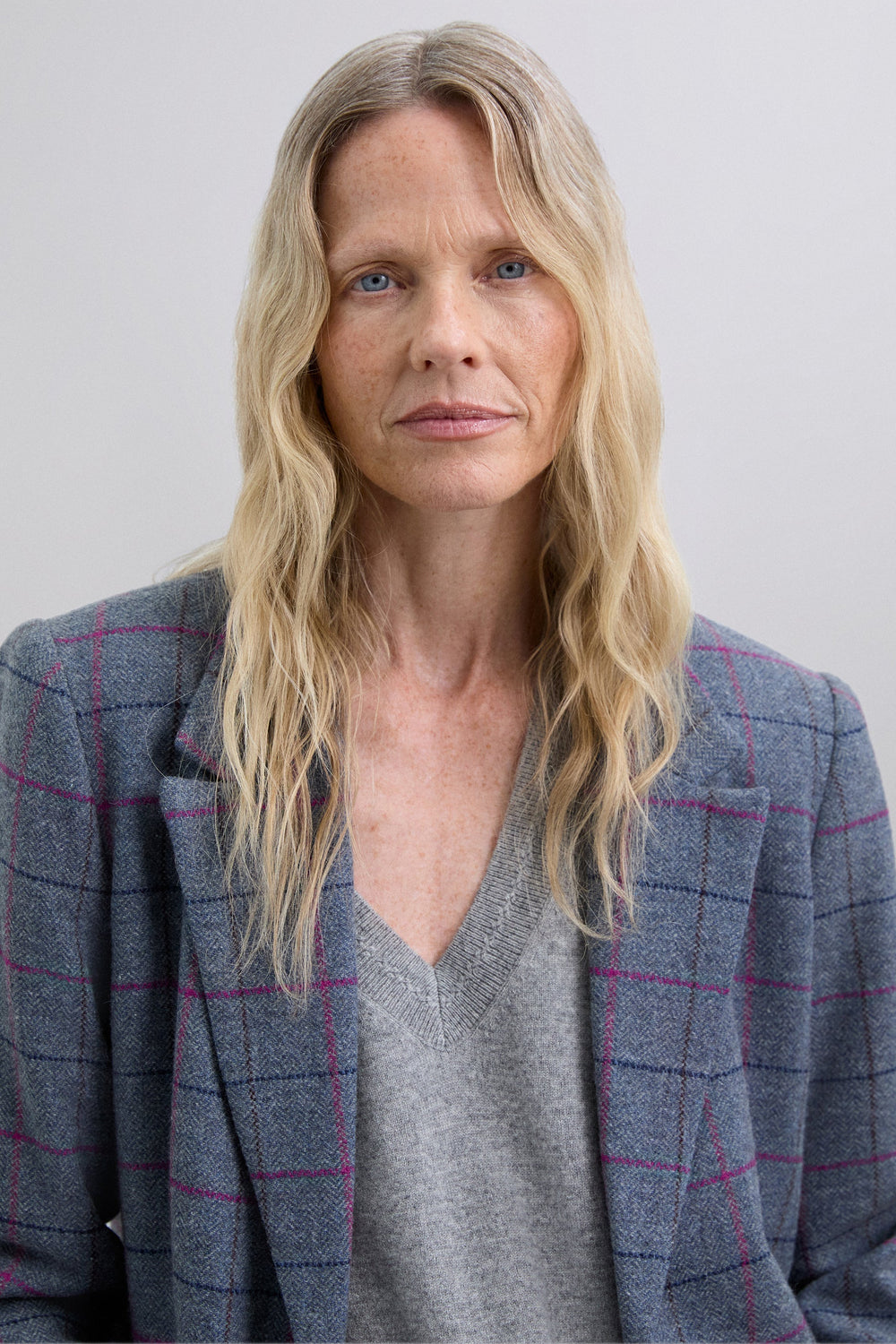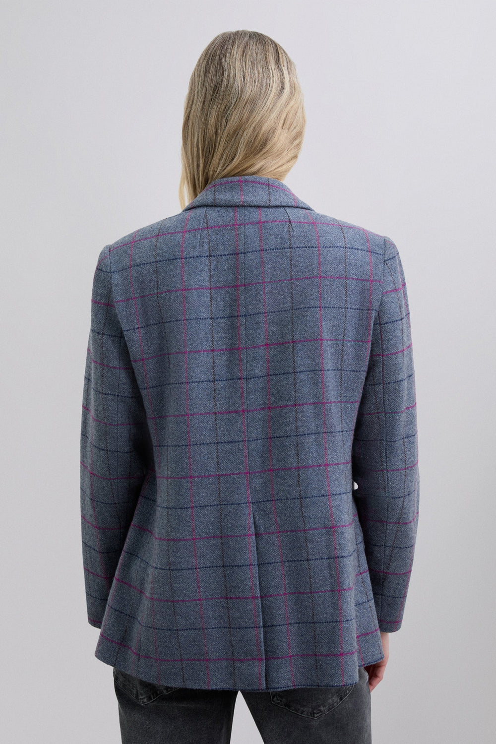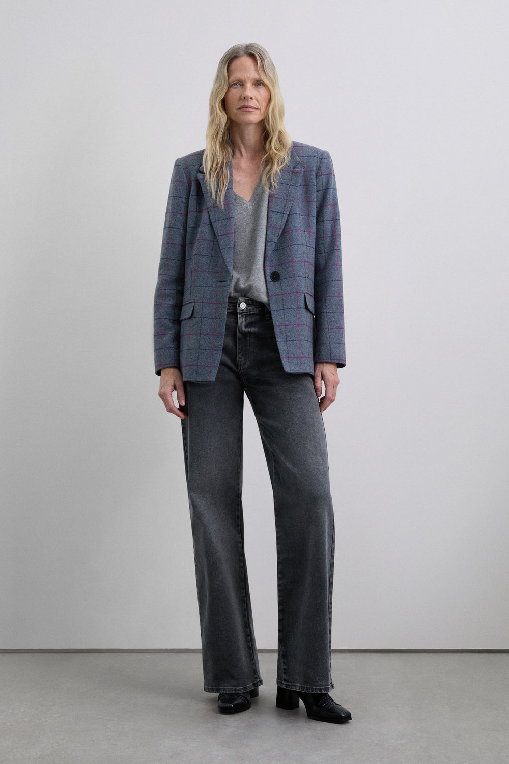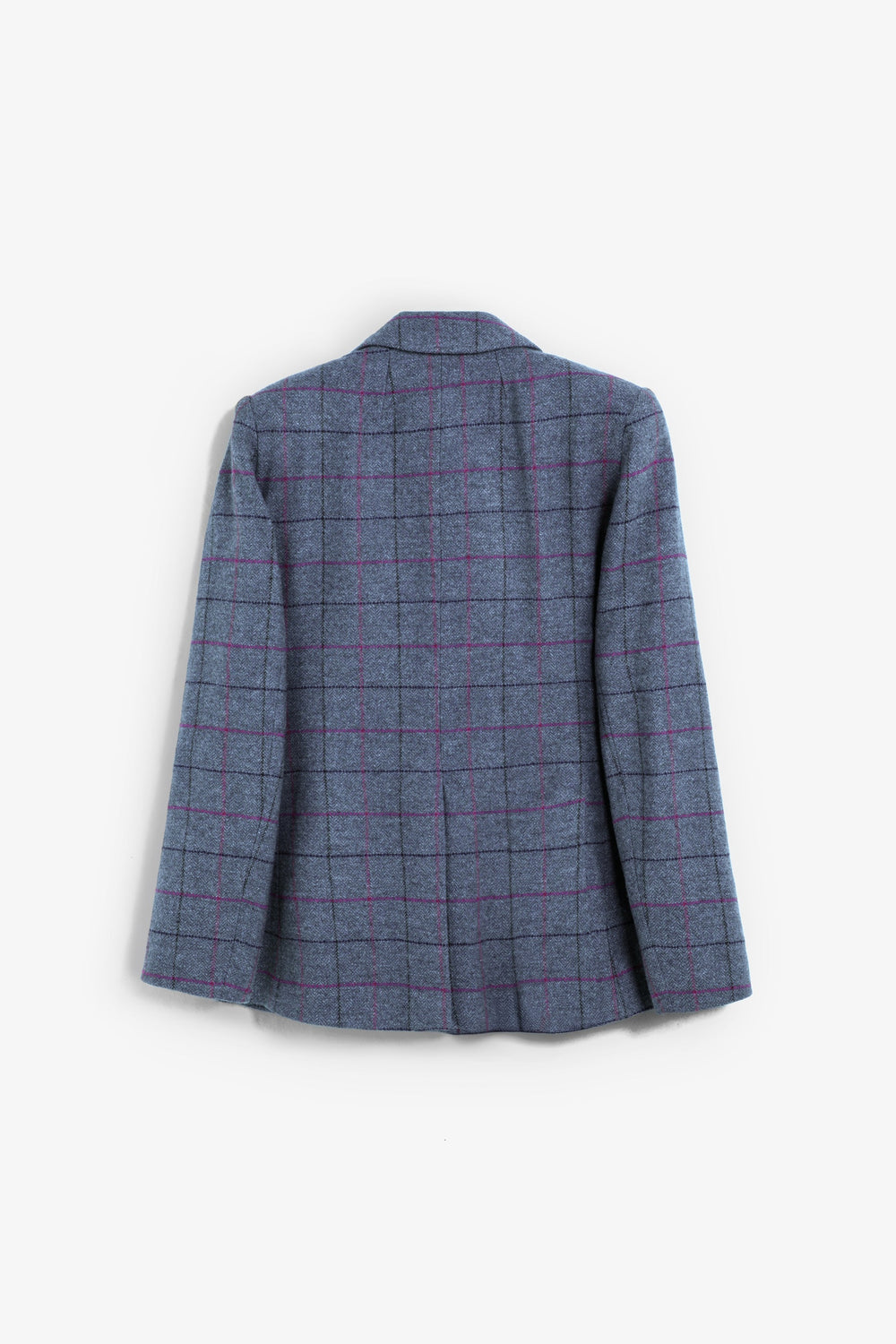 Blazer made of wool. Check print. Textured shoulder pads. Front button fastening. Two back pockets with flaps.