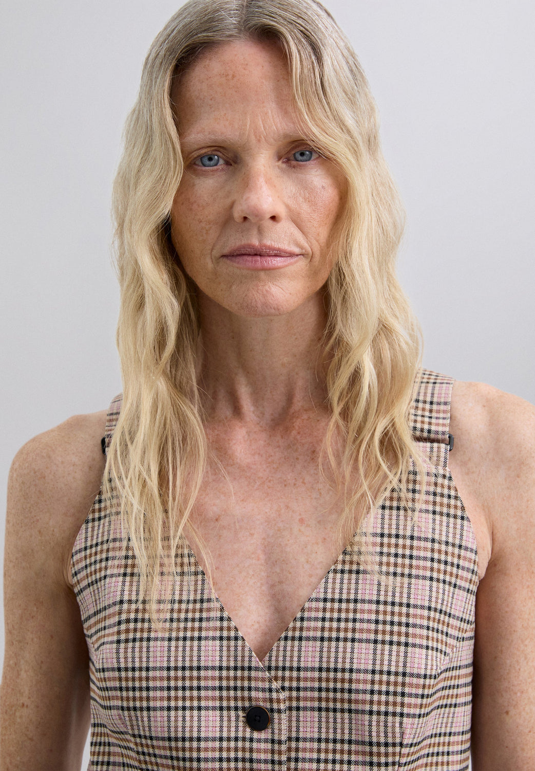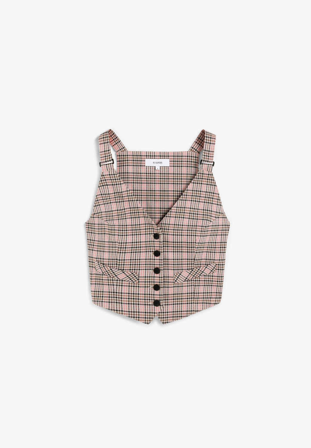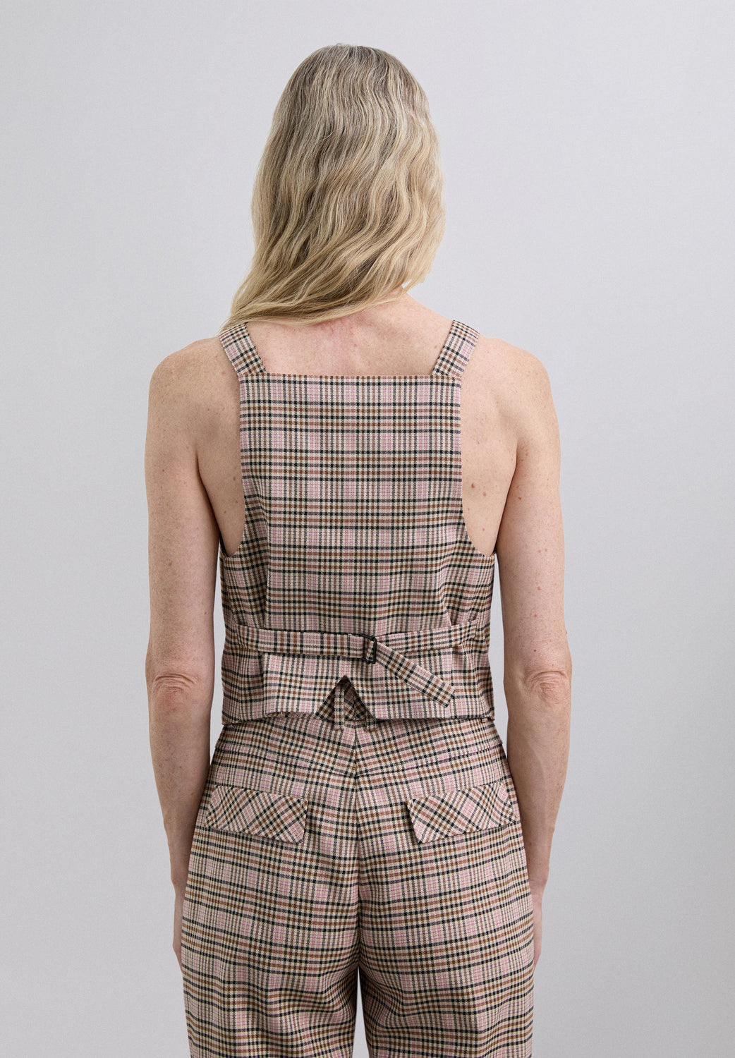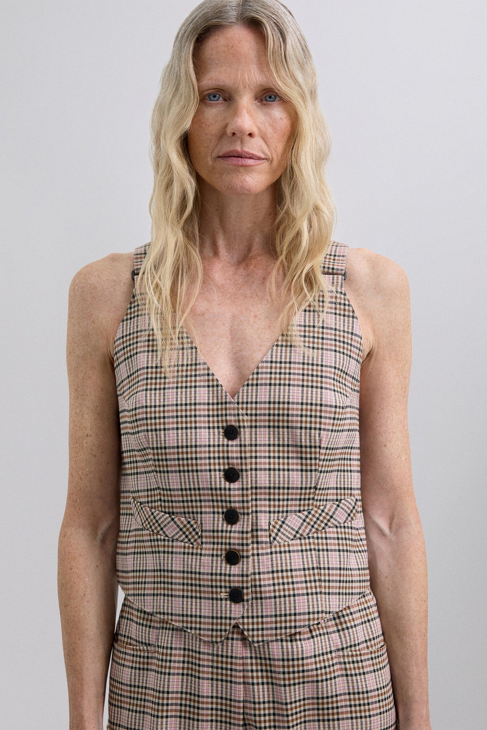 Coat with check print. V-neck, with straps. Front button fastening. Two front pockets.