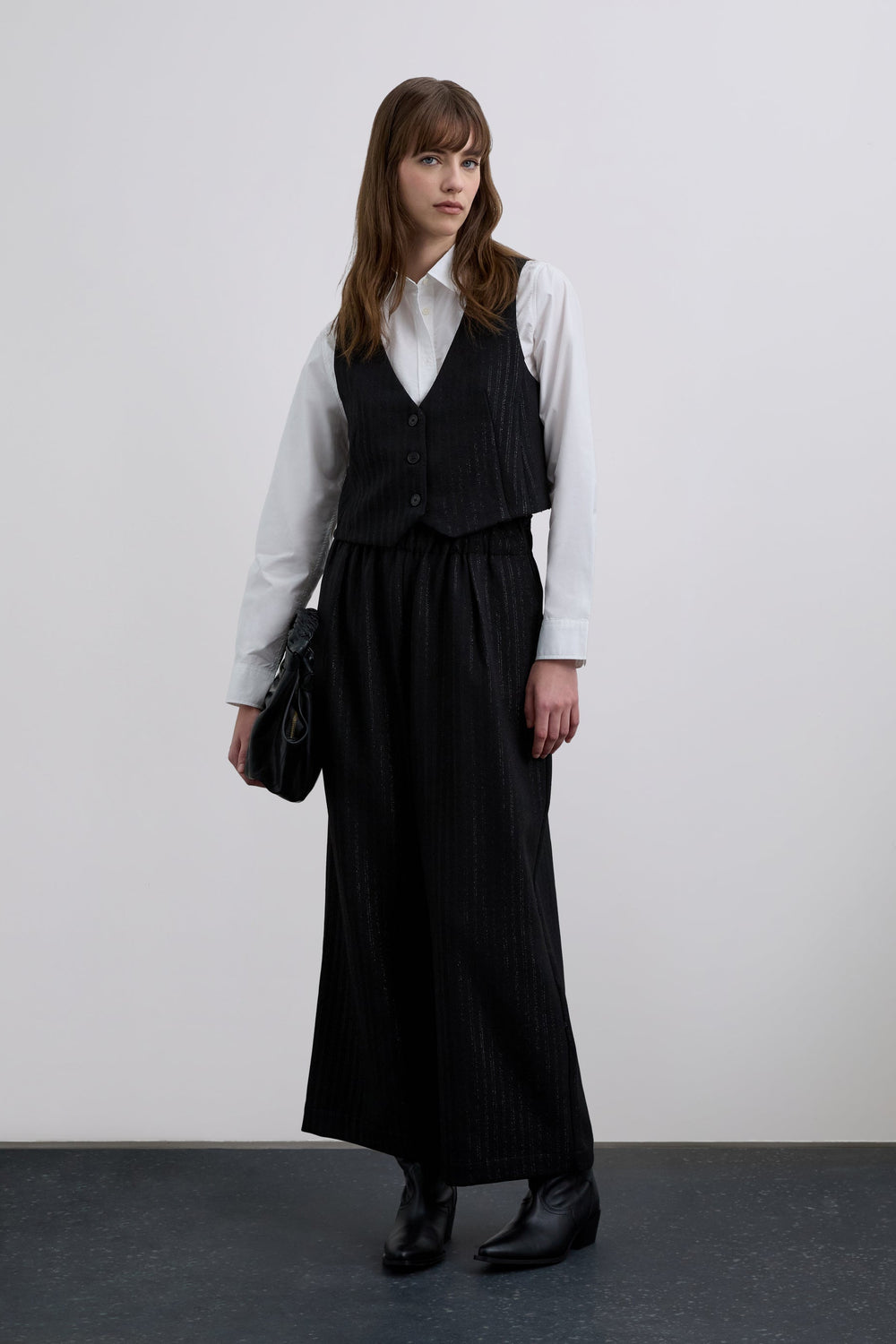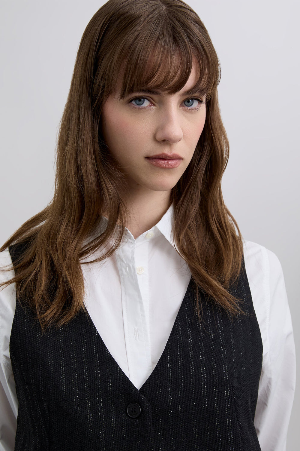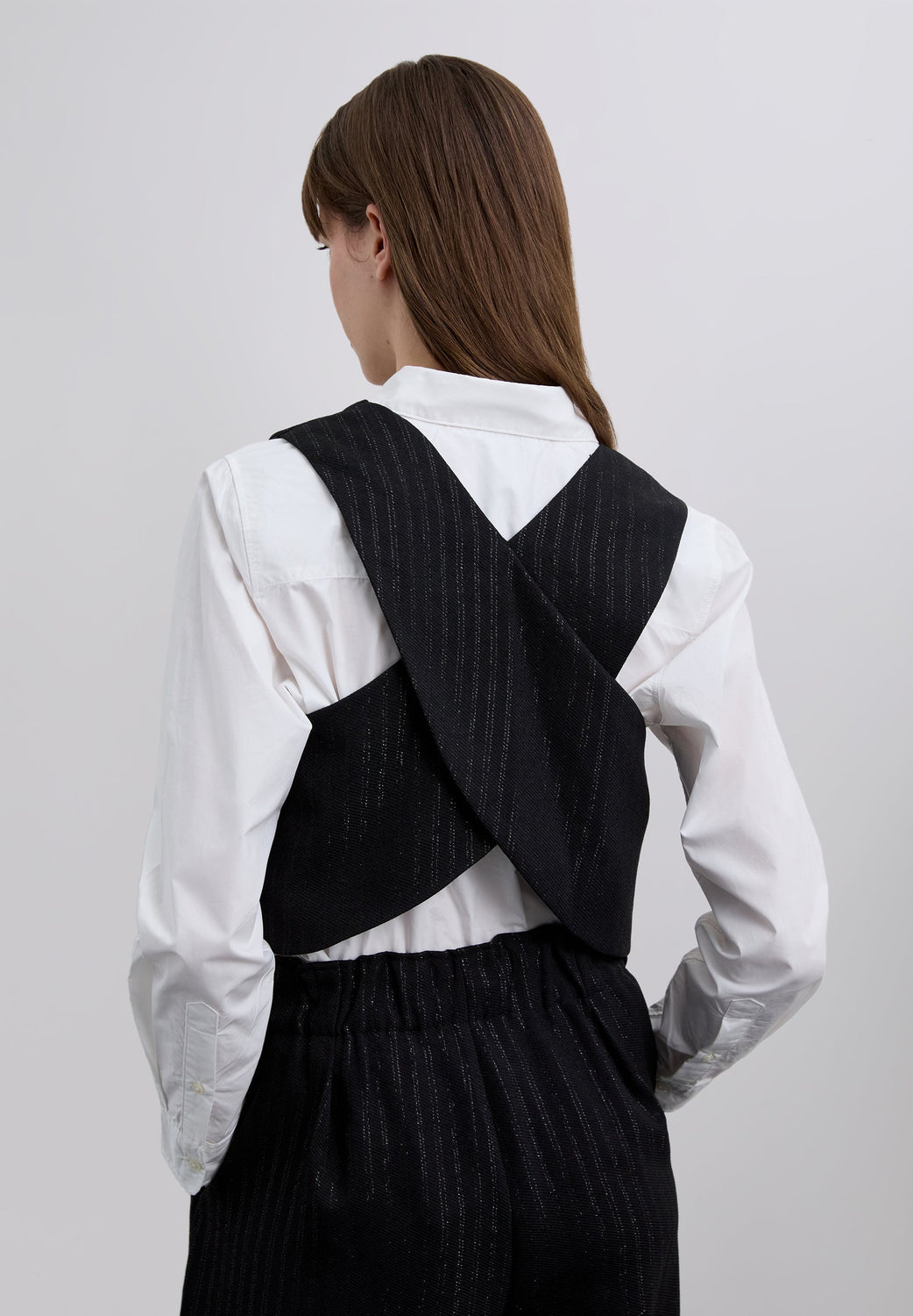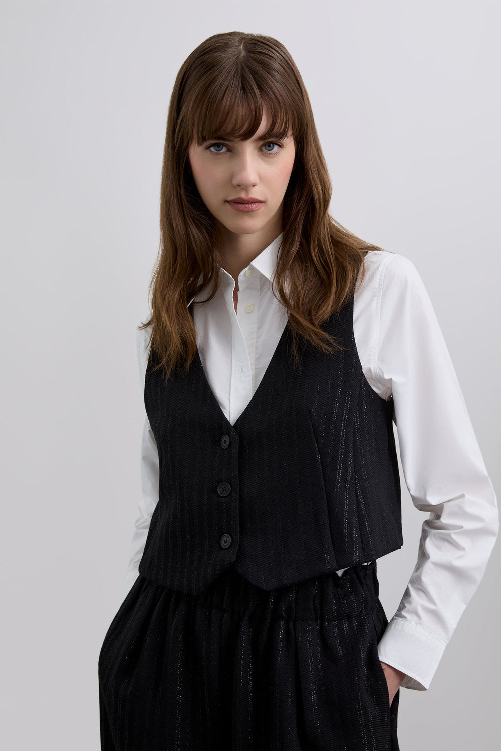 Waistcoat made of flowing fabric with lurex stripe print. Slim fit. V-neck. Sleeveless. Crossed back. Button fastening.