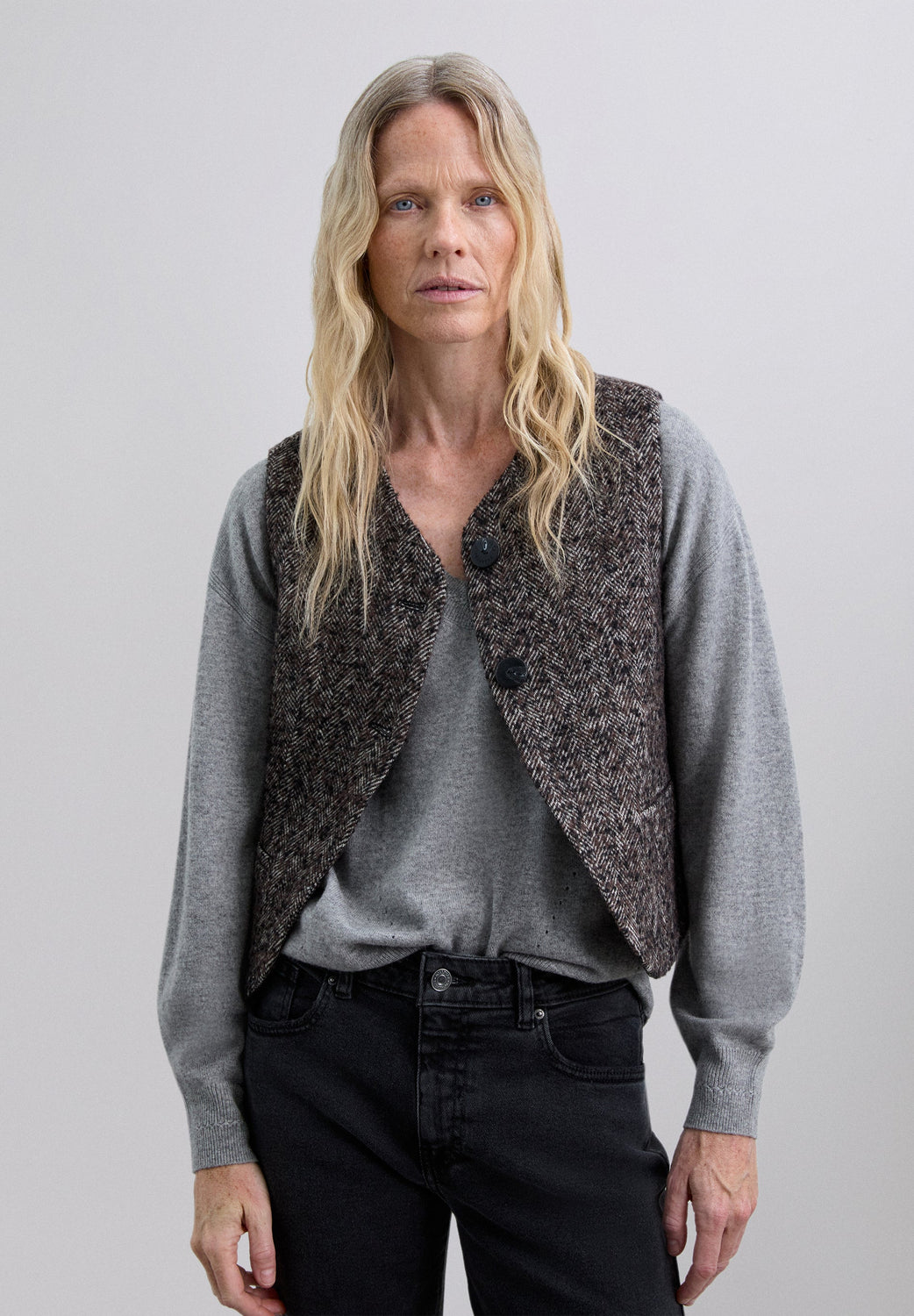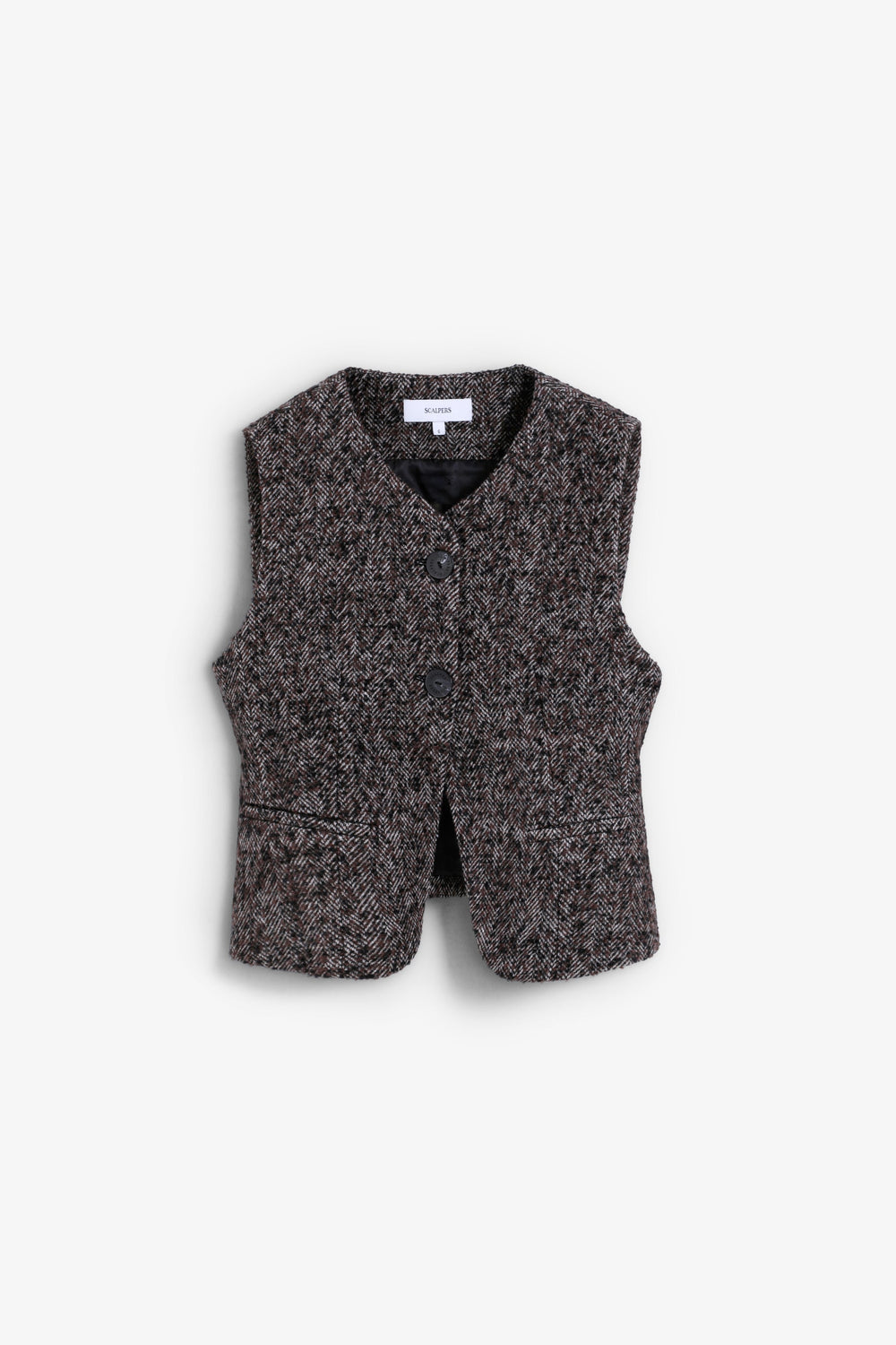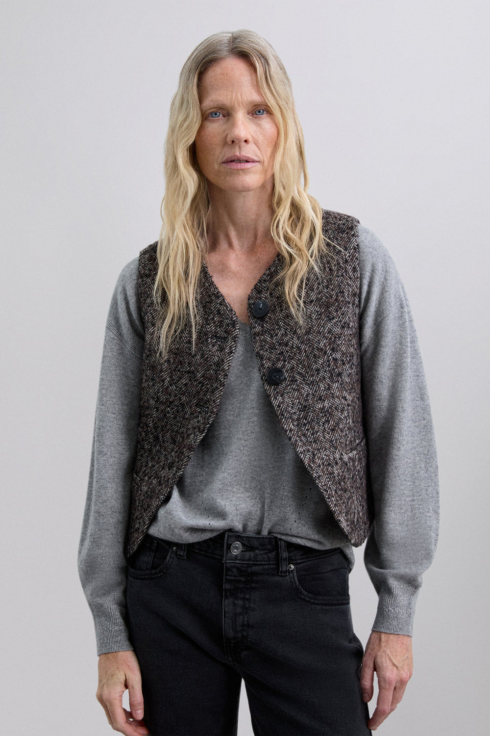 Wool blend waistcoat with herringbone pattern and texture. Slightly V-neck, cutaway sleeves and button fastening. Fitted design, adjustable at the back with buckle. Welt pockets on the front.