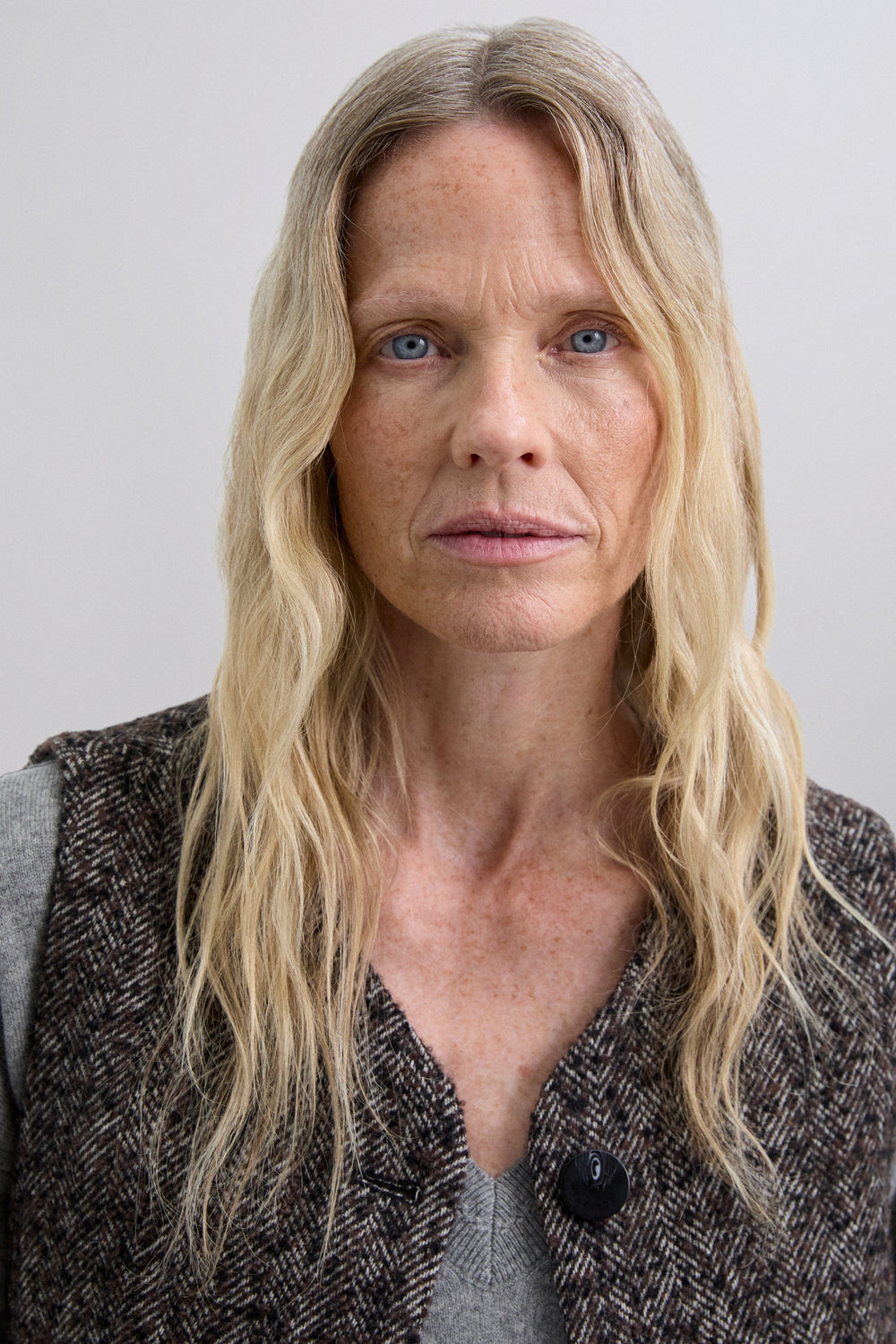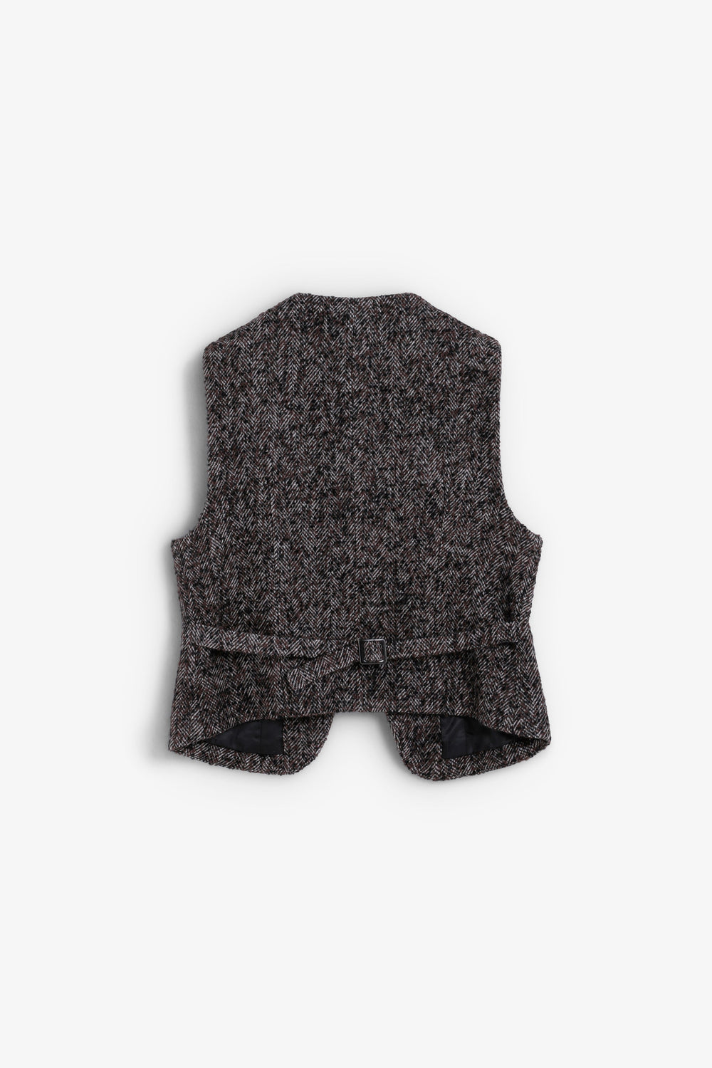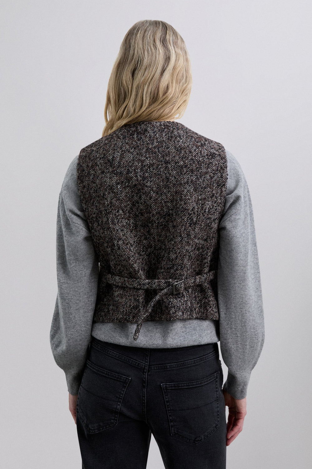 Wool blend waistcoat with herringbone pattern and texture. Slightly V-neck, cutaway sleeves and button fastening. Fitted design, adjustable at the back with buckle. Welt pockets on the front.