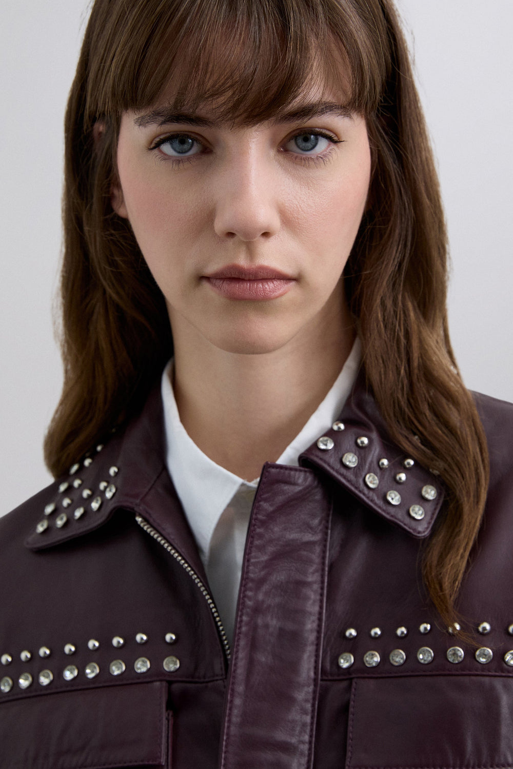 Jacket made of 100% leather. Regular fit. Classic collar. Embroidered details with studs and rhinestones. Front zip and press stud fastening. Front patch pockets. Long straight sleeves with buttoned cuffs.