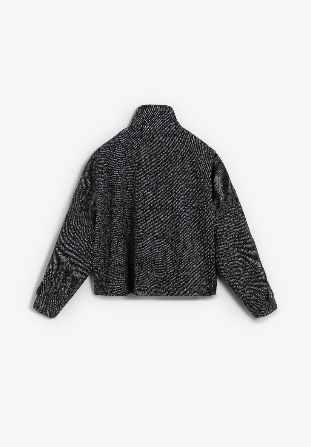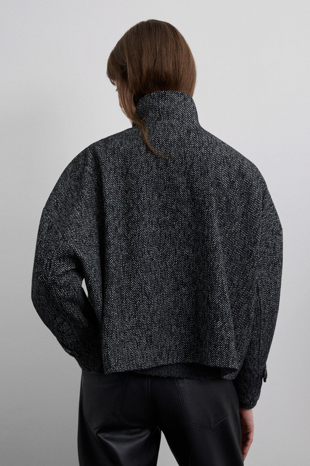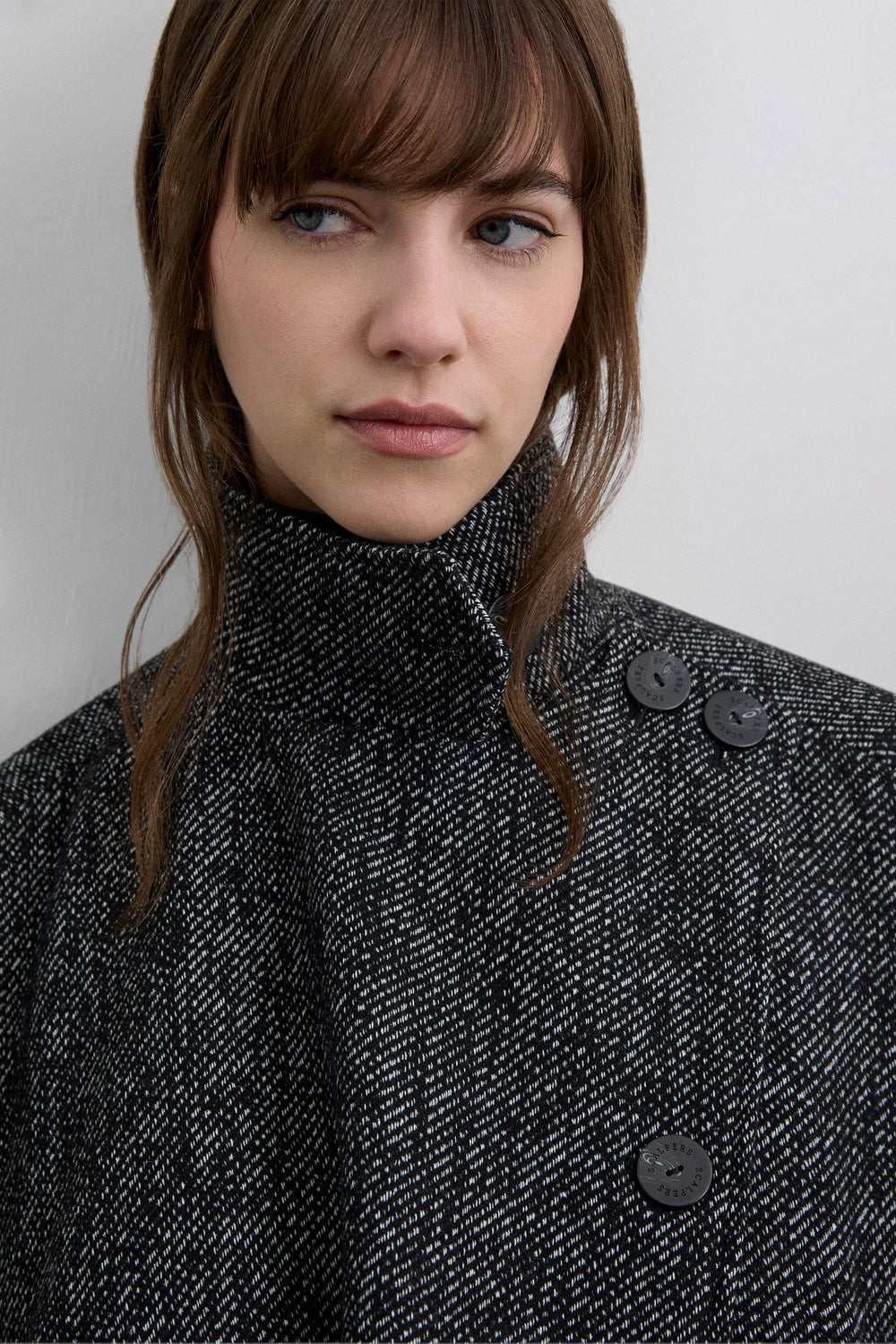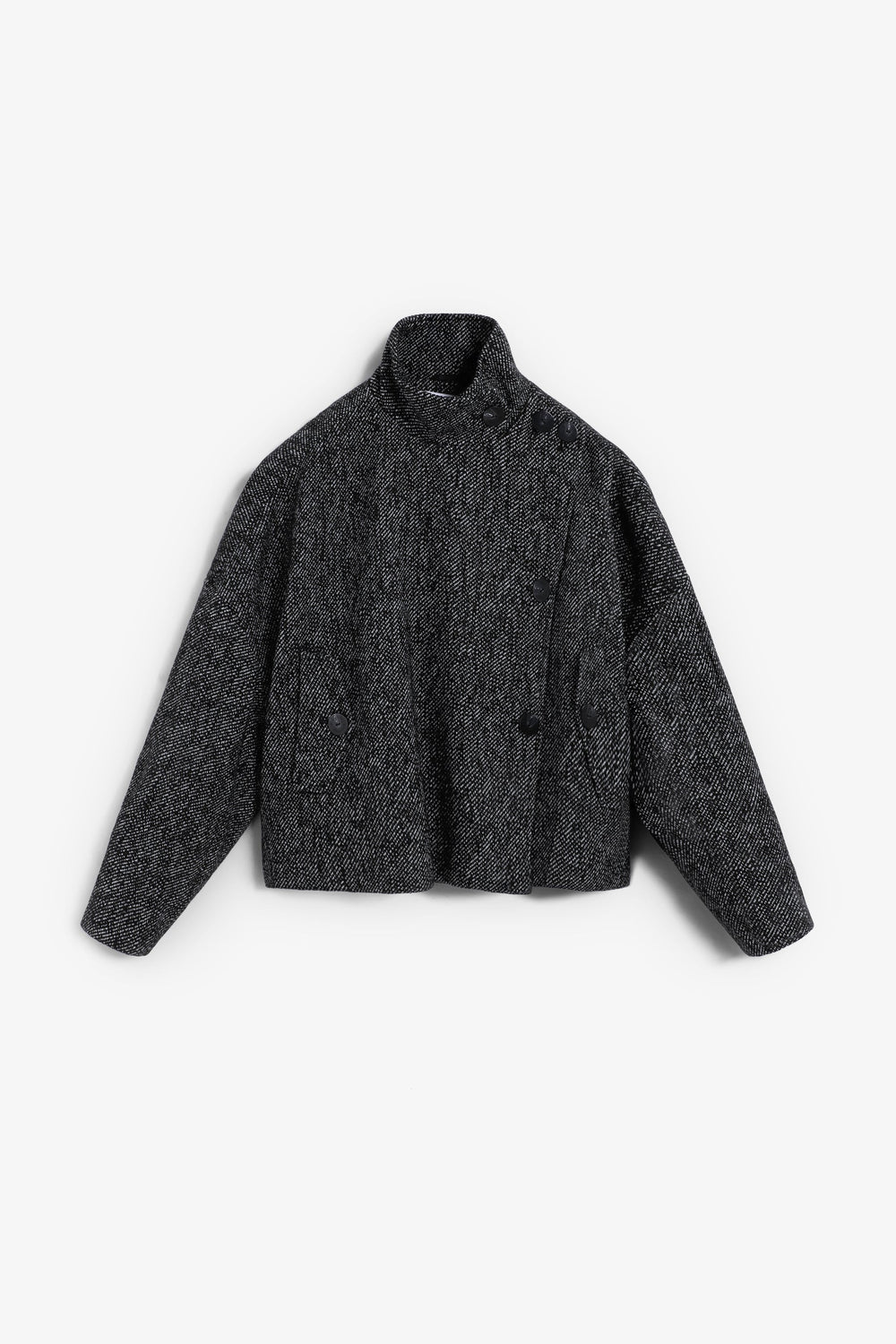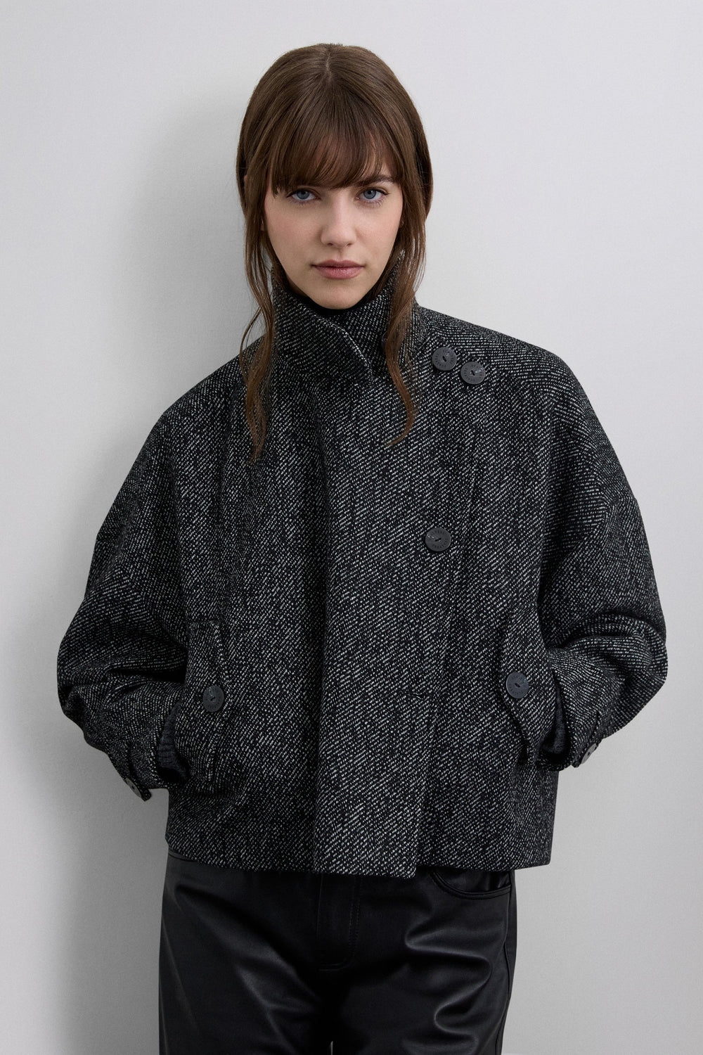 Double-breasted jacket made of a wool blend. Regular fit. Slightly cropped. High collar. Long sleeves. Side slanted flap pockets.