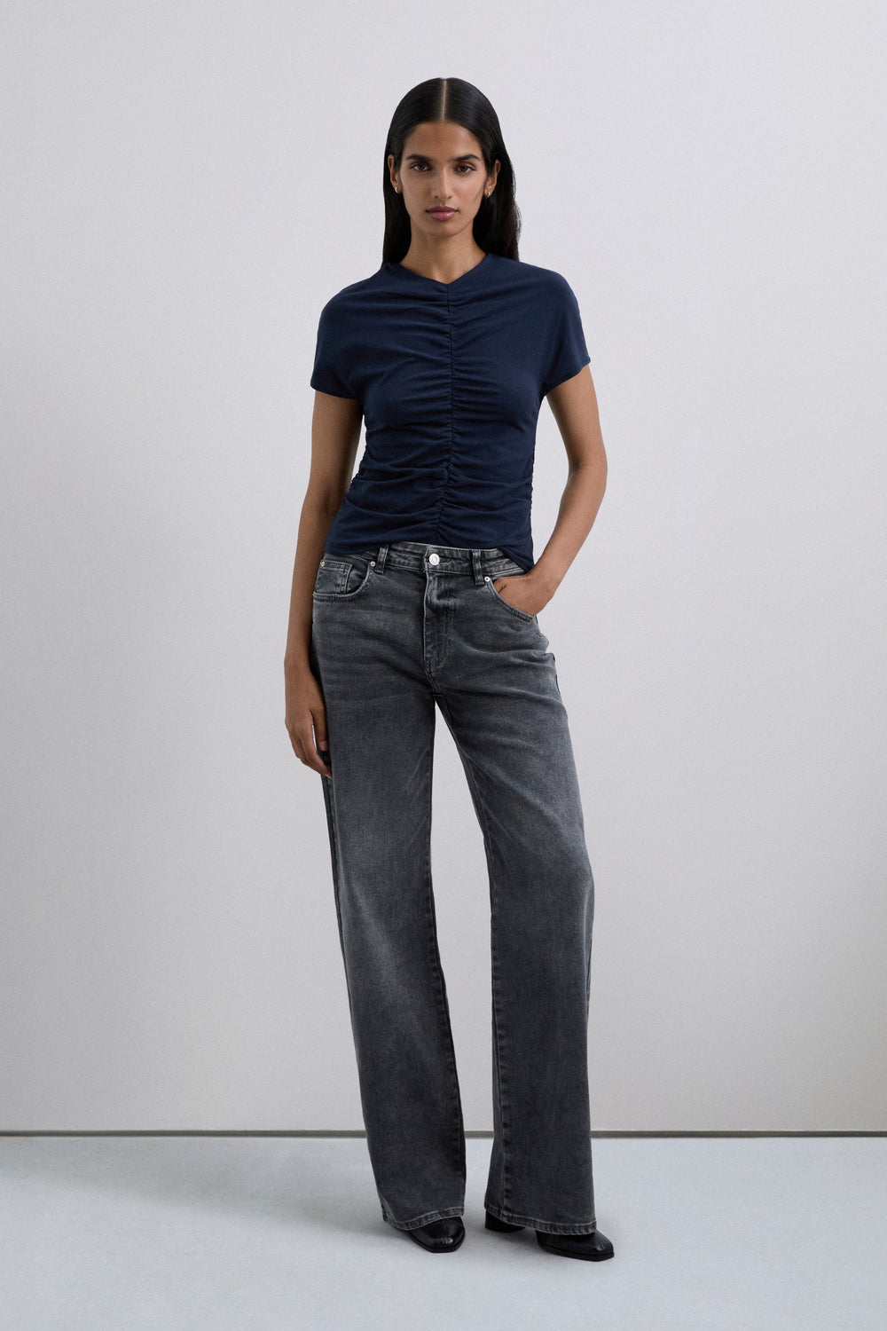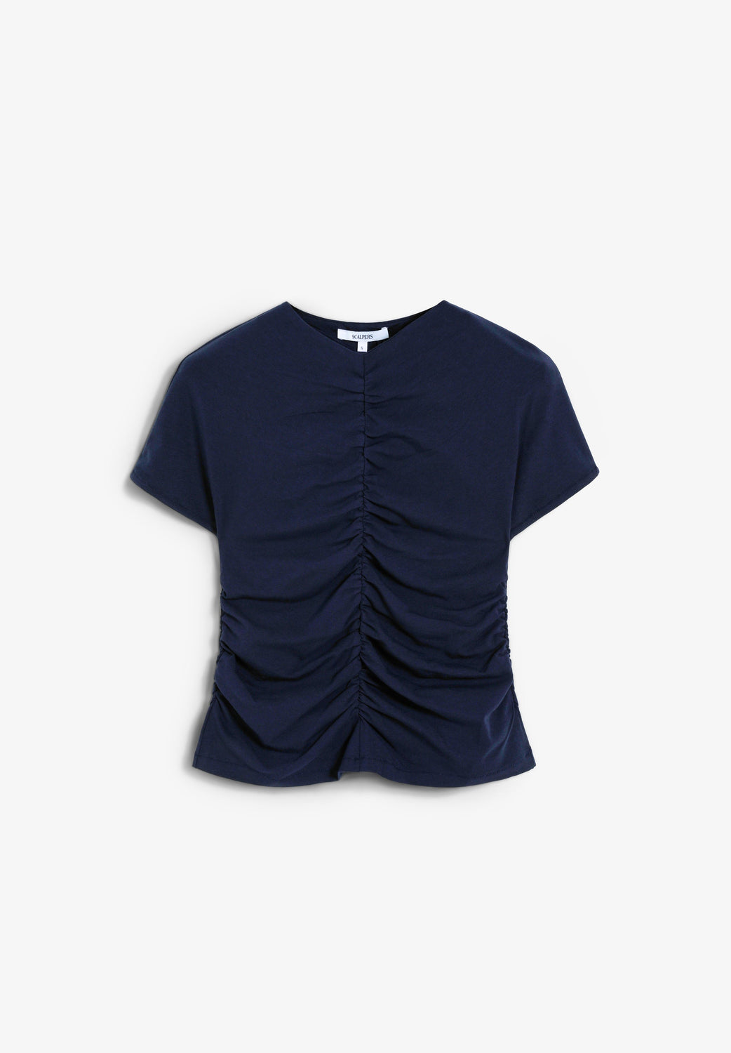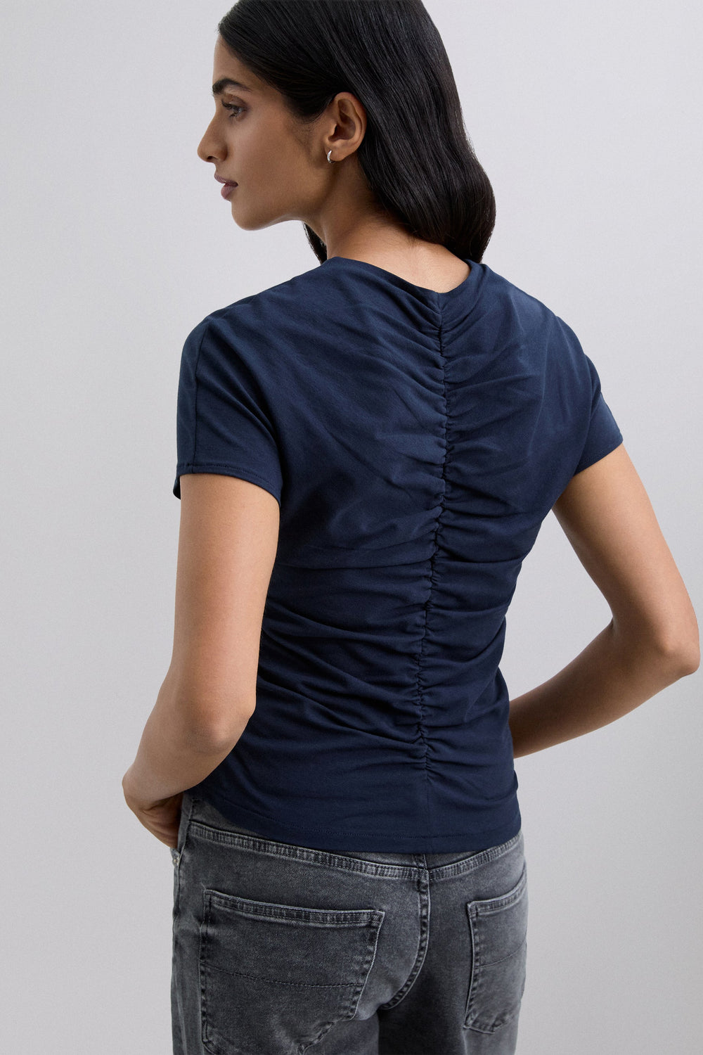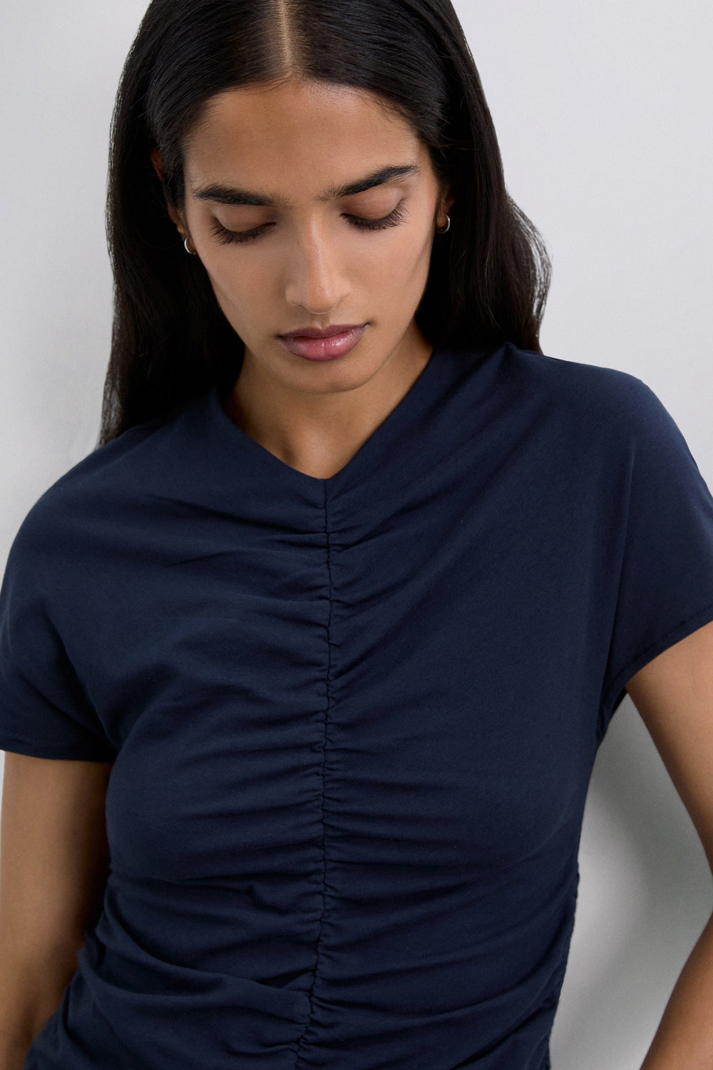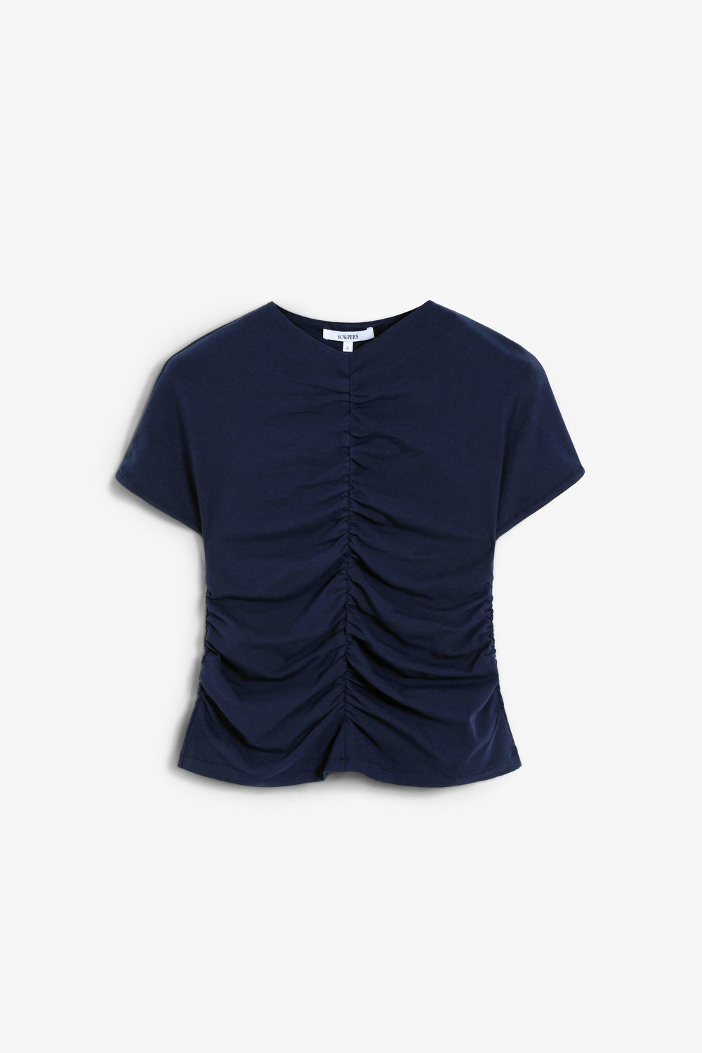 Short sleeve top with gathering at the front and centre of the back. Regular fit. Slightly V-neck.