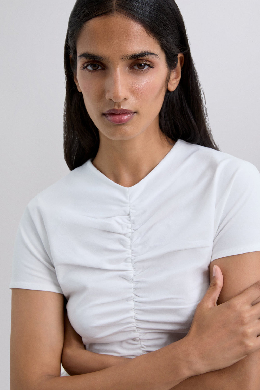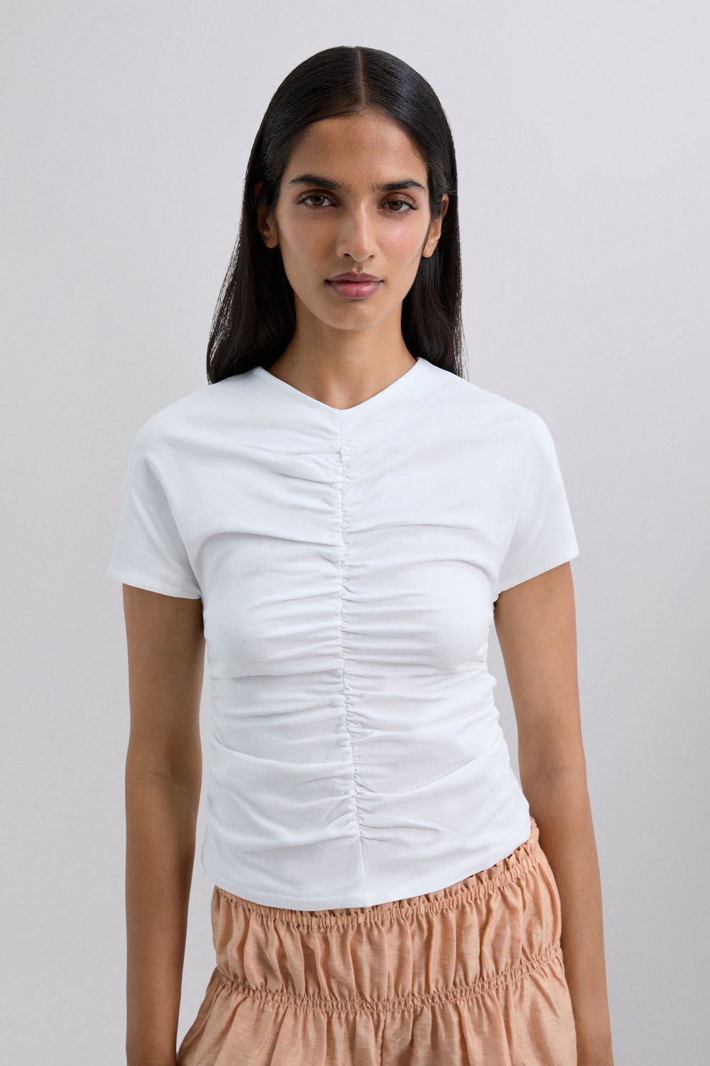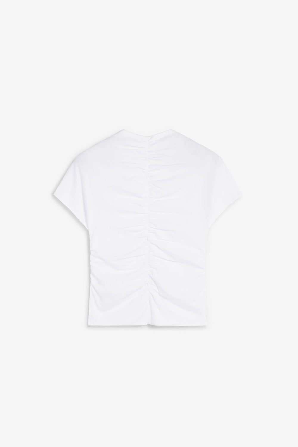 T-shirt made of slightly stretchy cotton fabric. Short sleeves with gathering at the front and back. Slim fit. Slightly V-neck.