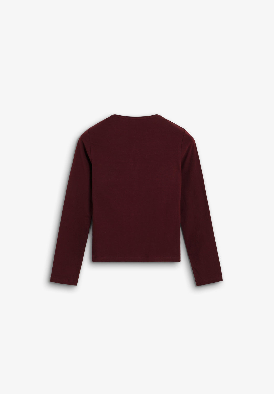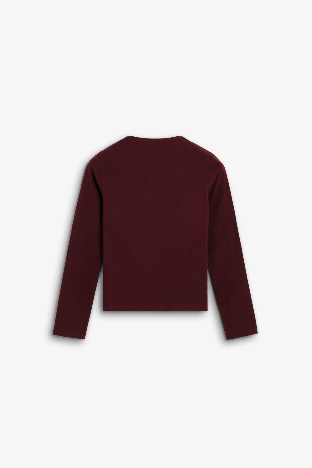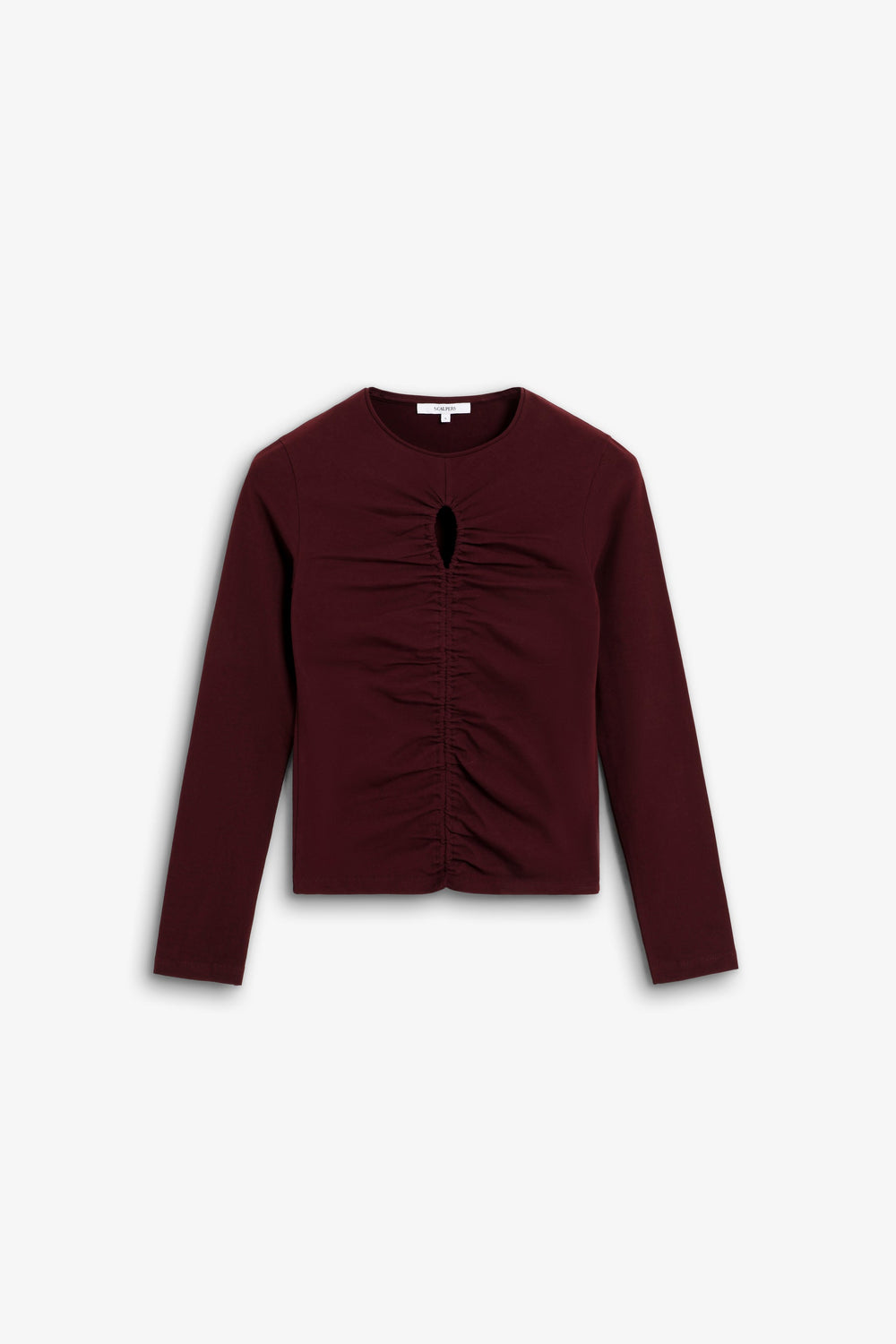 T-shirt made of slightly stretchy cotton fabric. Slim fit, round neck and long sleeves. Opening detail on the neckline and front gathers.