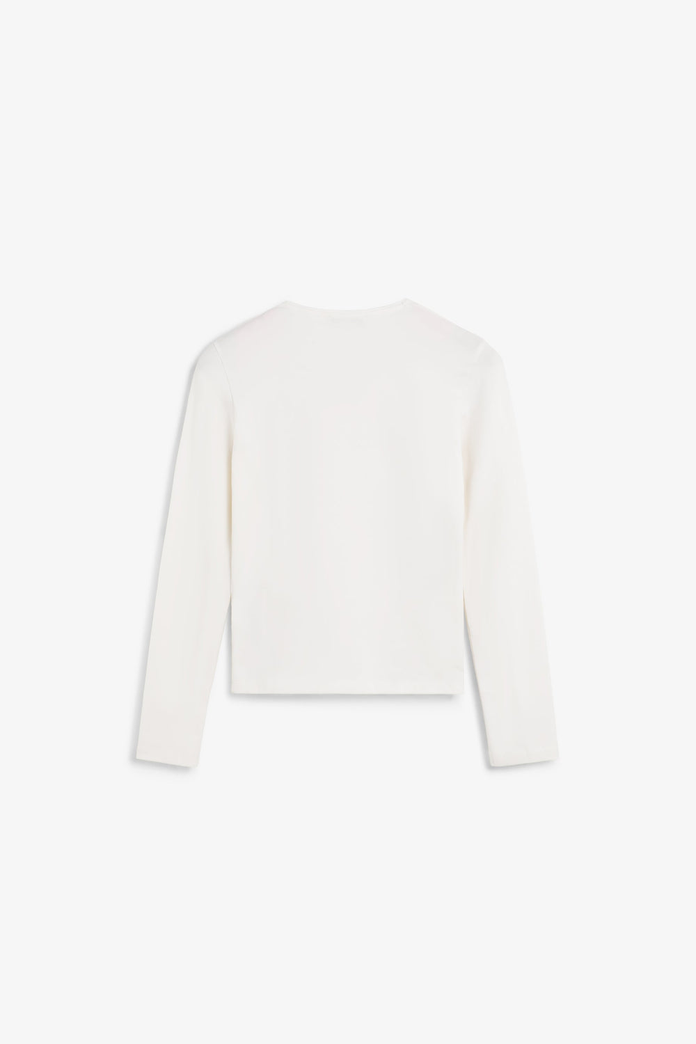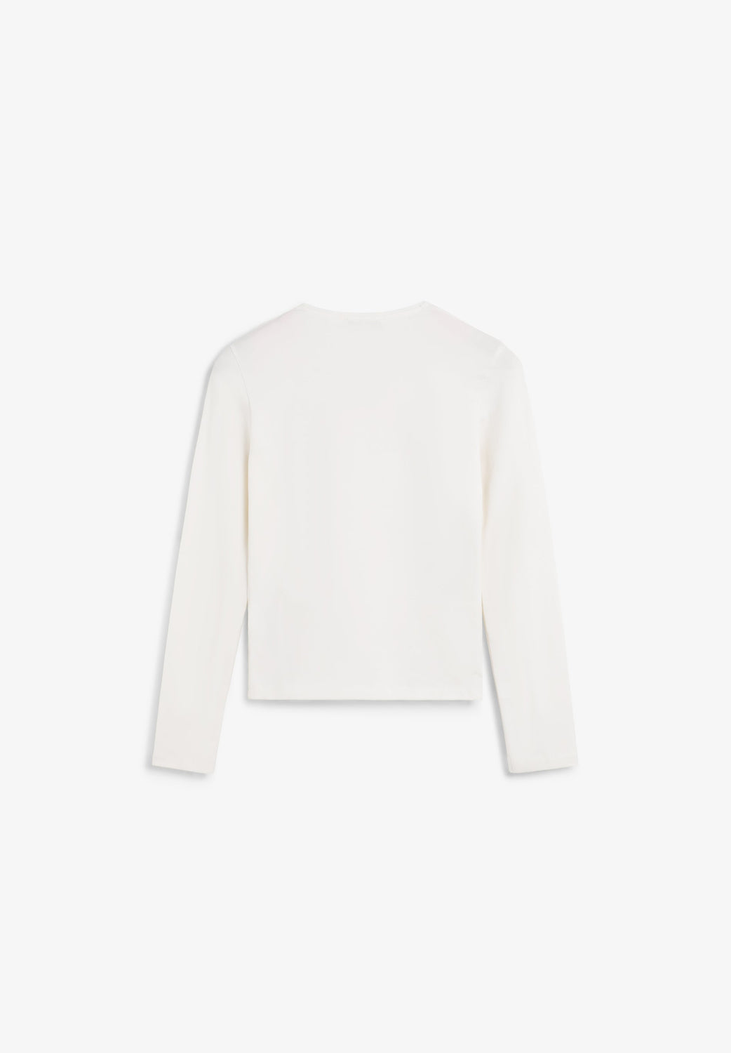 T-shirt made of slightly stretchy cotton fabric. Slim fit, round neck and long sleeves. Opening detail on the neckline and front gathers.