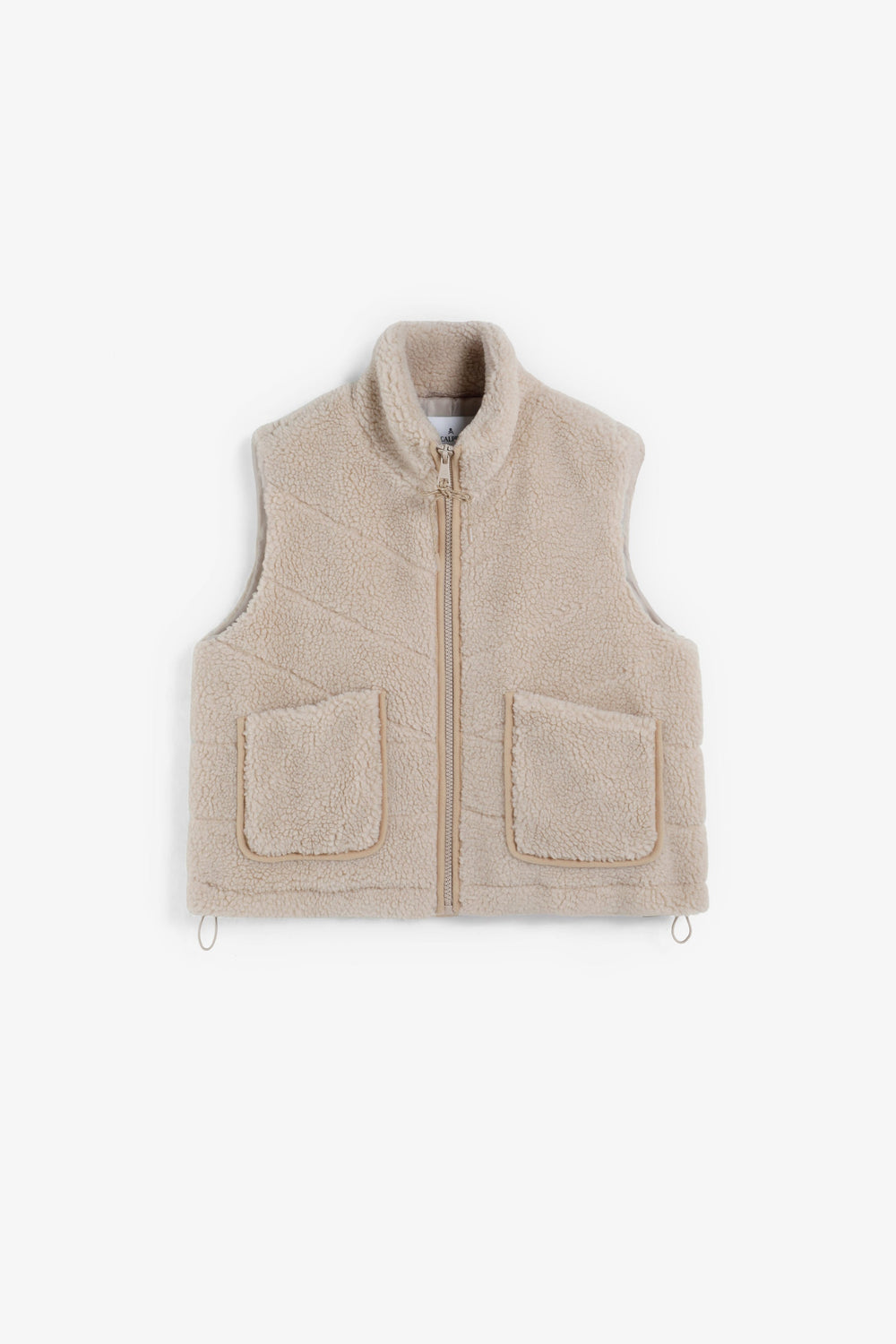 Fitted fleece gilet. Slim fit. Two front pockets. Adjustable drawstring hem. High collar. Front zip fastening.