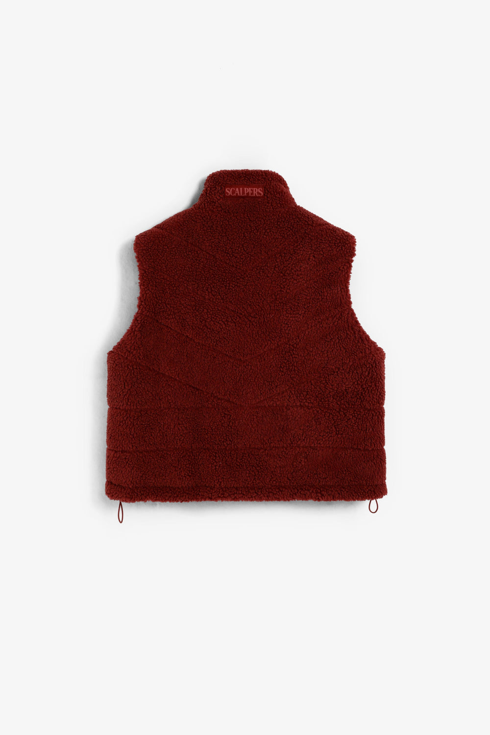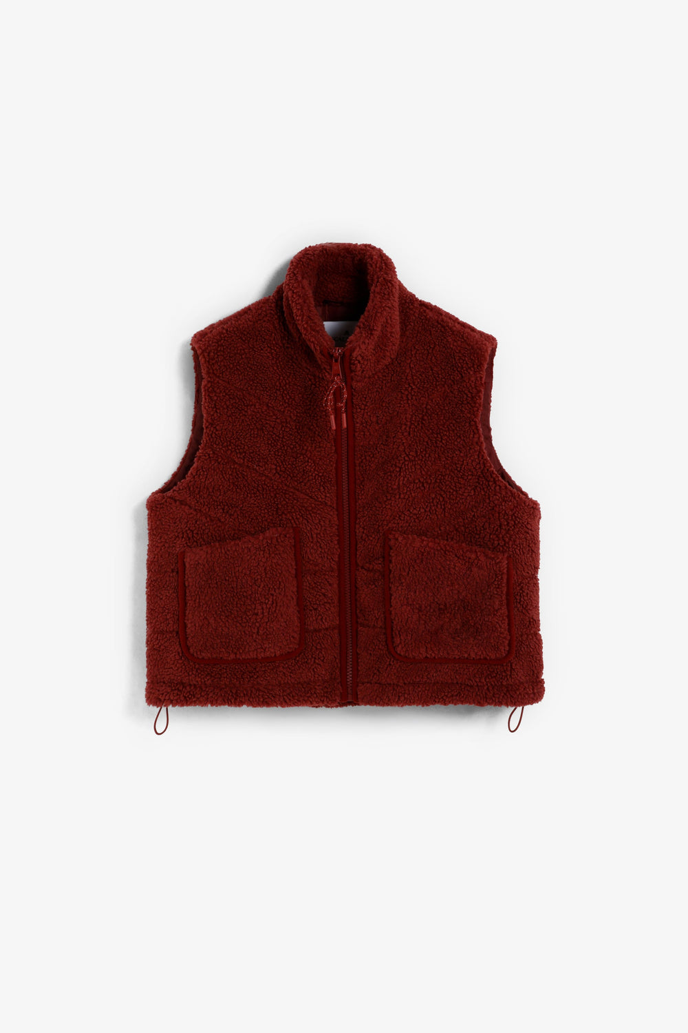 Fitted fleece gilet. Slim fit. Two front pockets. Adjustable drawstring hem. High collar. Front zip fastening.