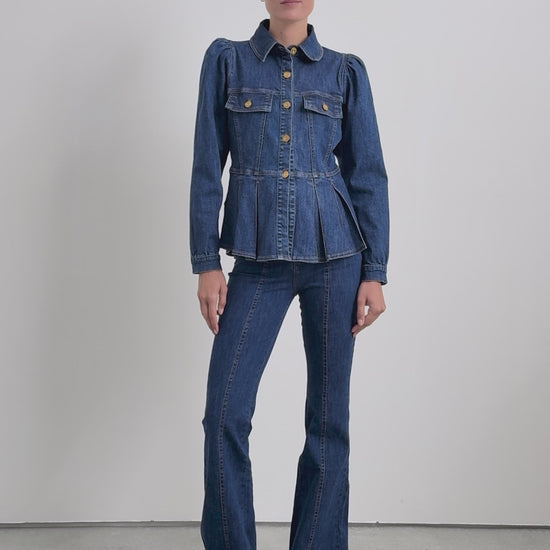 Denim shirt made of slightly stretchy cotton. Slim fit, button fastenings and long puff sleeves with buttons. Box pleat detail on the hem and gathers on the shoulders.