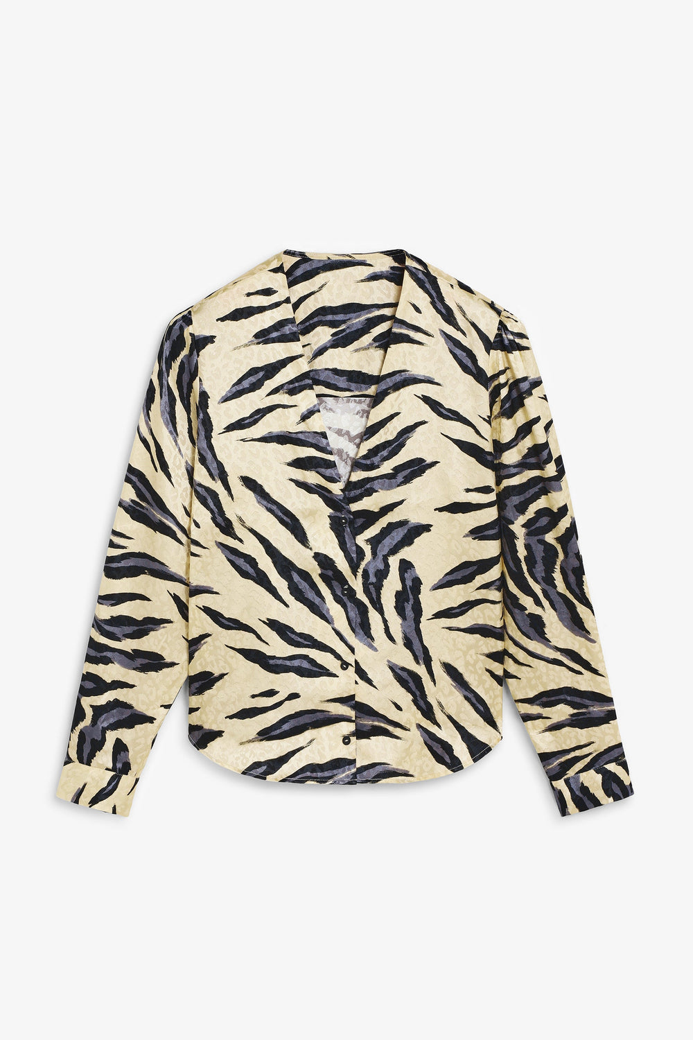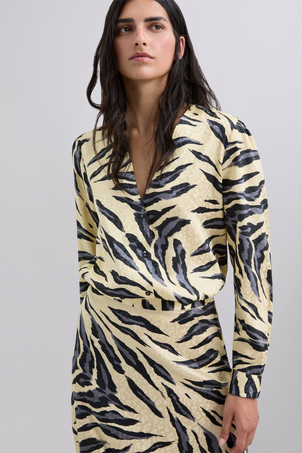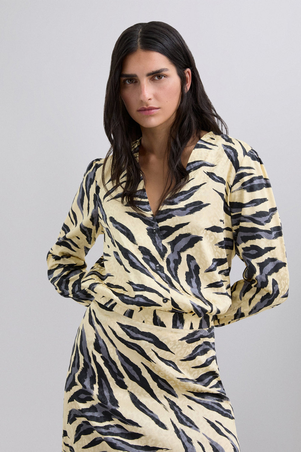 Blouse made from flowing satin fabric with animal print. Regular fit, V-neckline and button fastening. Long lightly puffed sleeves with cuffs.