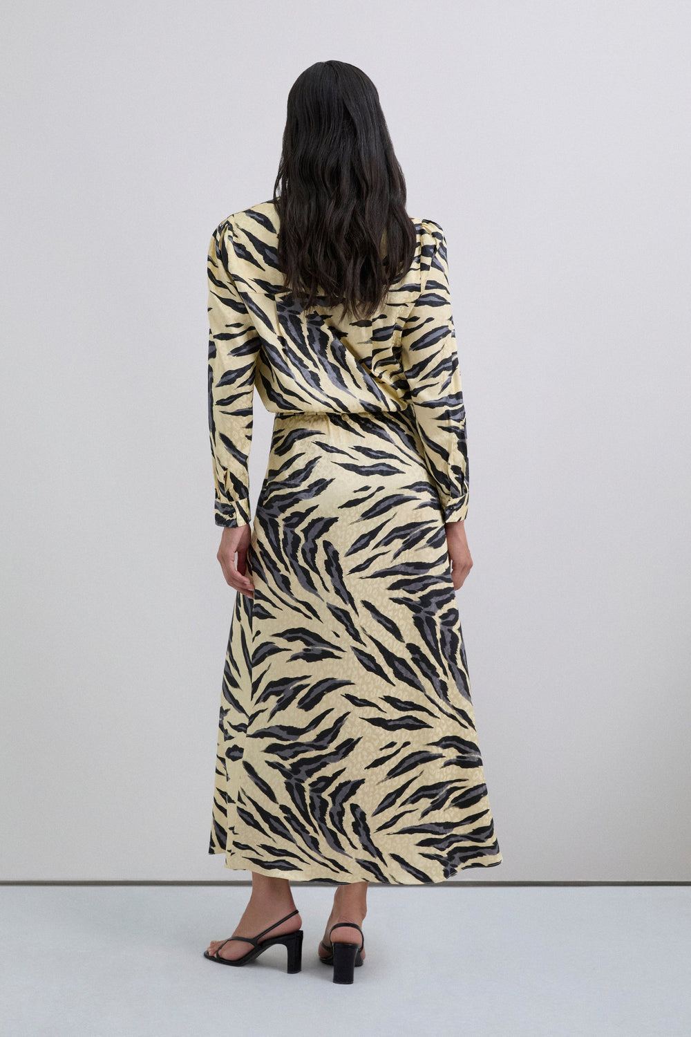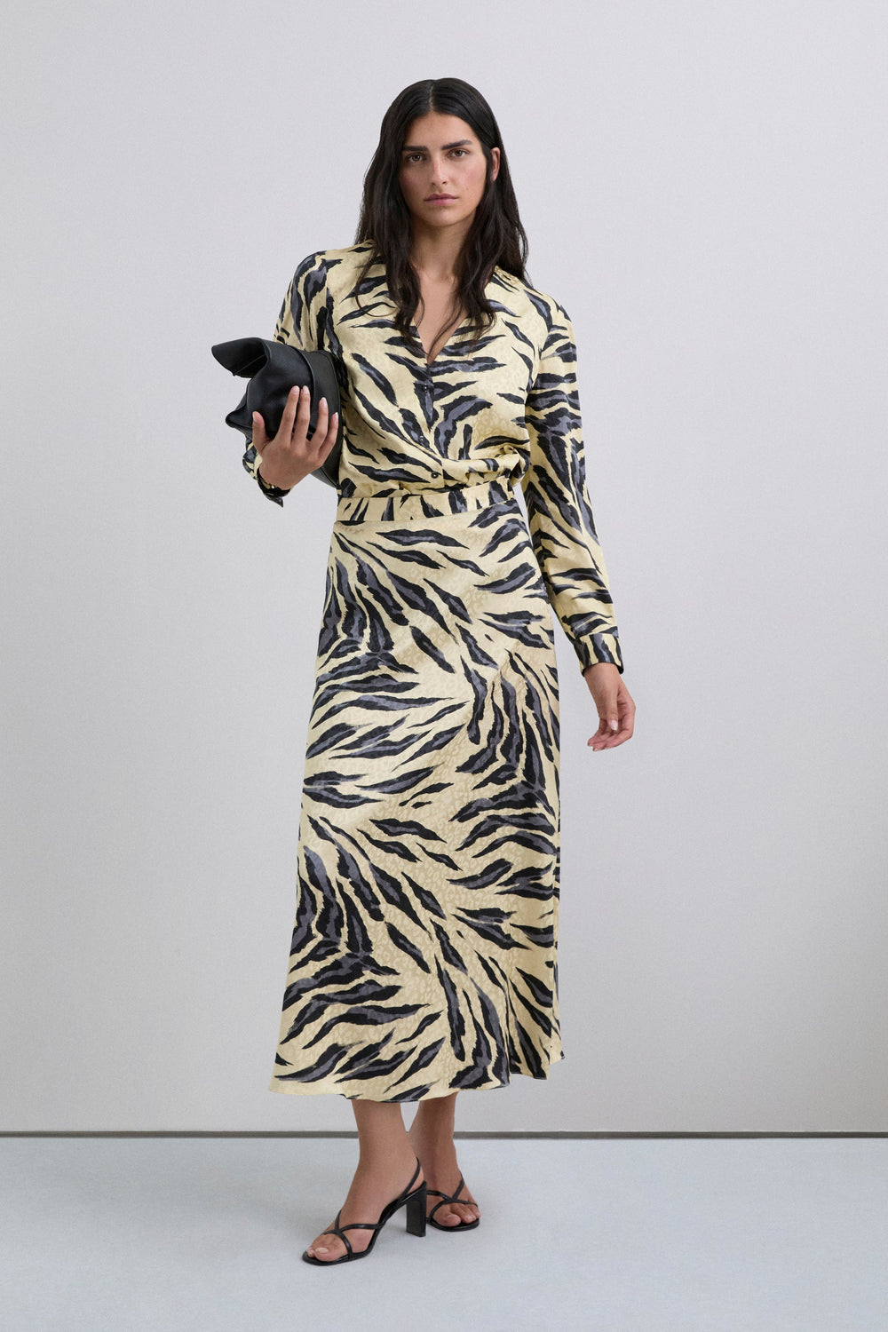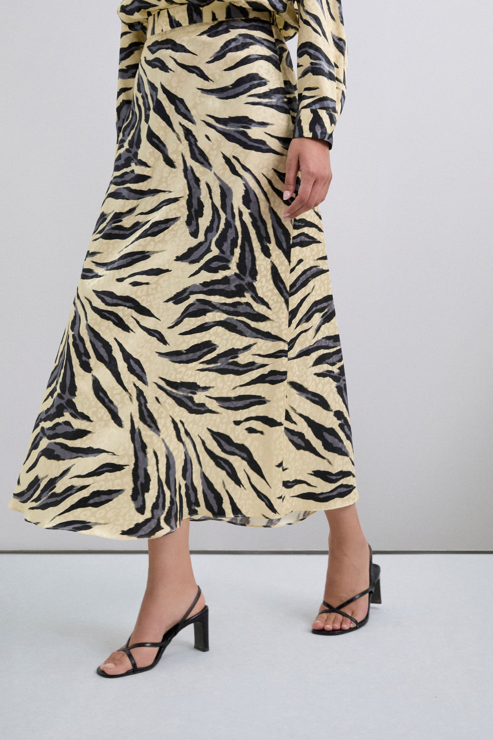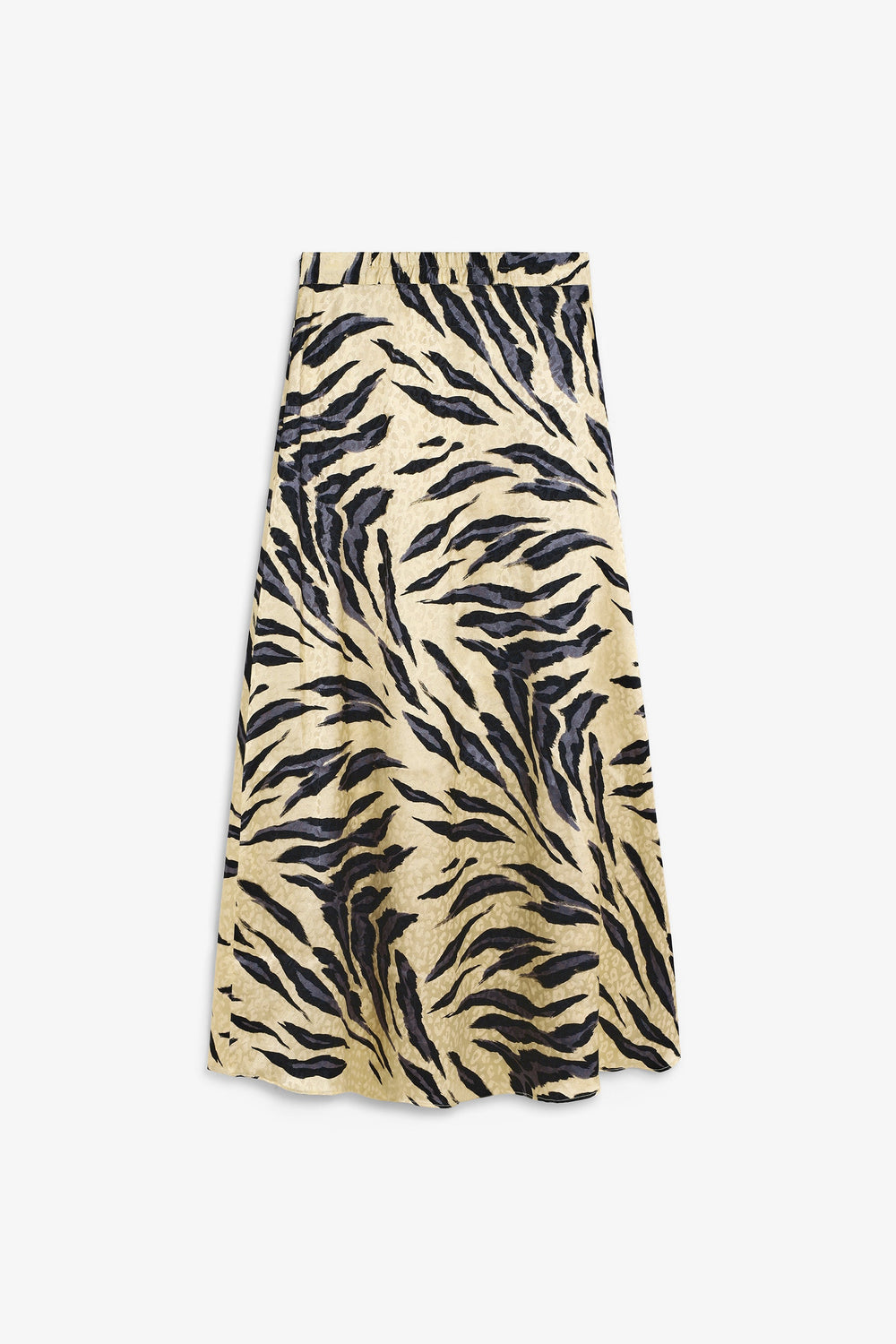 Midi skirt. Animal print. Elastic waistband. Waved hemline.