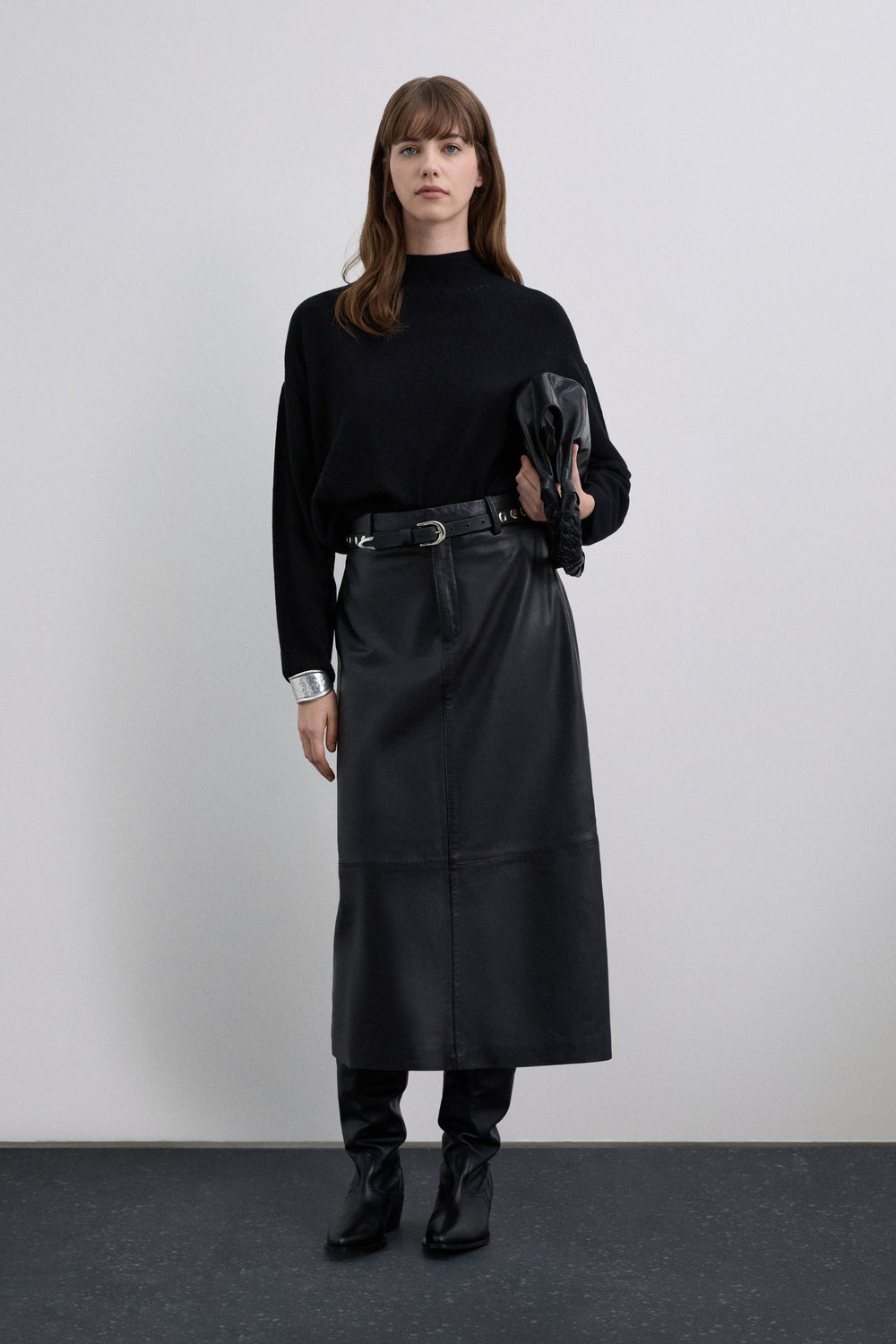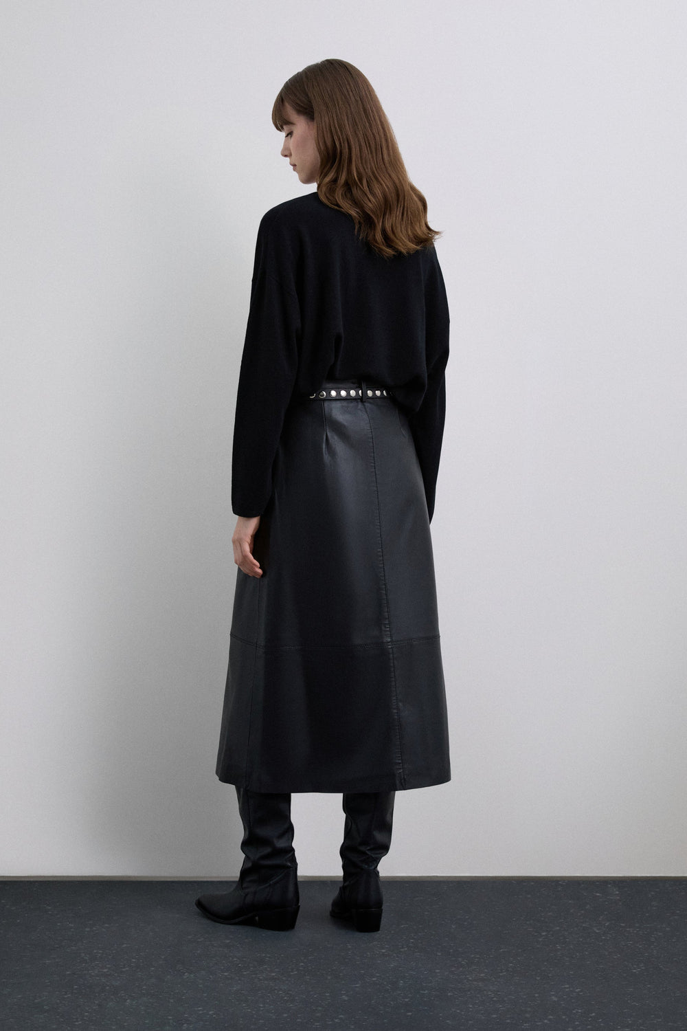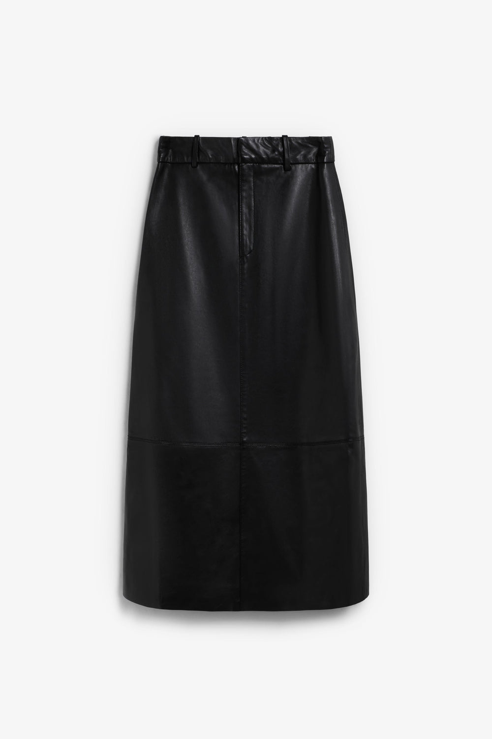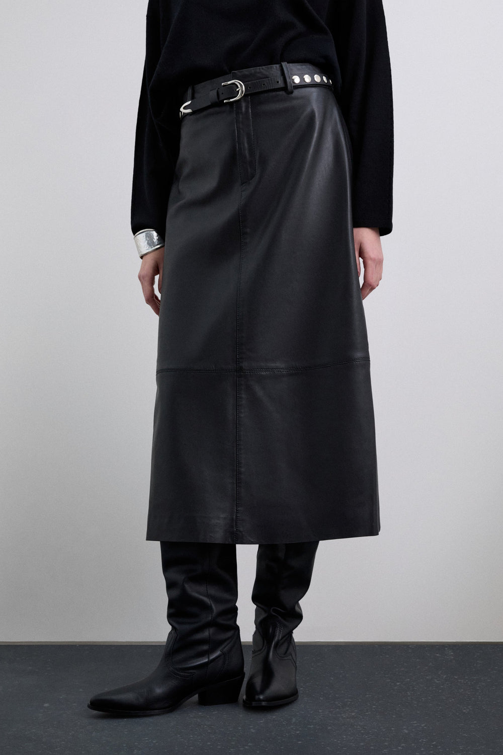 Midi skirt made of leather. Front zip and button fastening. Belt loops. Seams detail.