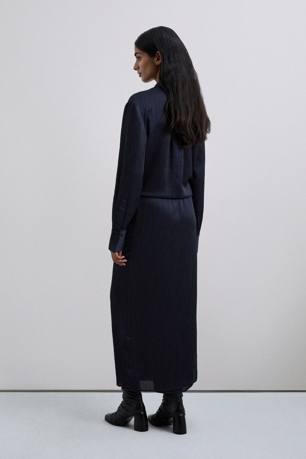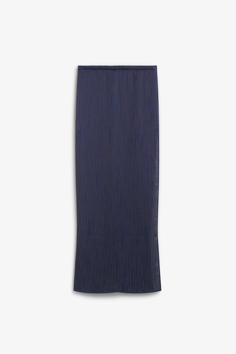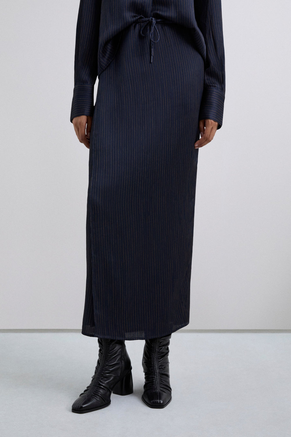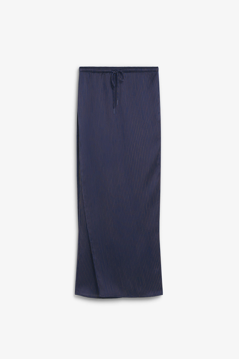 Long pinstripe skirt. Elastic waistband with adjustable drawstring Straight cut with side slit