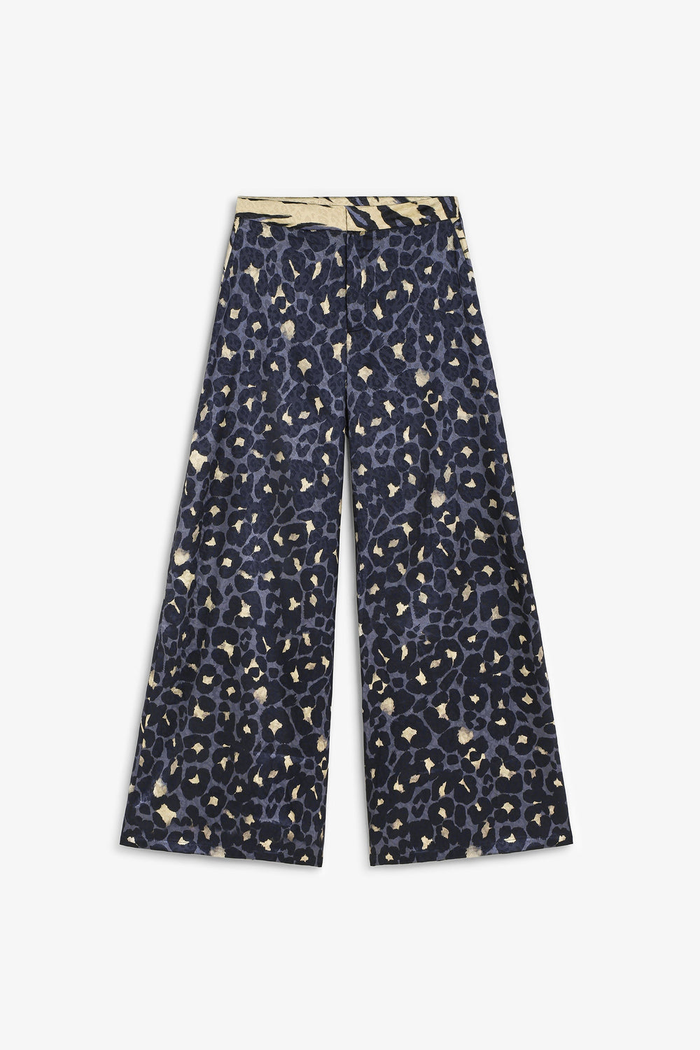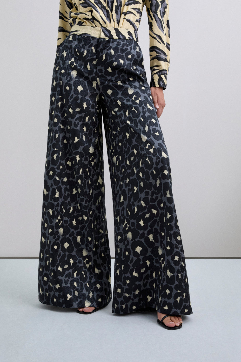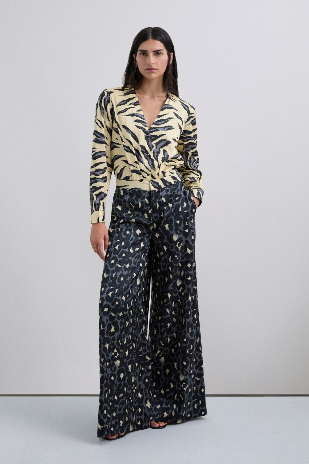 Flowing trousers. Zip fastening concealed by a placket with hook and button. Elastic waistband. Two side pockets. Animal print. Flowing fabric with satin finish.