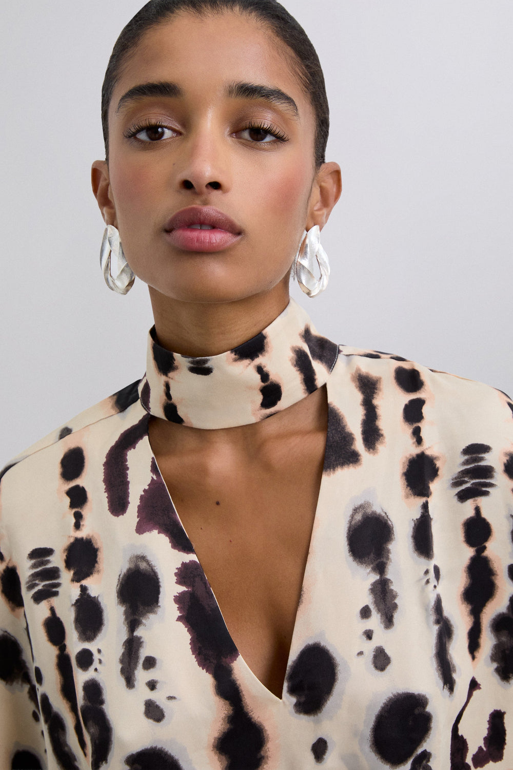 Satin shirt with short sleeves and collar detail. V-neck with choker. Flowing printed shirt.