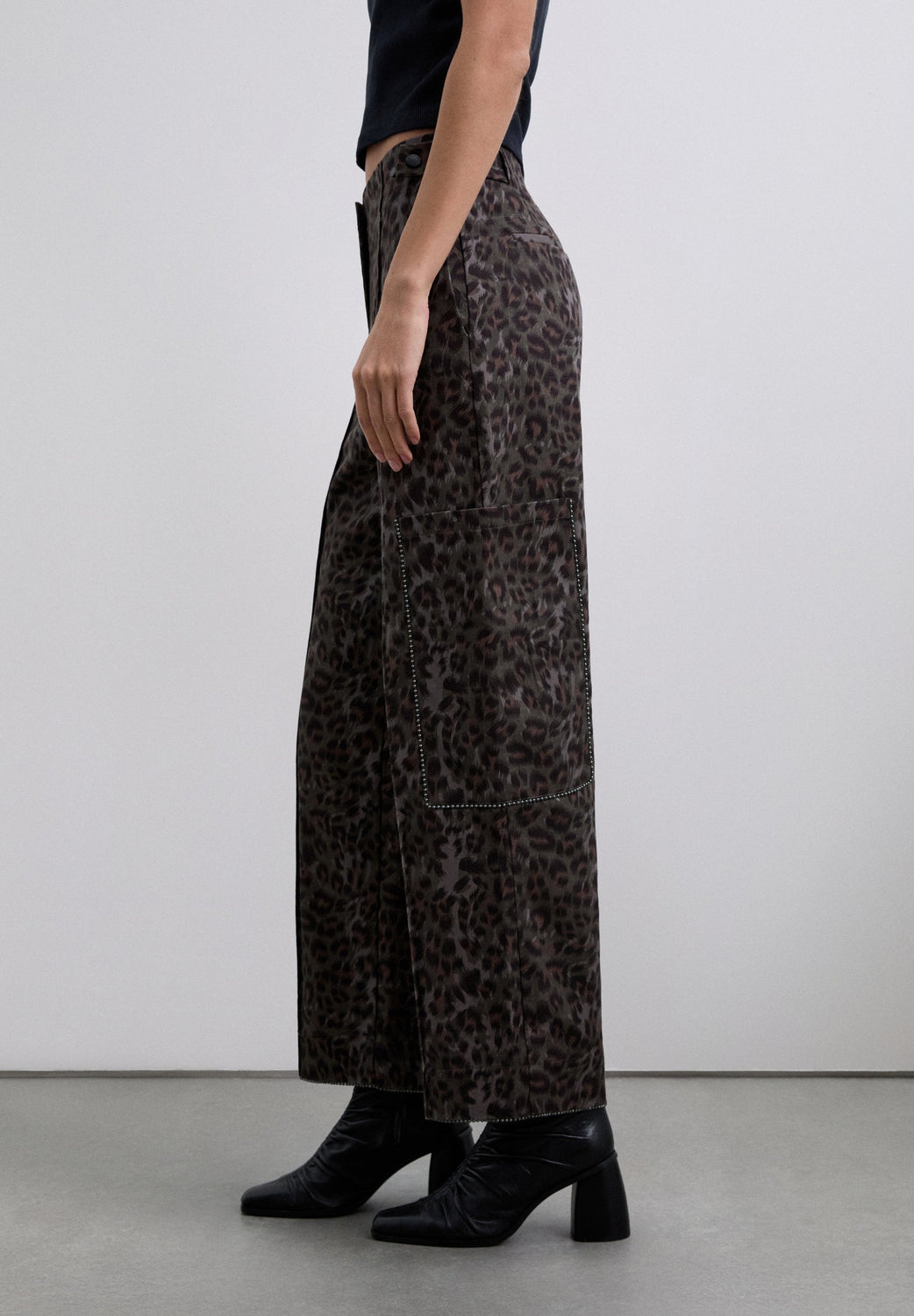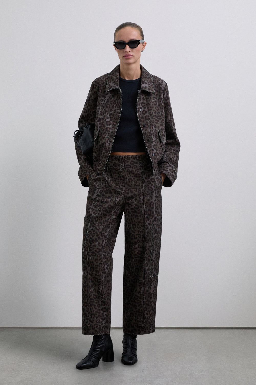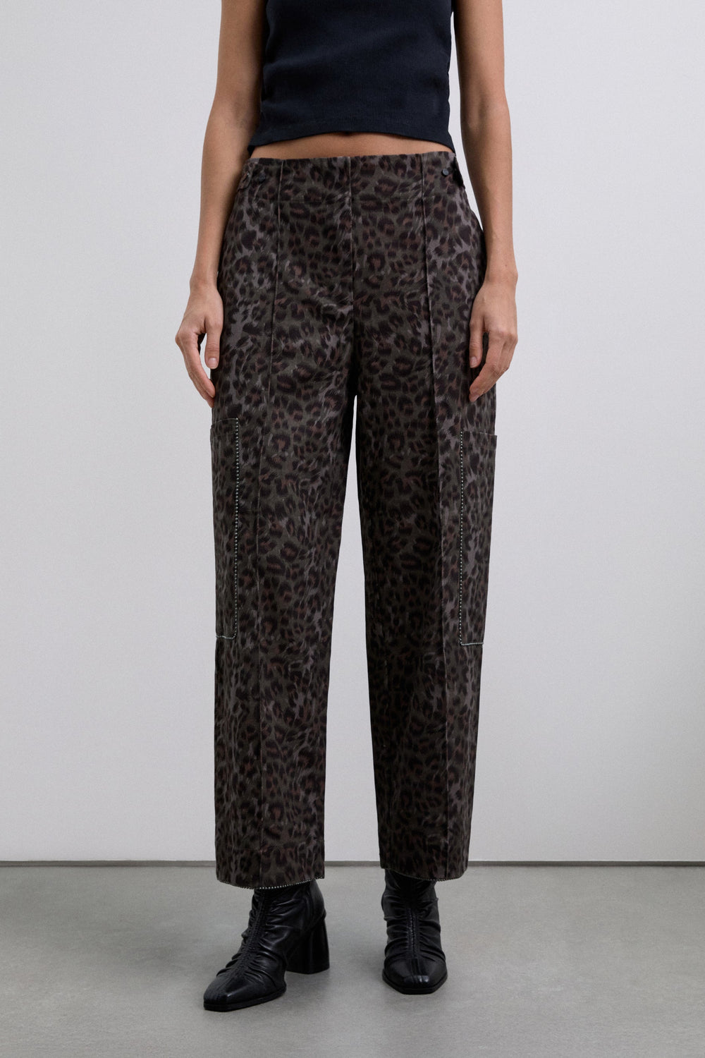Animal print trousers. Side zip fastening. Cargo style pockets at the sides. Details on the main seams. Adjustable hip buttons.