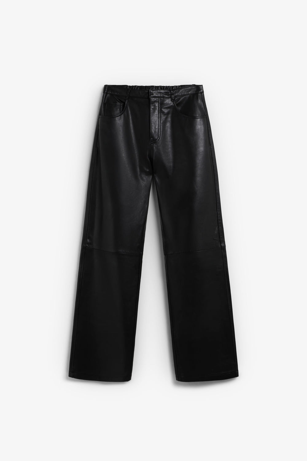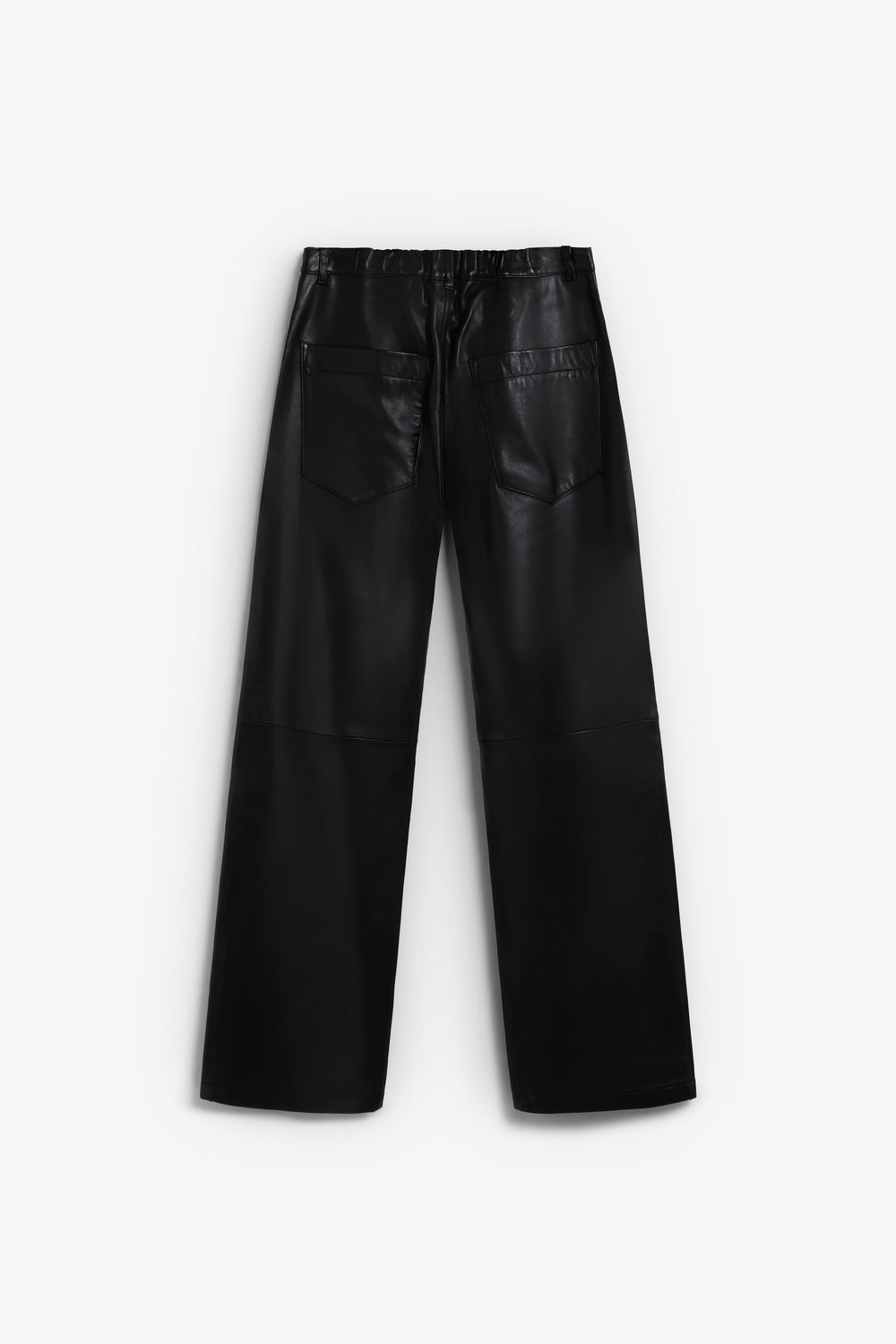 High-waist trousers made of 100% leather. Wide leg. Zip fastening and front and back pockets. Mid-leg seam detail.