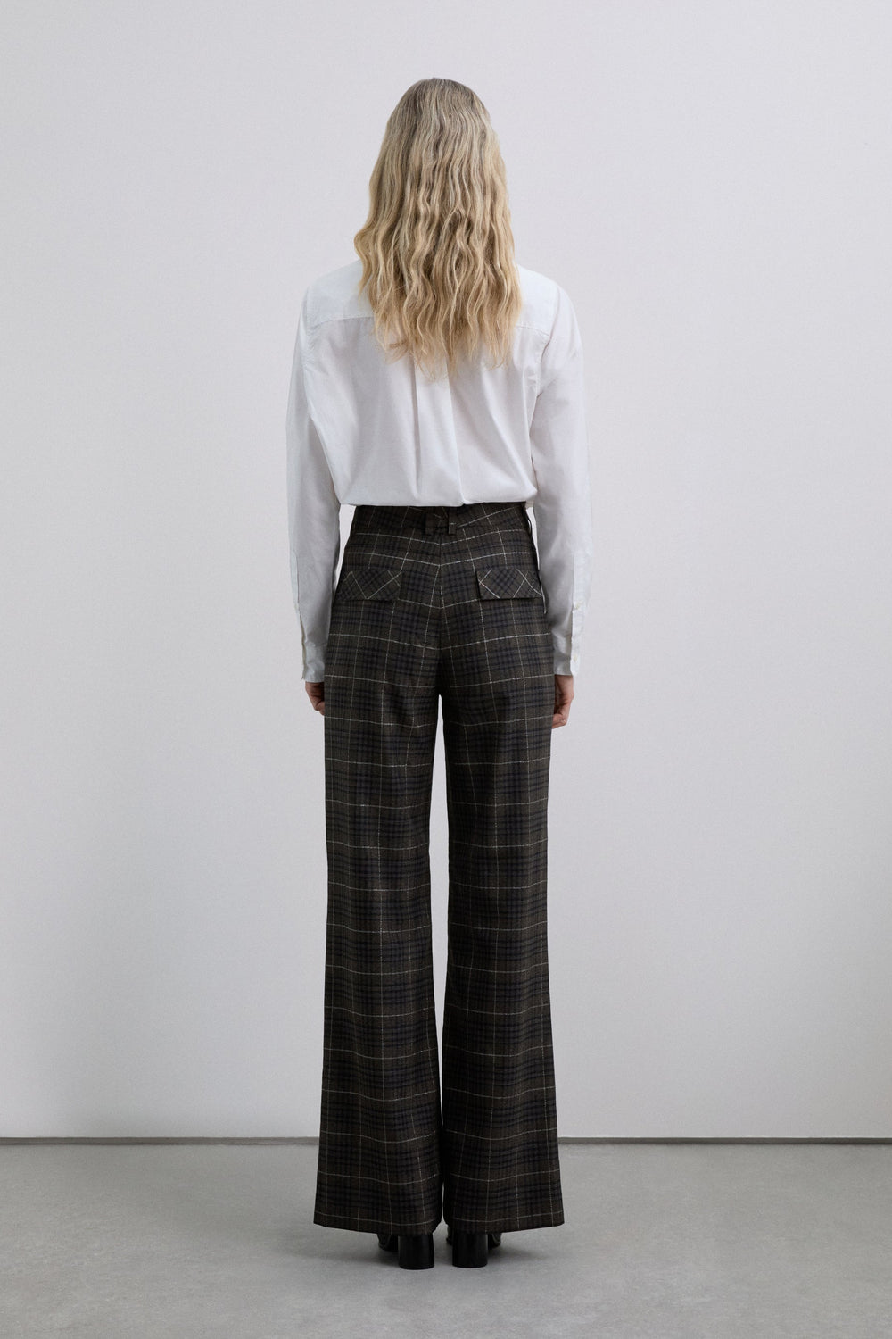 Straight jeans. Front zip and button fastening. Two flap pockets at the back. Belt loops at the waist. Check print.