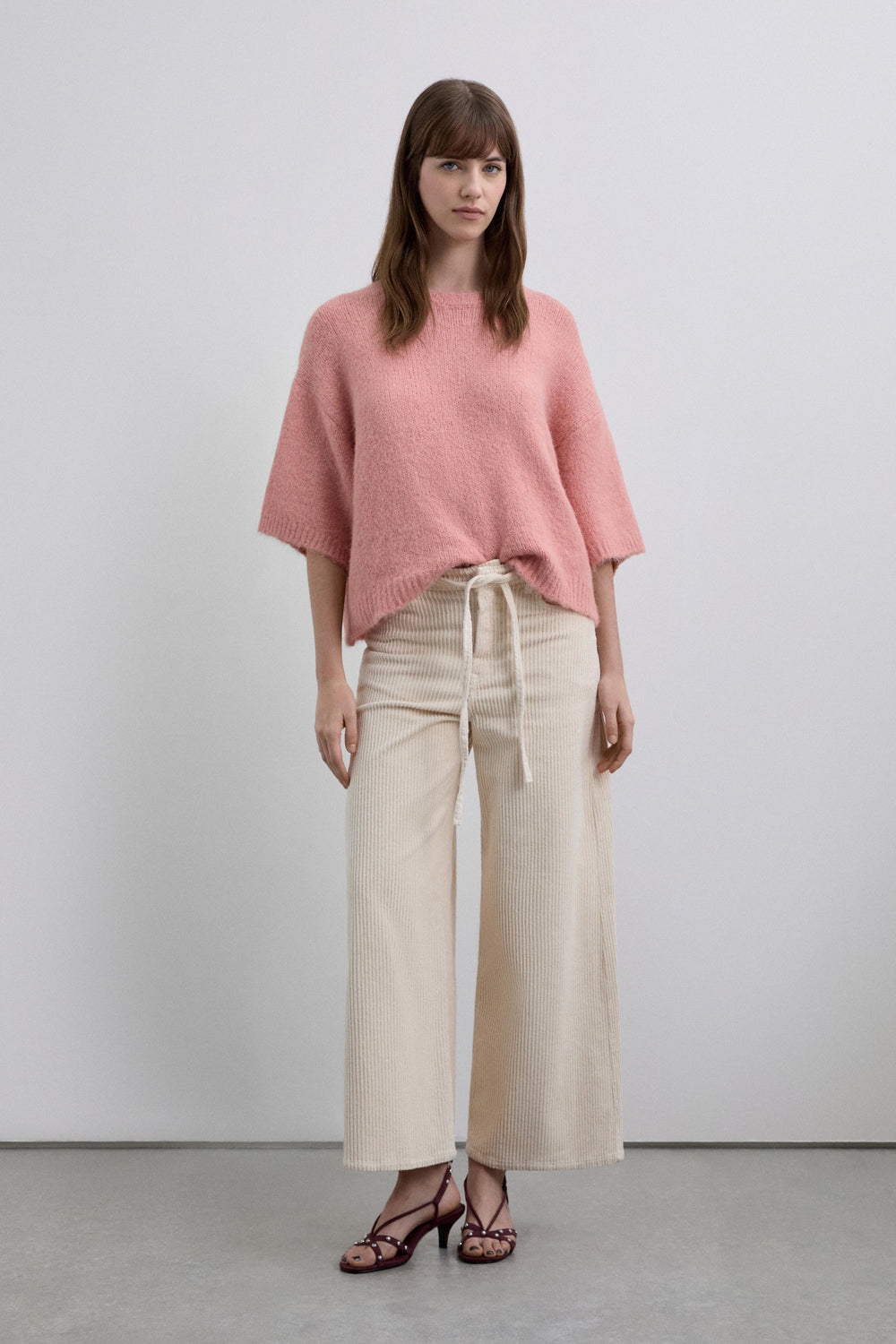 Trousers made of BCI cotton. Full length. Corduroy effect. Matching drawstring waist. Side and back pockets.