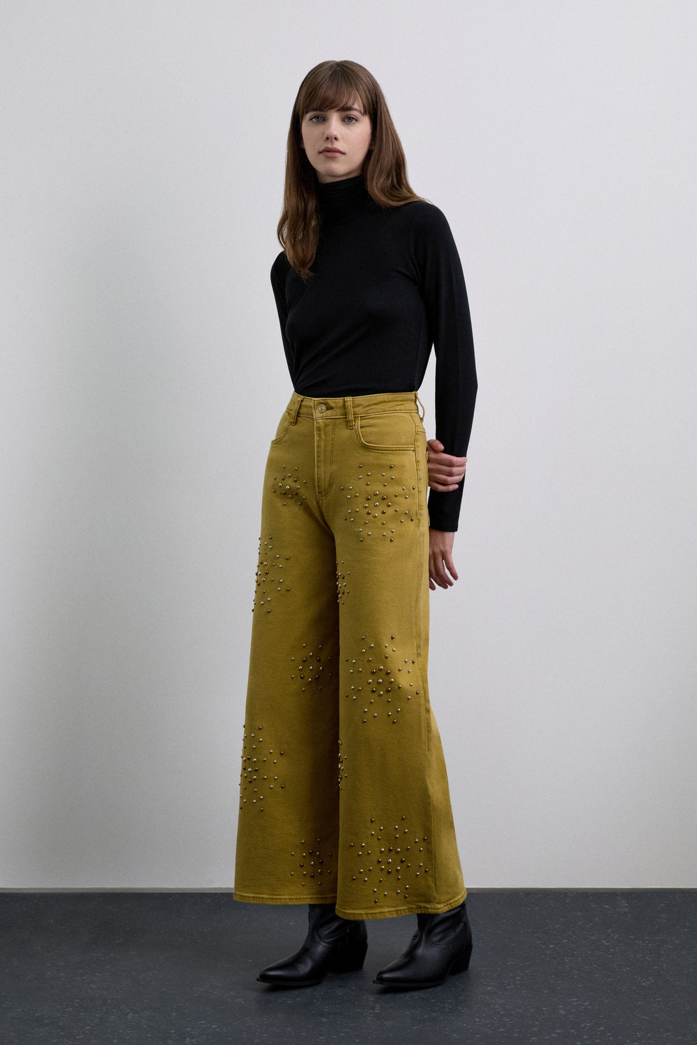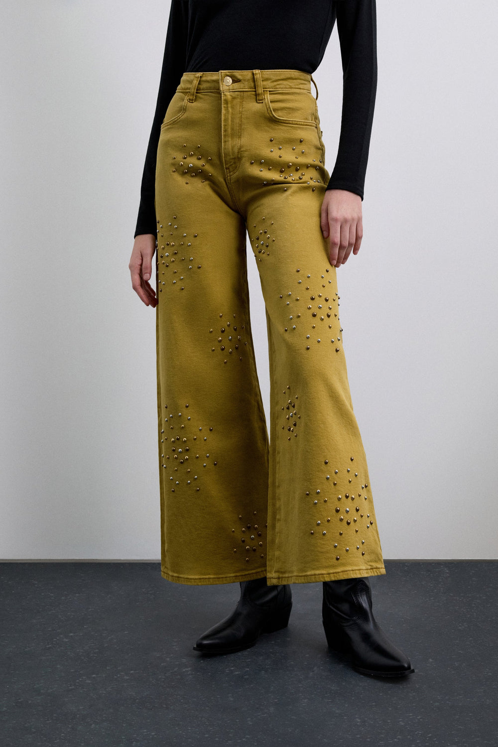 Jeans made of cotton and elastane. Stud detailing on the front. Culottes with high waist and zip and button fastening. Front and back pockets.