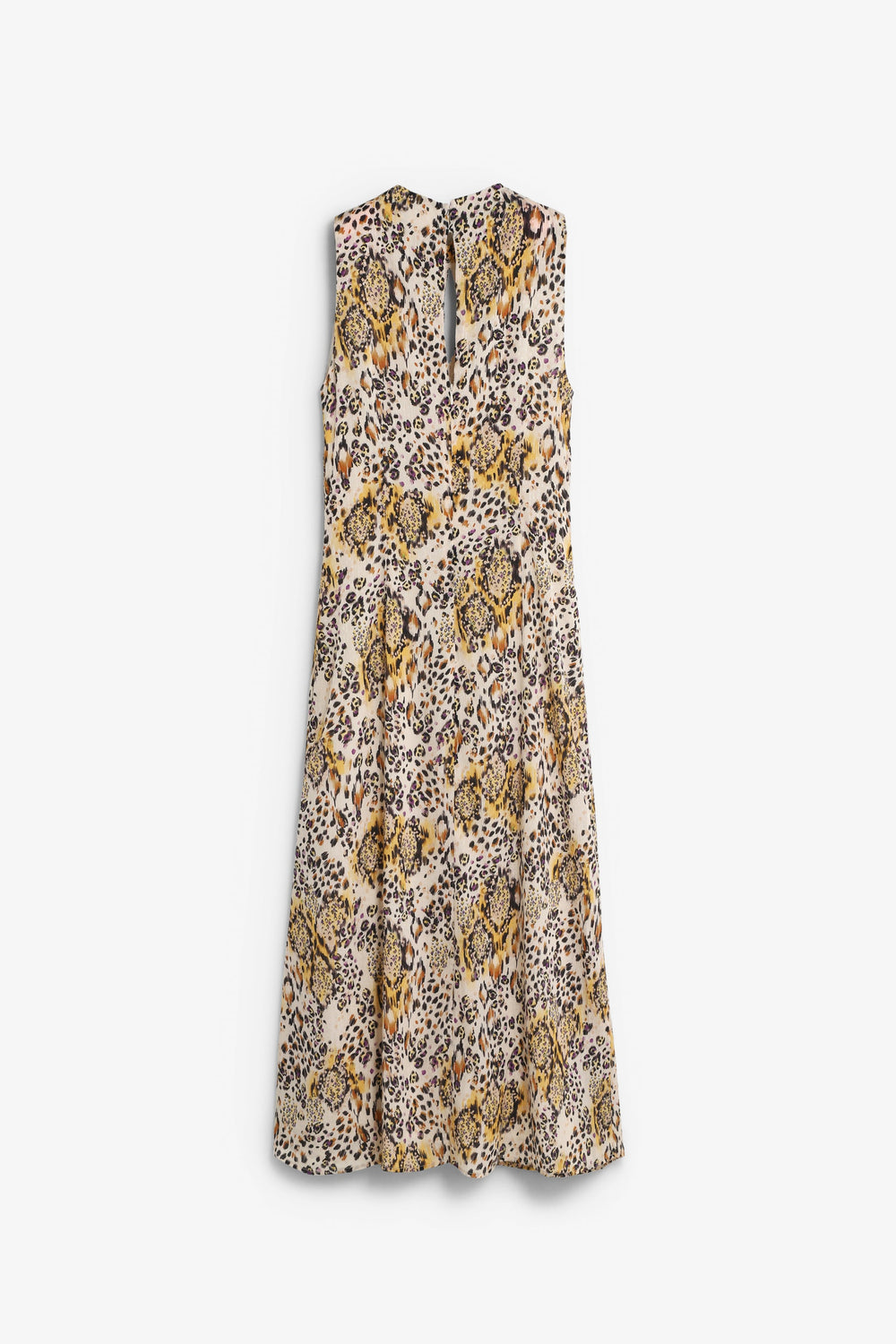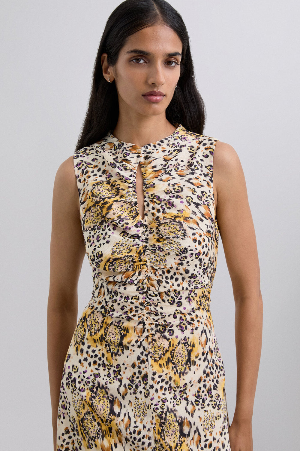 Long flowing animal print dress. Regular fit. Cutaway and gathered at the front with front slit. Sleeveless design.