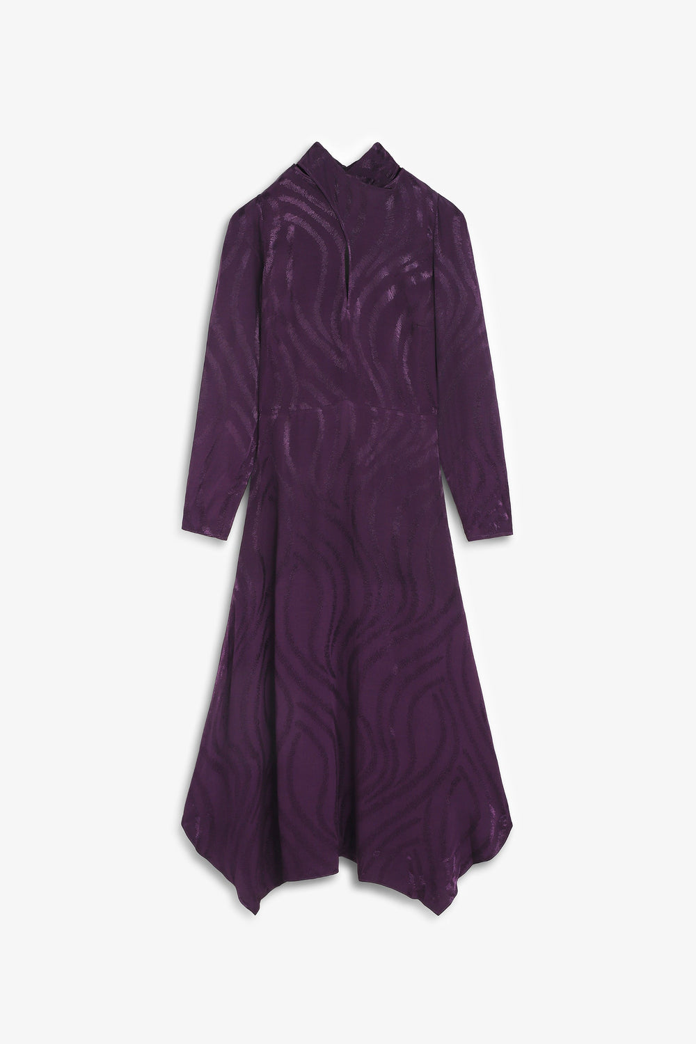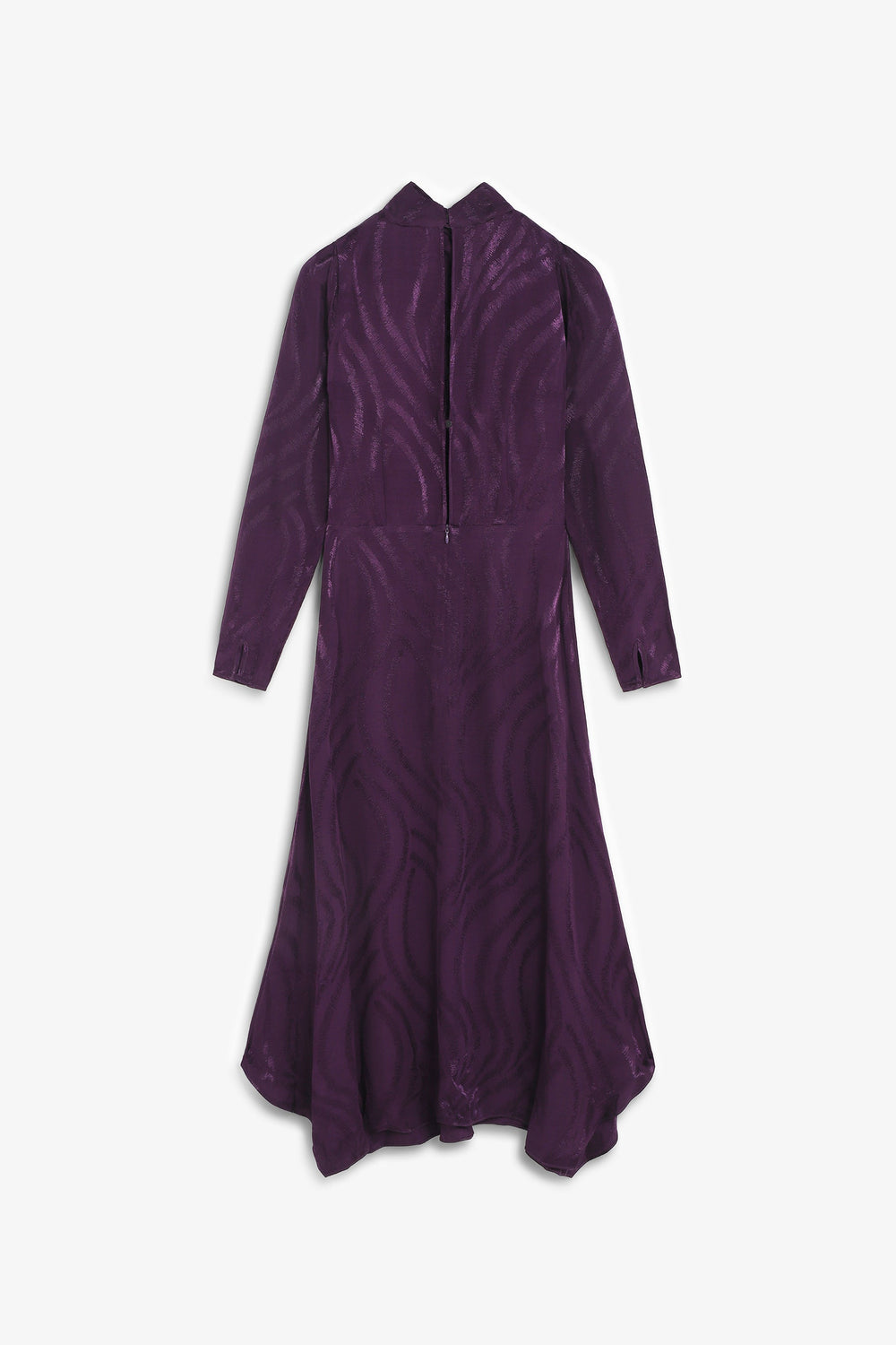 Long dress with embossed wavy design. Flowing design with uneven asymmetrical hem. Long sleeves. High closed neckline. Back fastening with invisible zip.