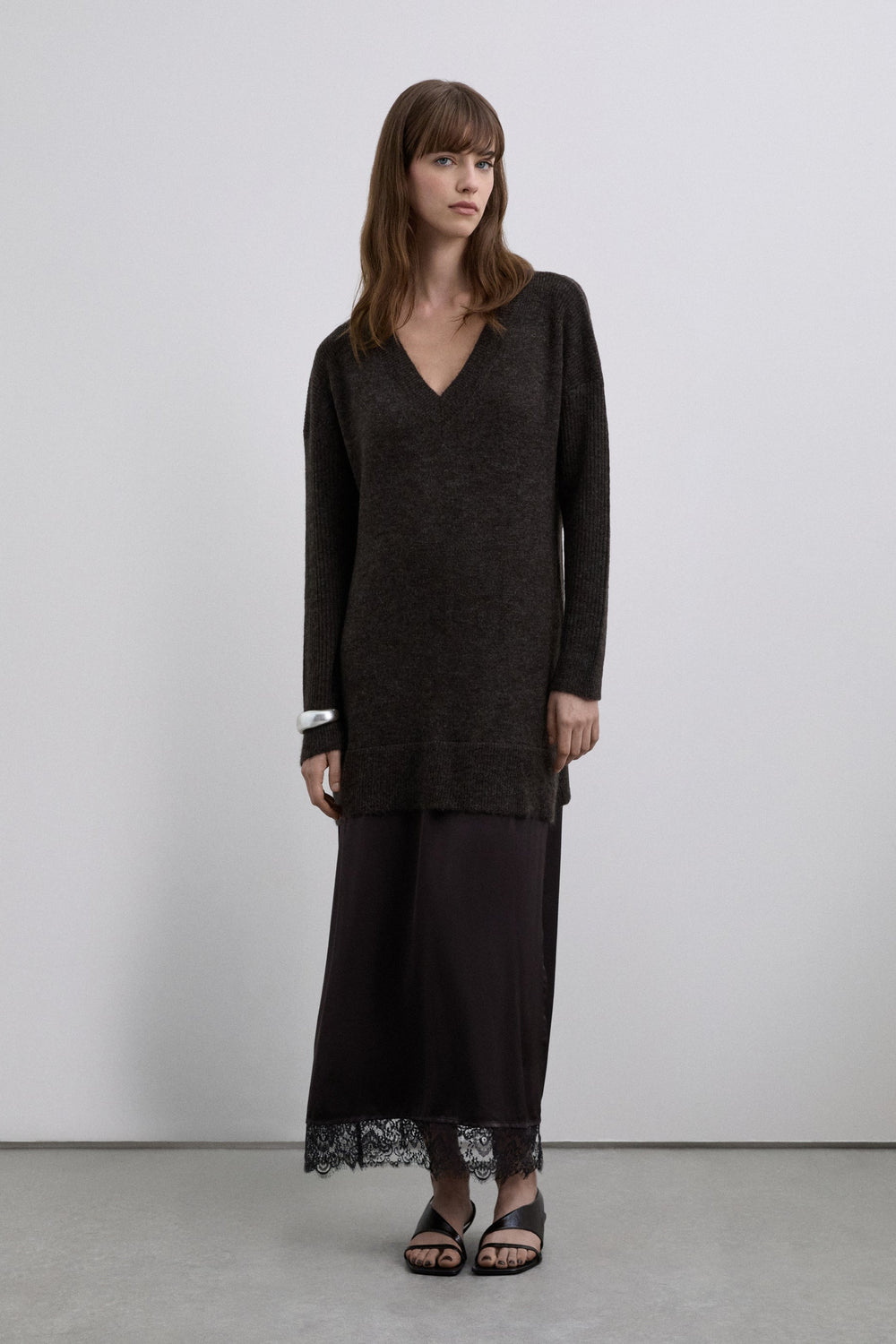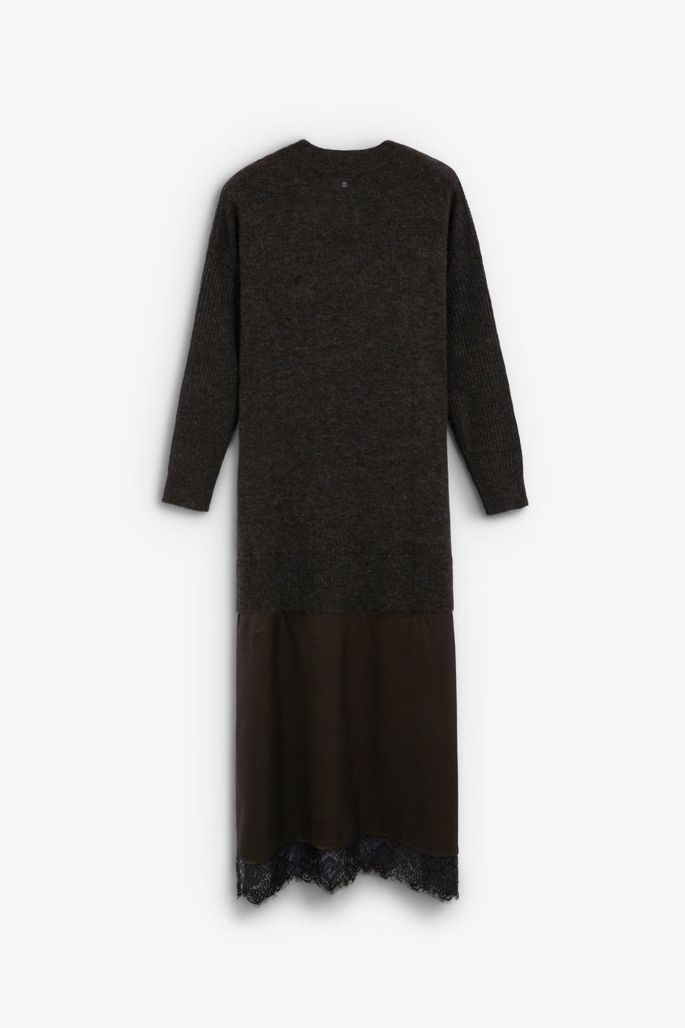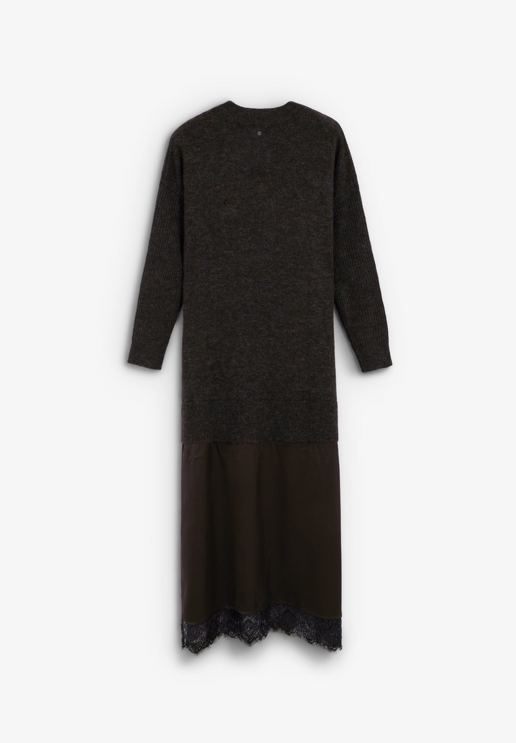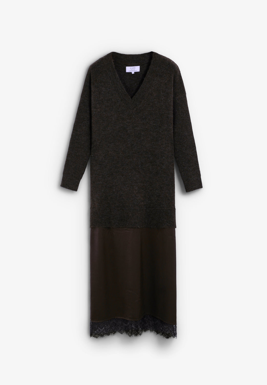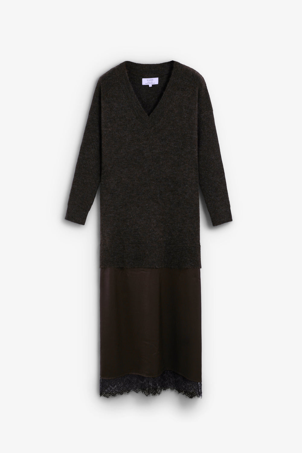 Loose-fit dress made of a wool and viscose blend. Midi length with V-neck and long sleeves. Ribbed trim on neckline, cuffs and hem with brown and black camisole detailing.