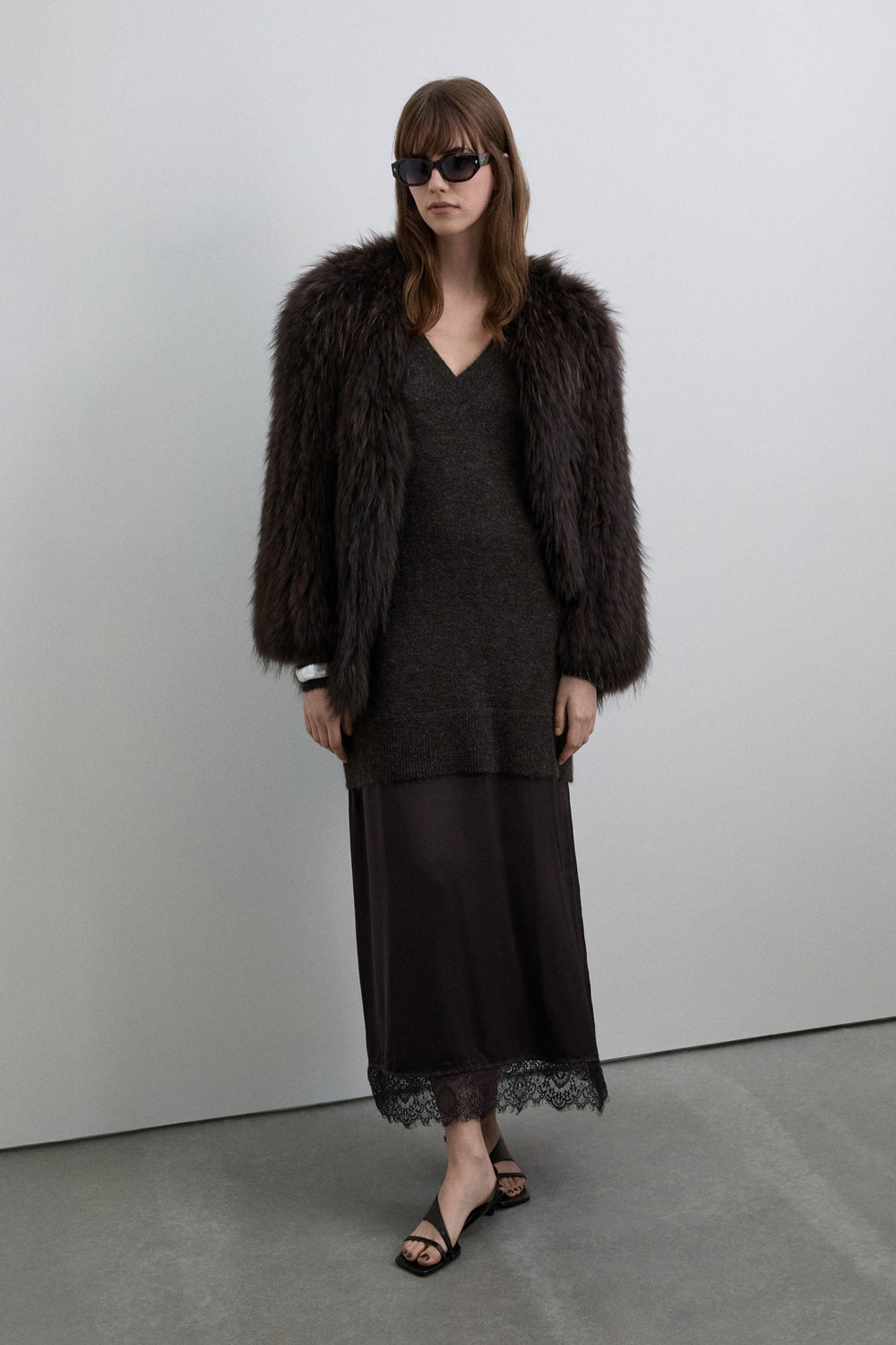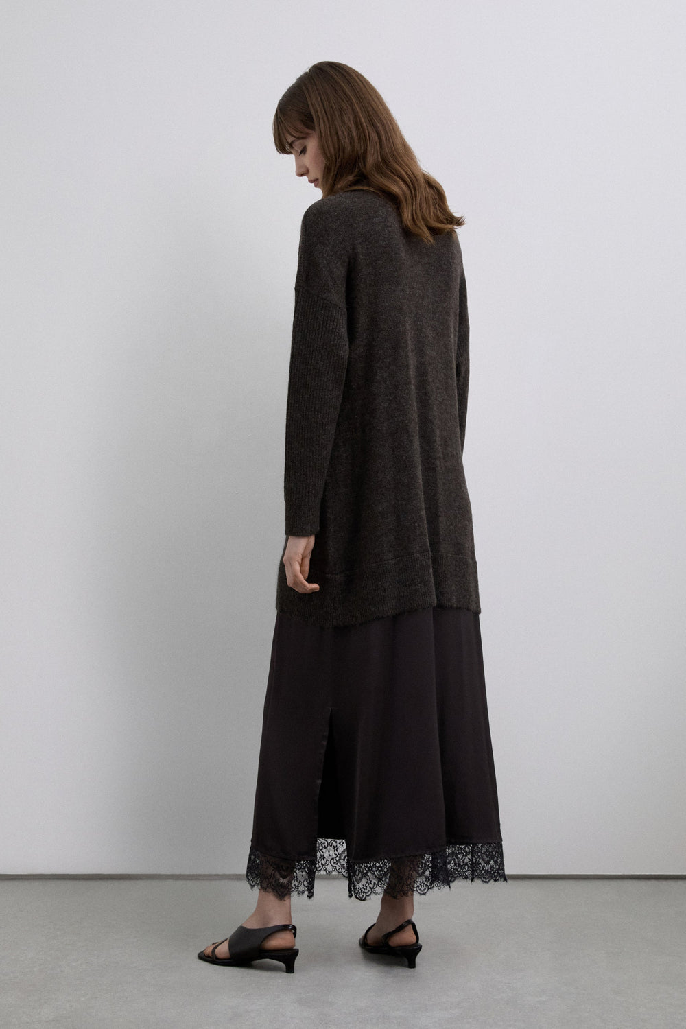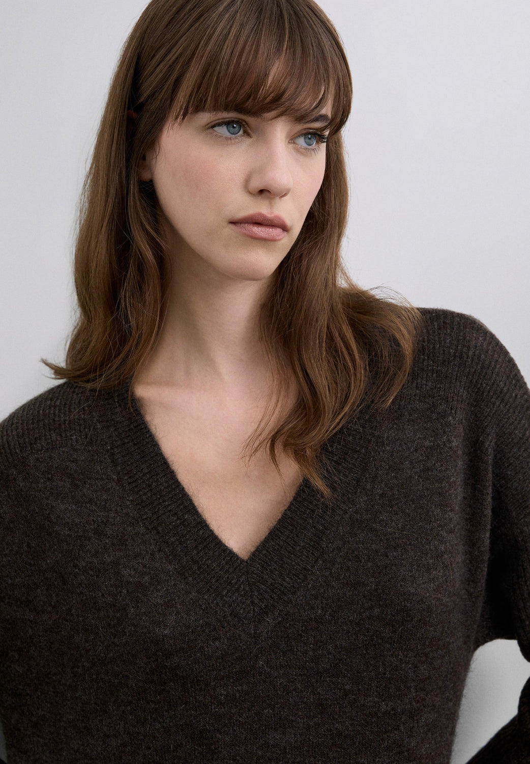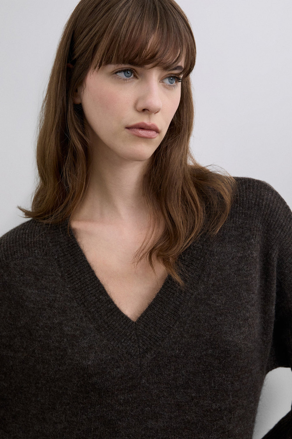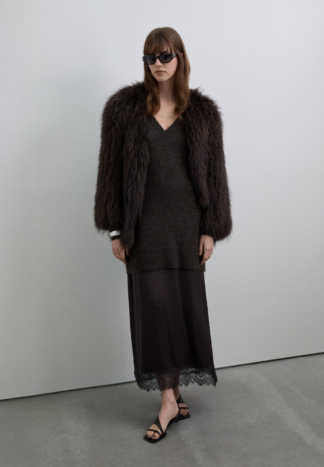 Loose-fit dress made of a wool and viscose blend. Midi length with V-neck and long sleeves. Ribbed trim on neckline, cuffs and hem with brown and black camisole detailing.