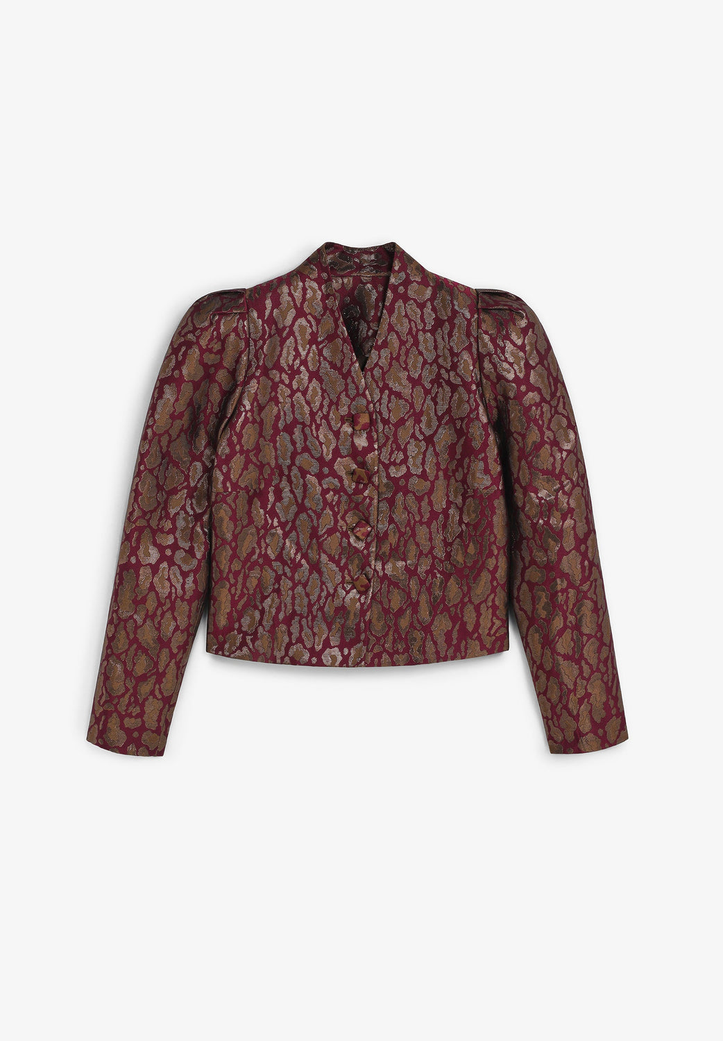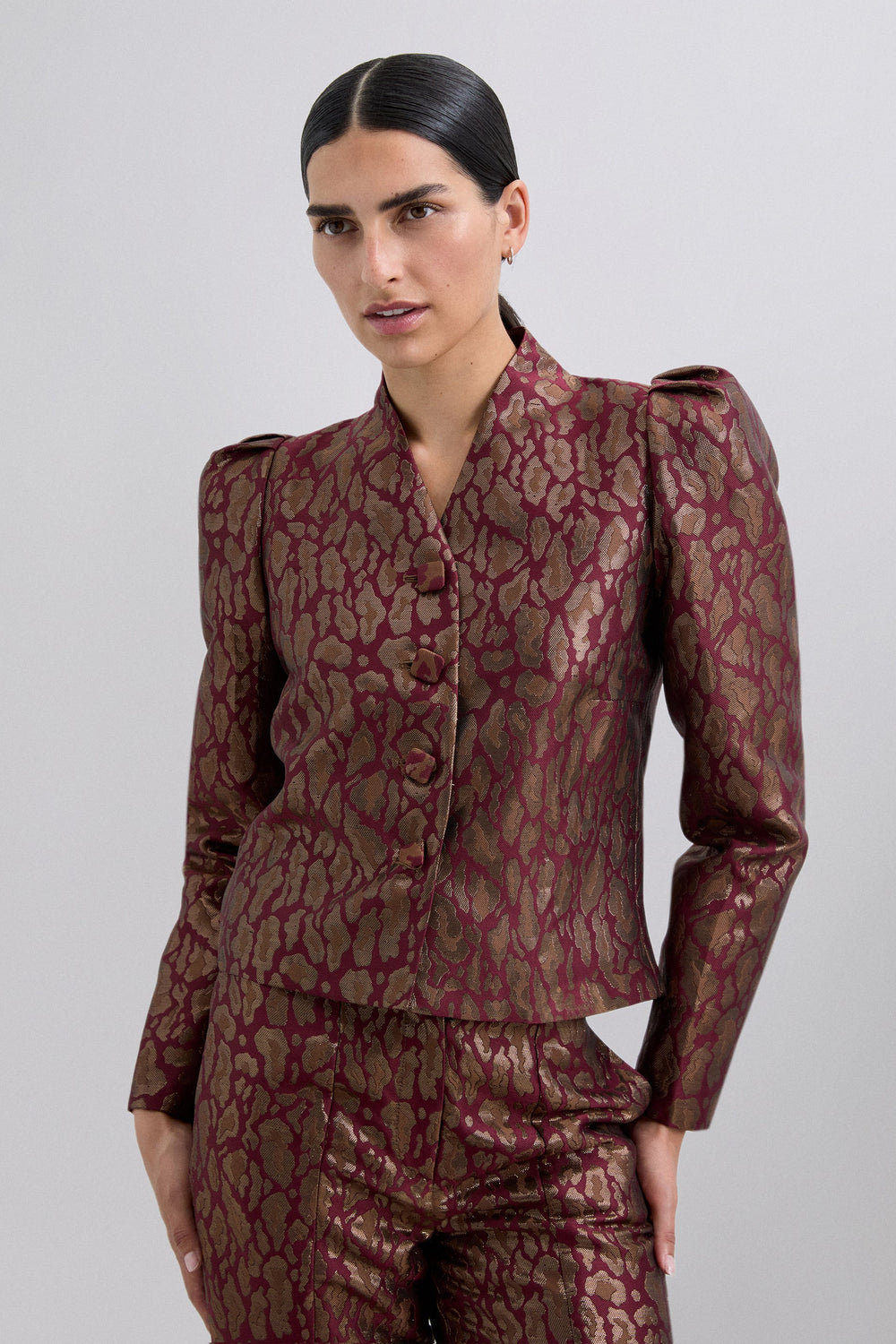 Cropped blazer in metallic-effect fabric with animal print. Slightly high collar. Long balloon sleeves with pleating at the shoulders. Fitted design with button fastening.