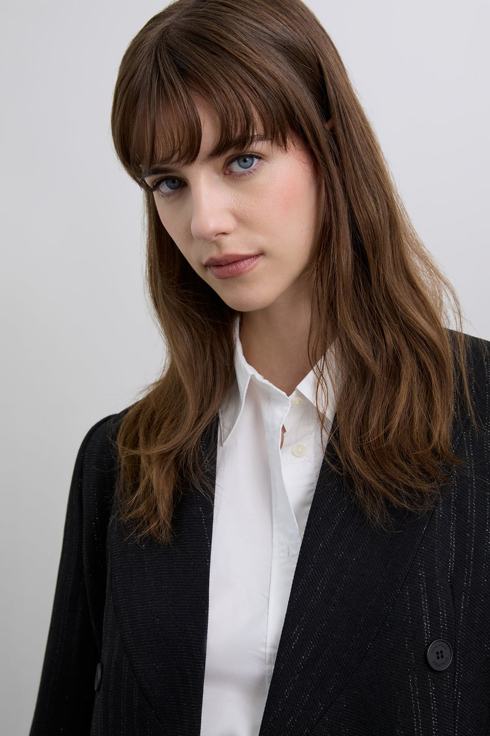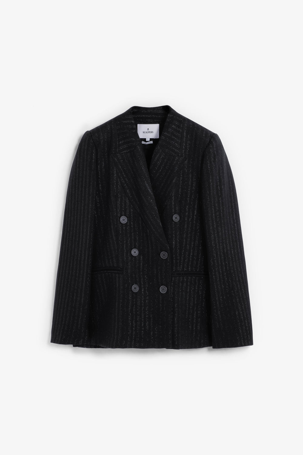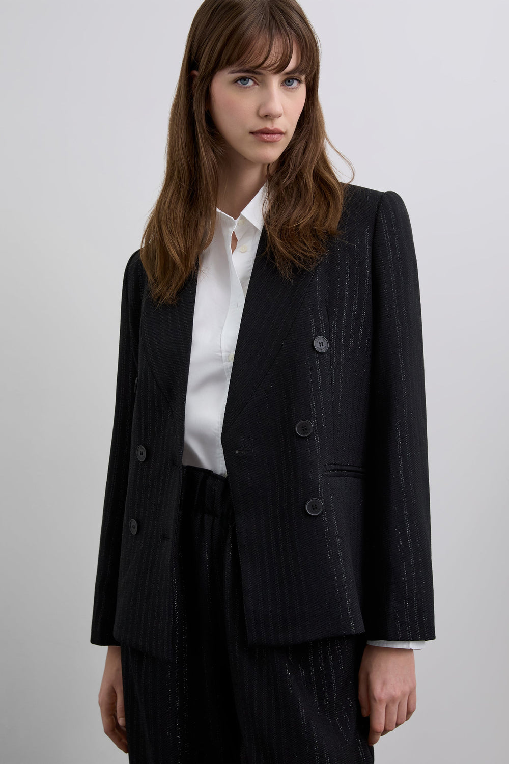 Double-breasted pinstripe blazer. Lapel collar. Regular fit. Double-breasted button fastening. Front flap pockets.