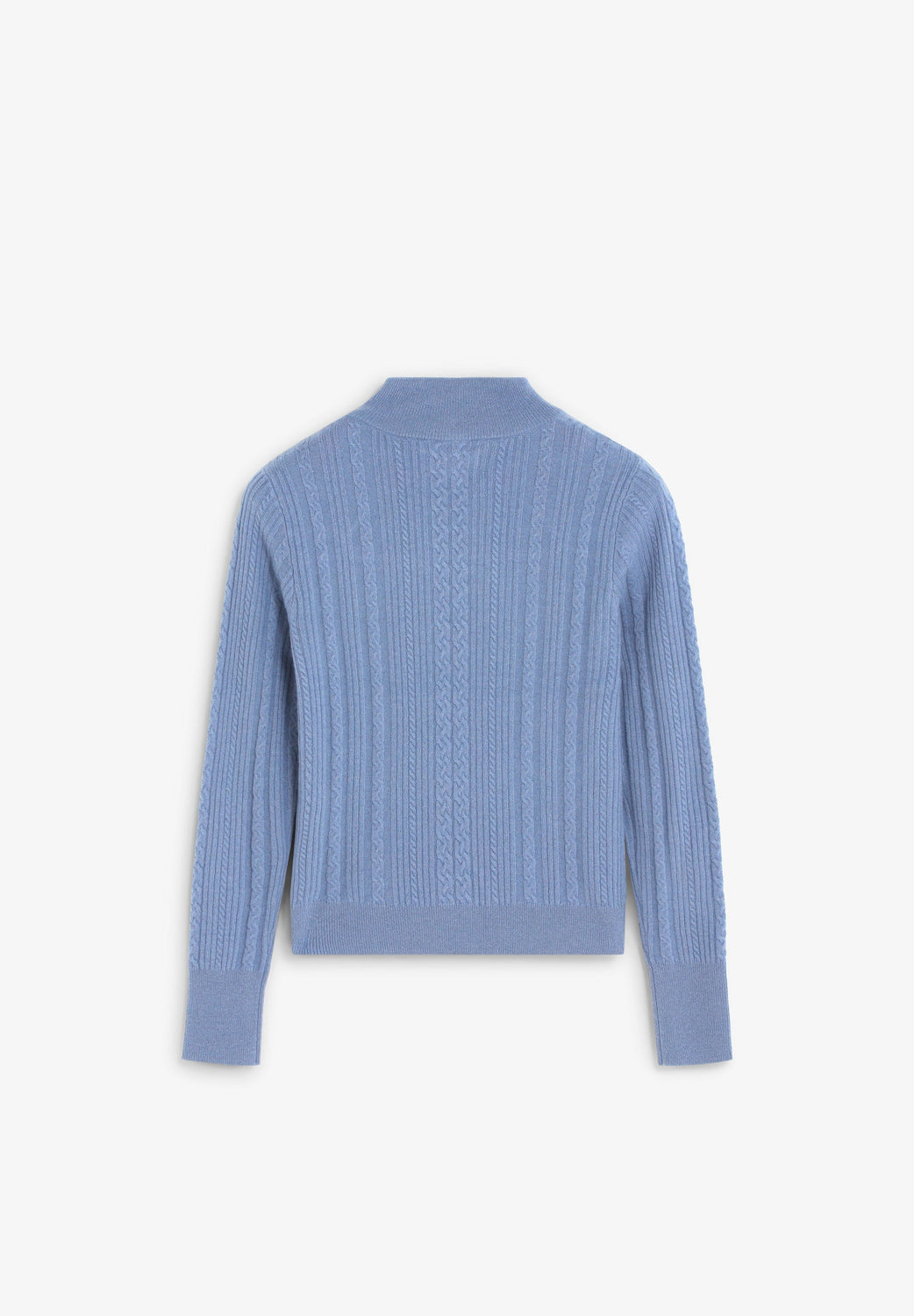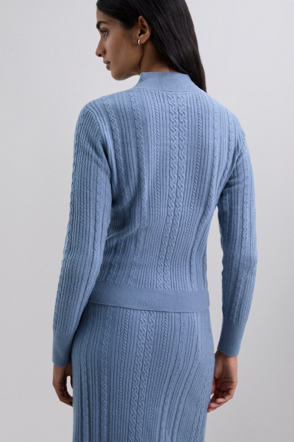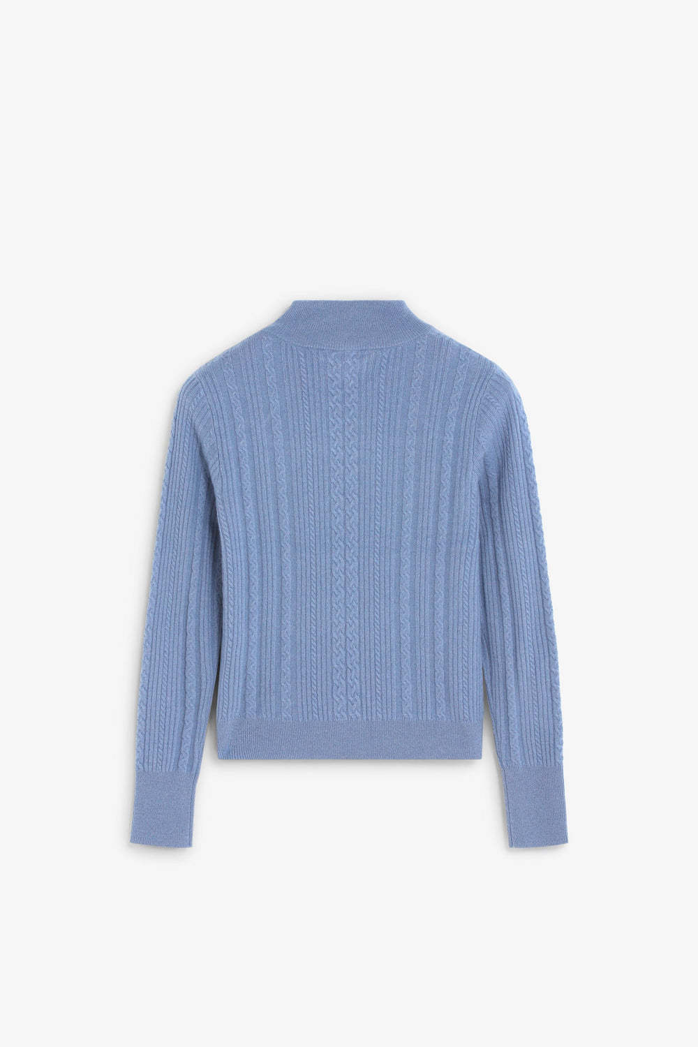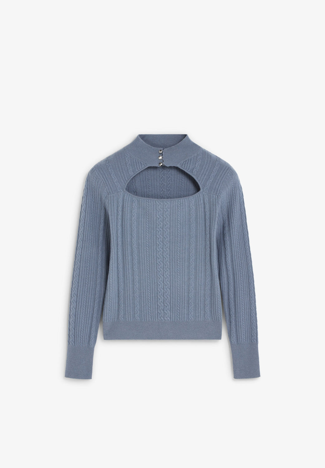 Cable knit sweater made of a wool and cashmere blend. Slim fit. High collar with button fastening. Cut-out at the neckline.