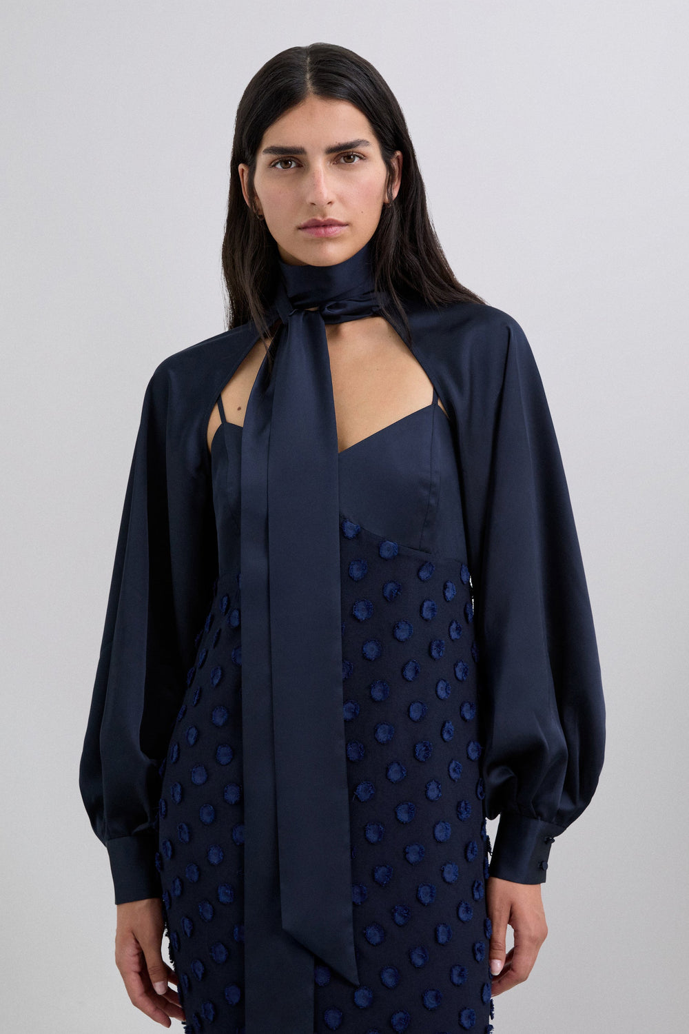 Matador-style cape. Puff sleeves. Adjustable button fastening on the cuffs. Button fastening at collar. Tie detail at the neck.