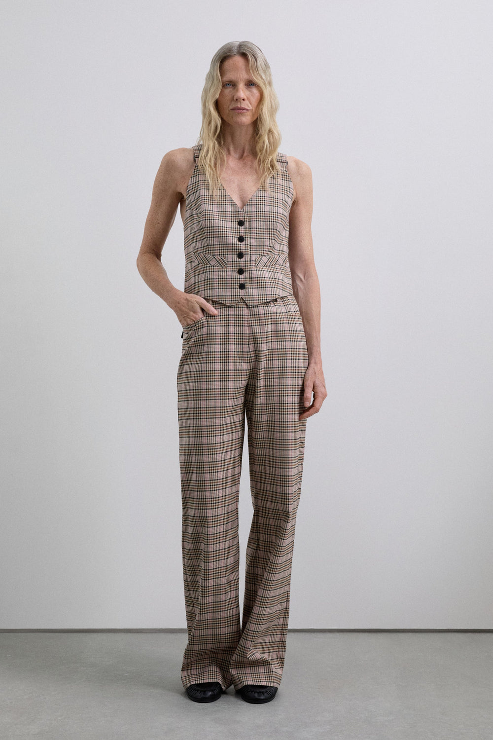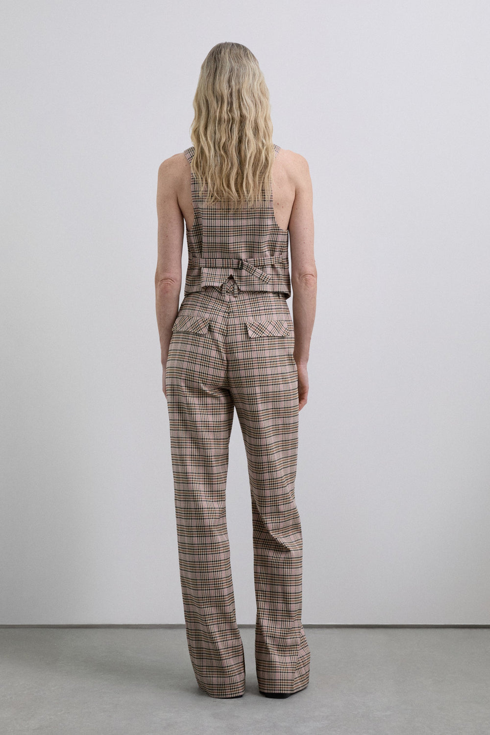 Flared trousers. Front pockets. Flap pocket at the back. Belt loops at the waist. Check print.