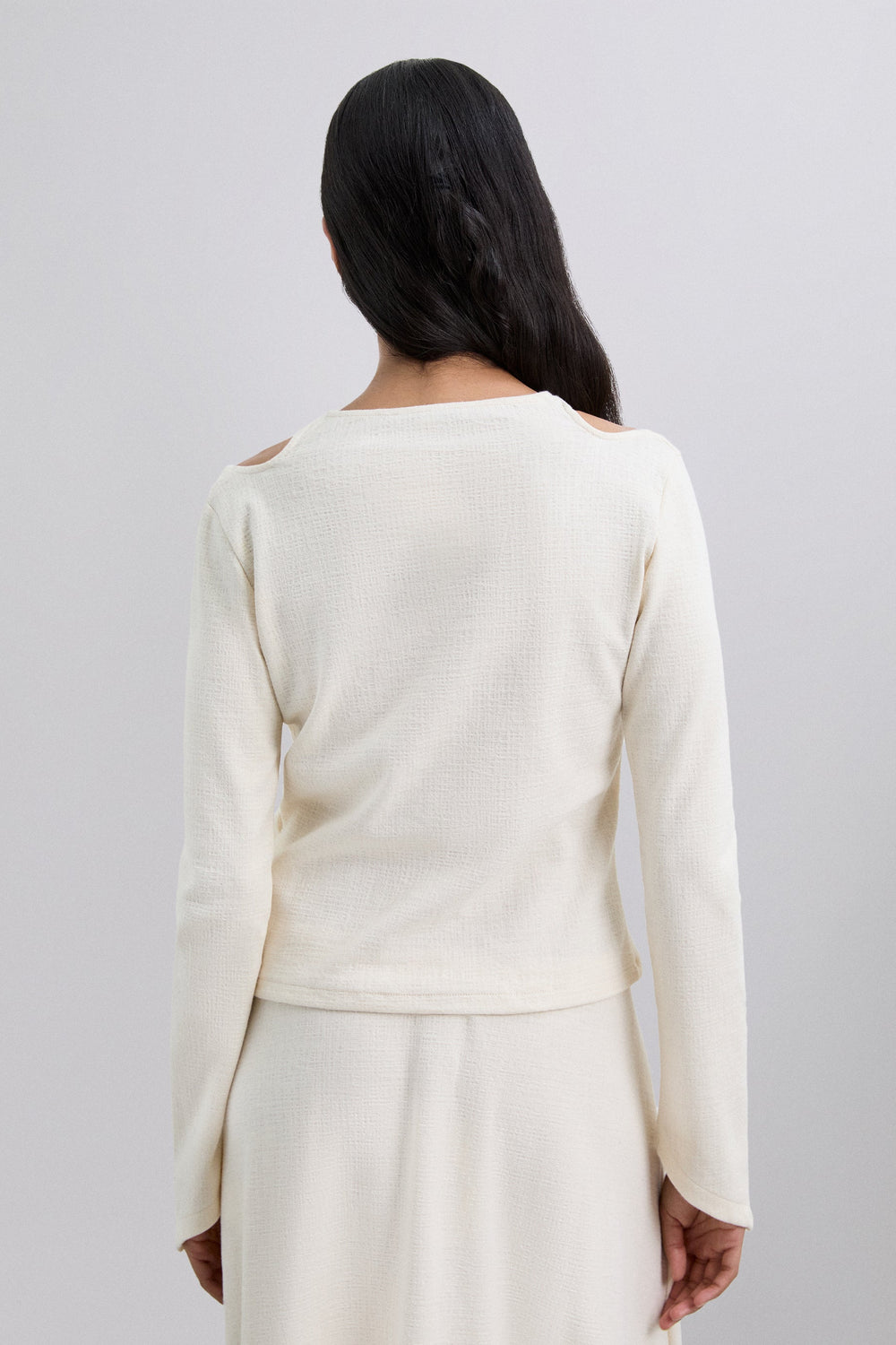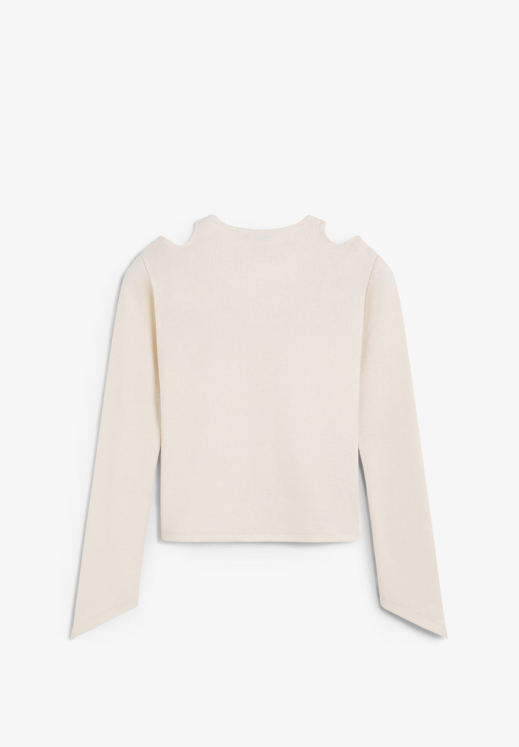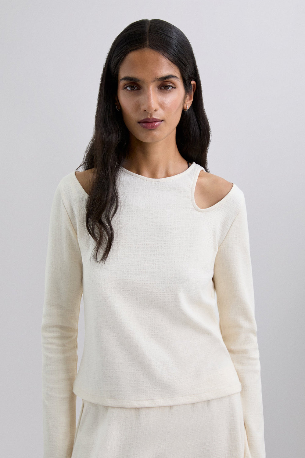 T-shirt made of cotton. Long sleeves with asymmetric finish. Round neck. Shoulder slits.