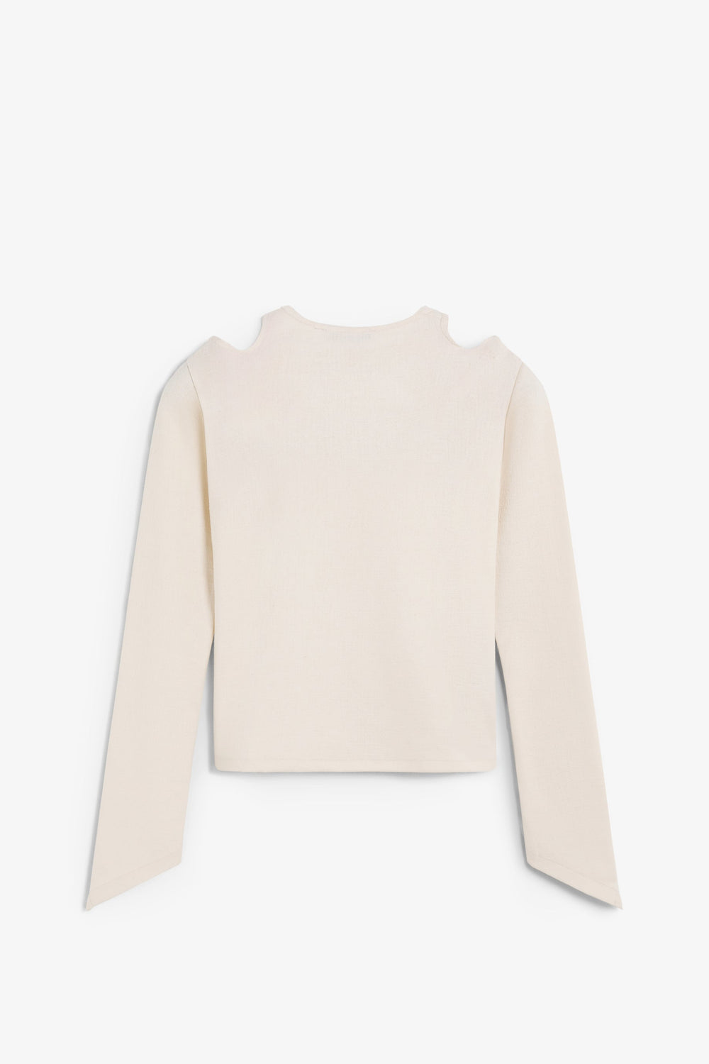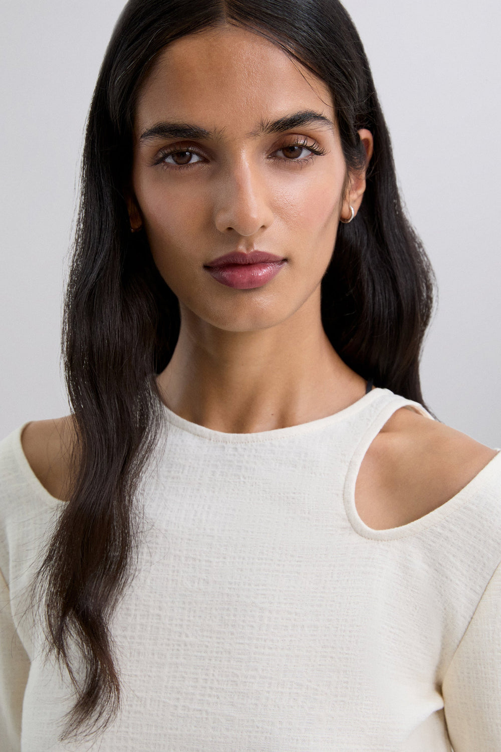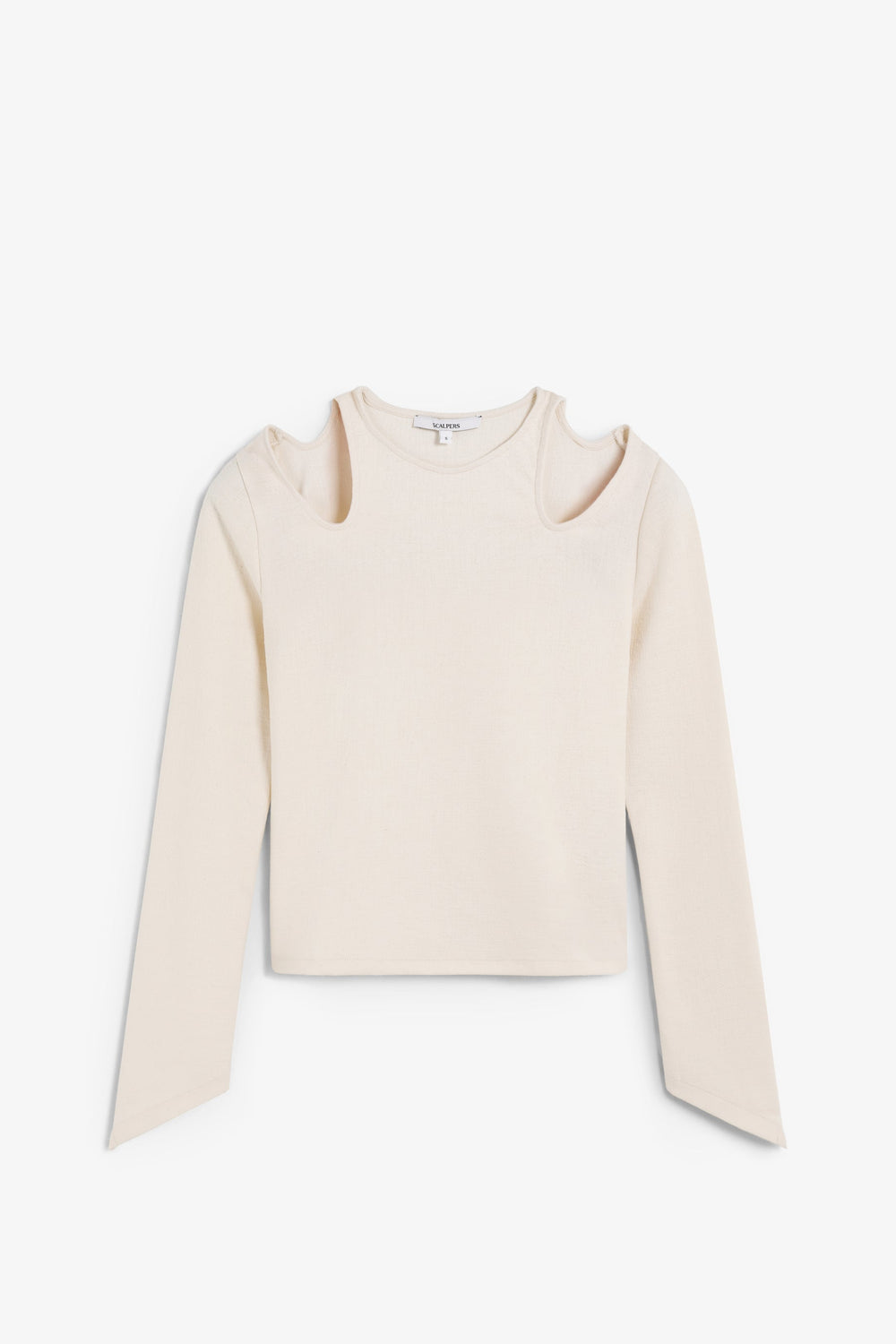 T-shirt made of cotton. Long sleeves with asymmetric finish. Round neck. Shoulder slits.
