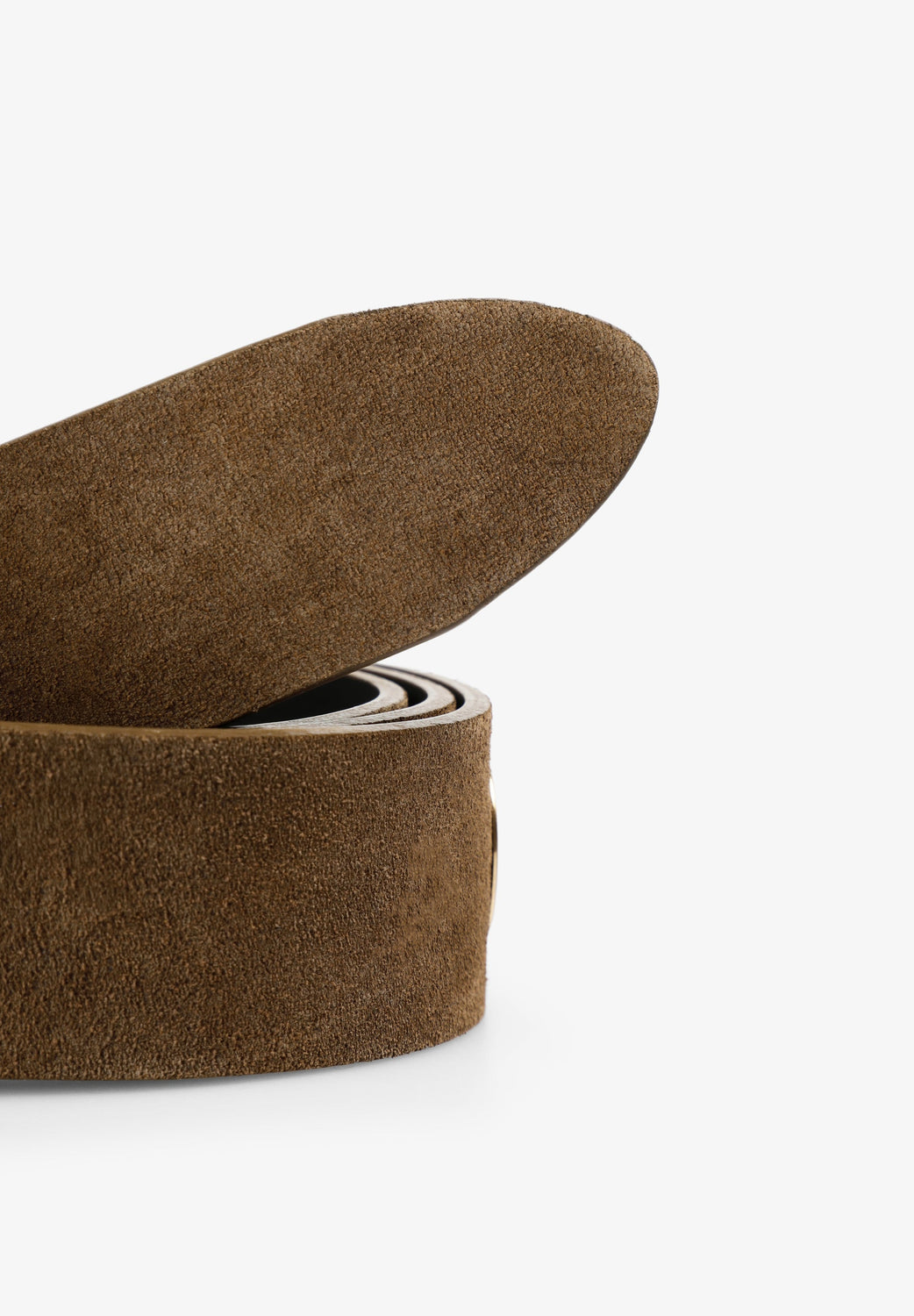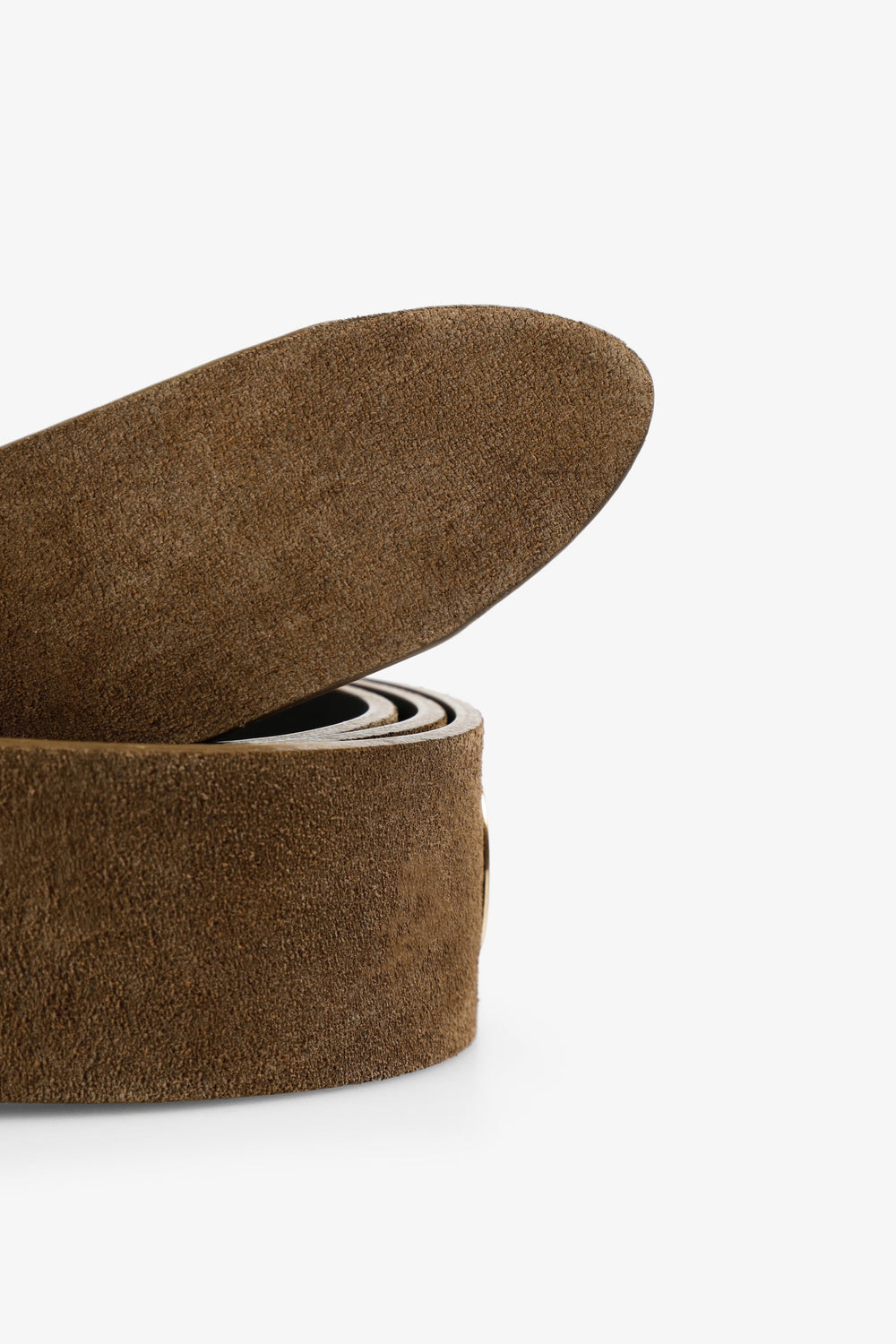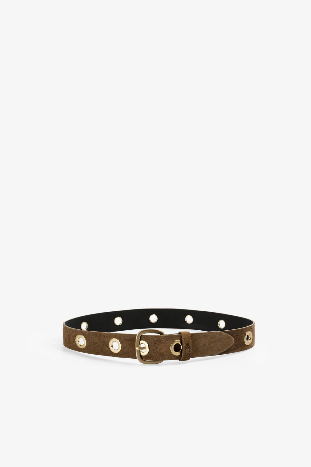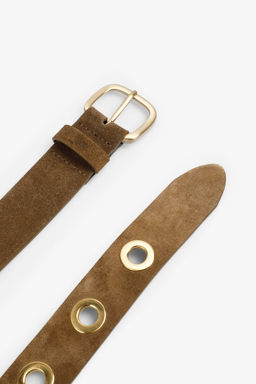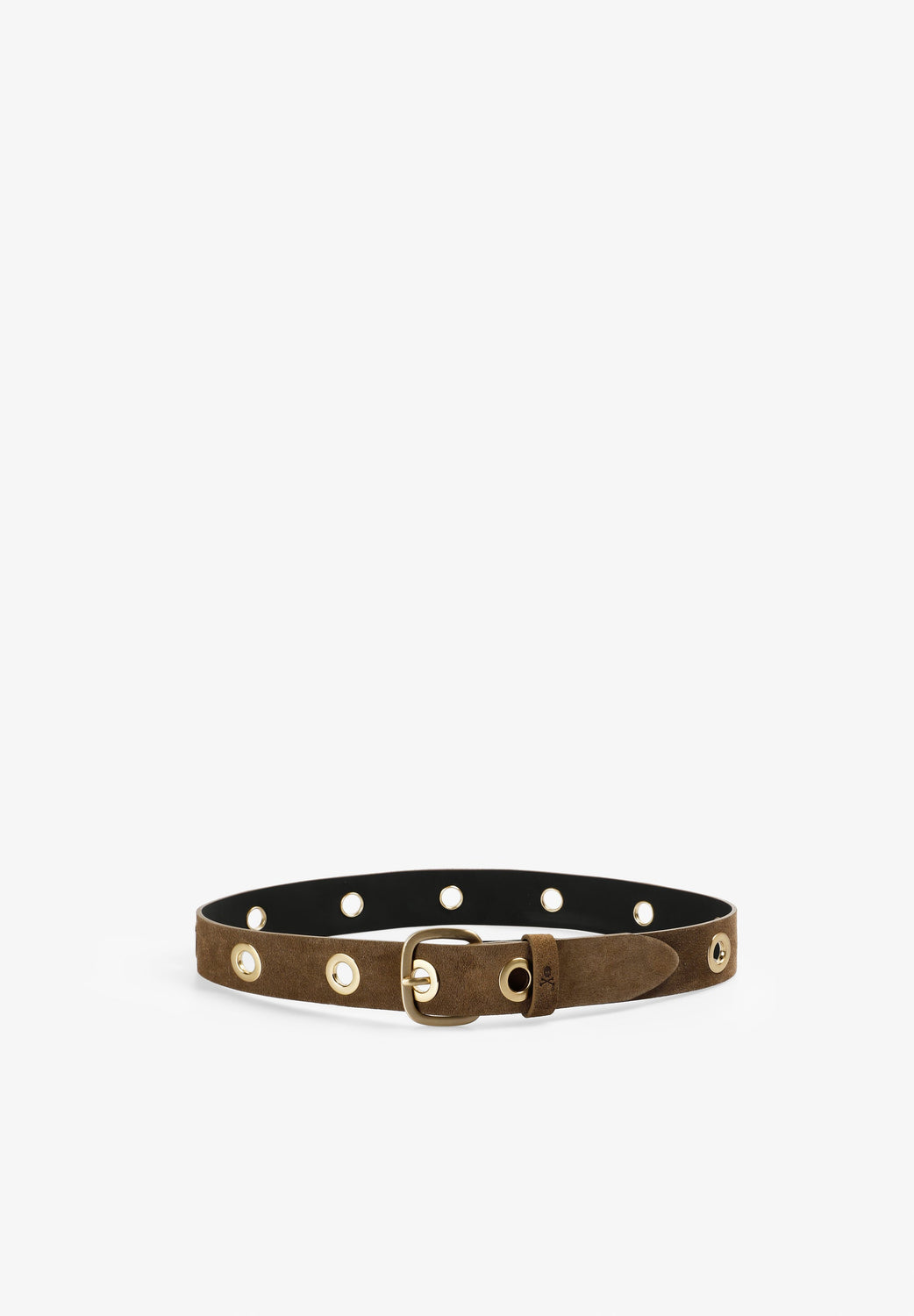Leather belt. Adjustable metal buckle fastening. Matching embroidered skull detail.