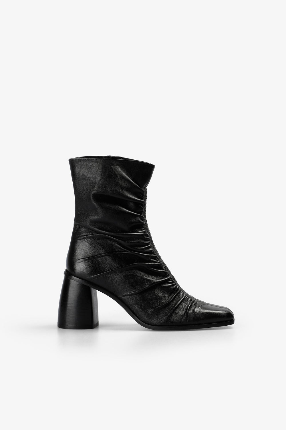 Boots made of 100% leather. Medium heel. Draped effect detailing on the centre front. Zip fastening. Embroidered logo detail on the zip. Heel height: 5 cm.