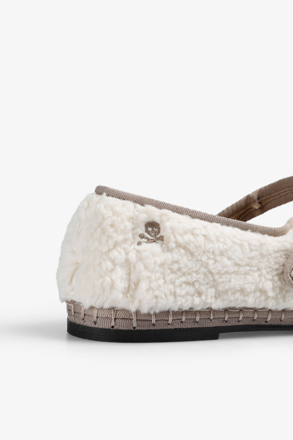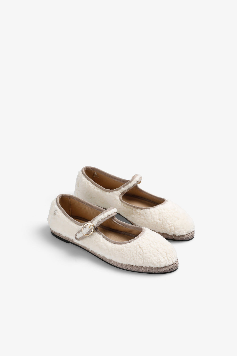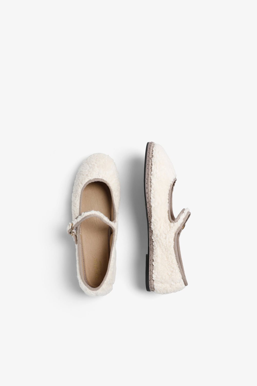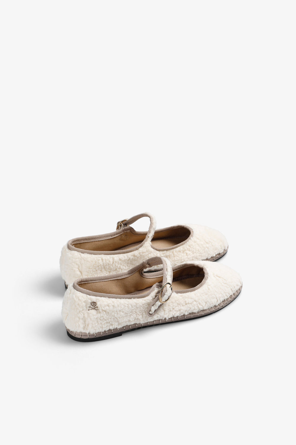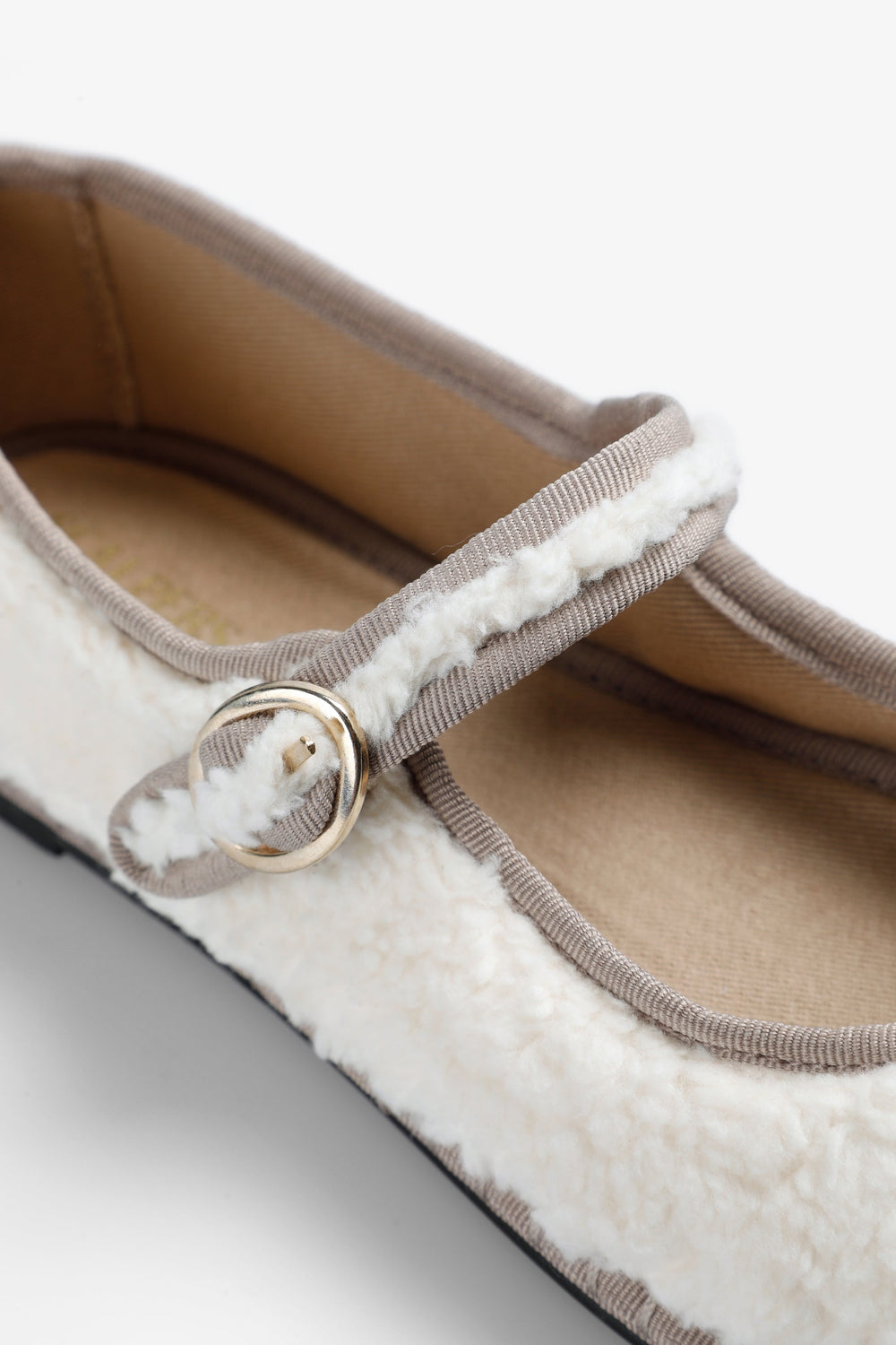 Ballet flats made of an organic cotton blend. Faux shearling trim. Adjustable strap and buckle fastening. Contrast embroidered logo detail.