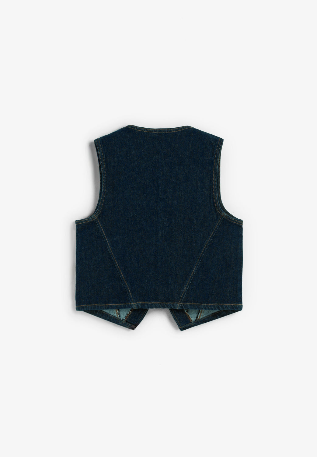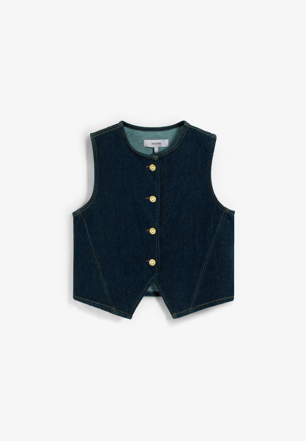 Denim gilet made of slightly stretchy cotton. Cropped, sleeveless design, slim fit with round neck. Button fastening and front and back cut-out detail.