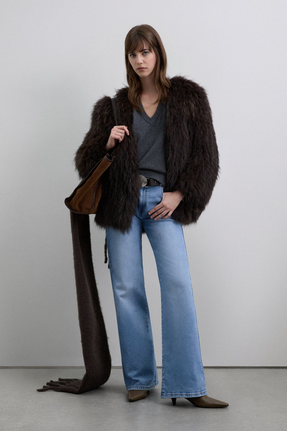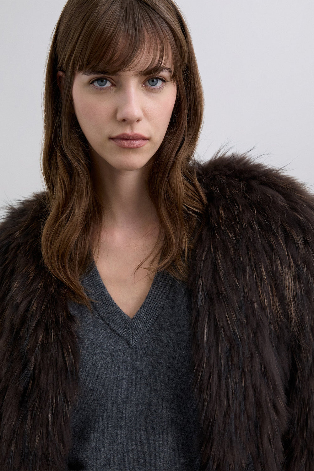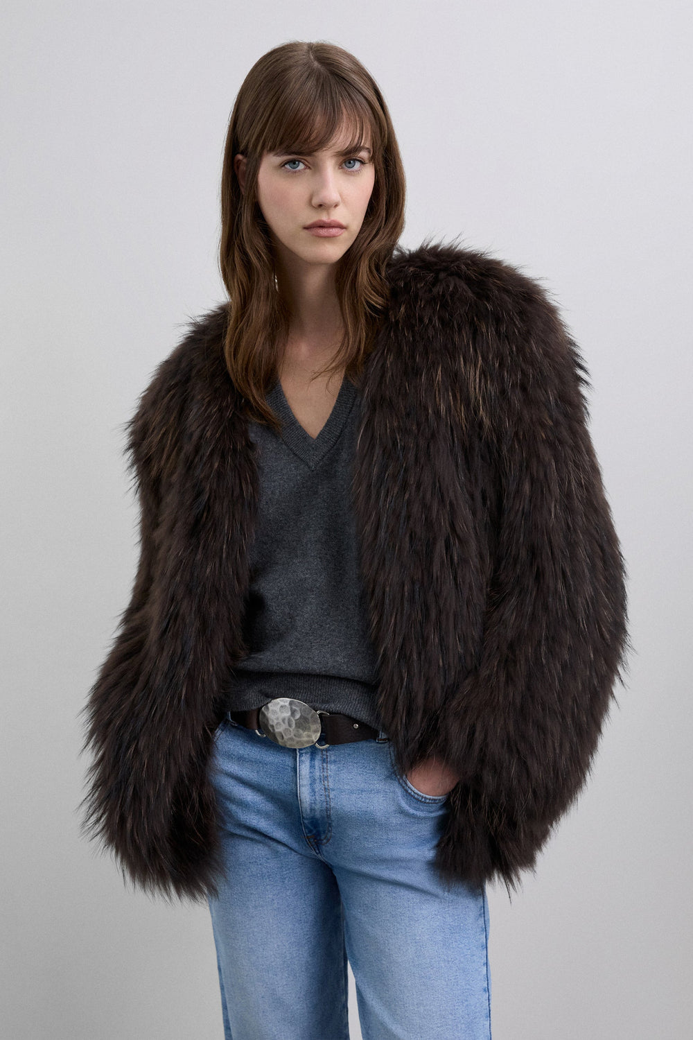 Premium coat made of 100% fur. Regular fit. V-neck. Long sleeves. Hook fastening.