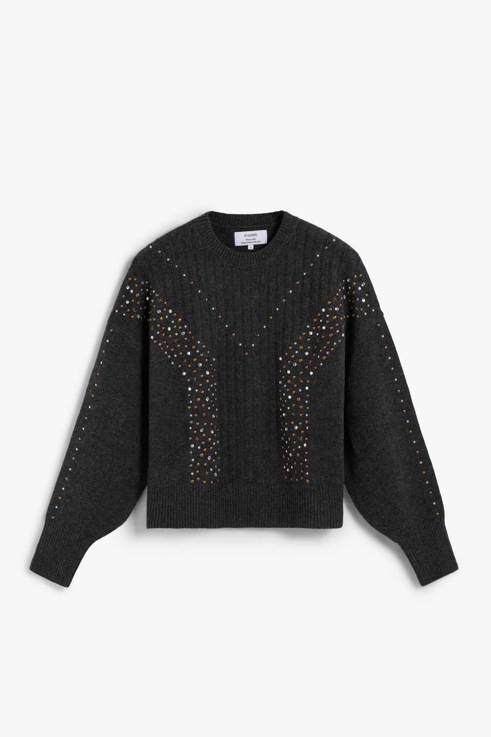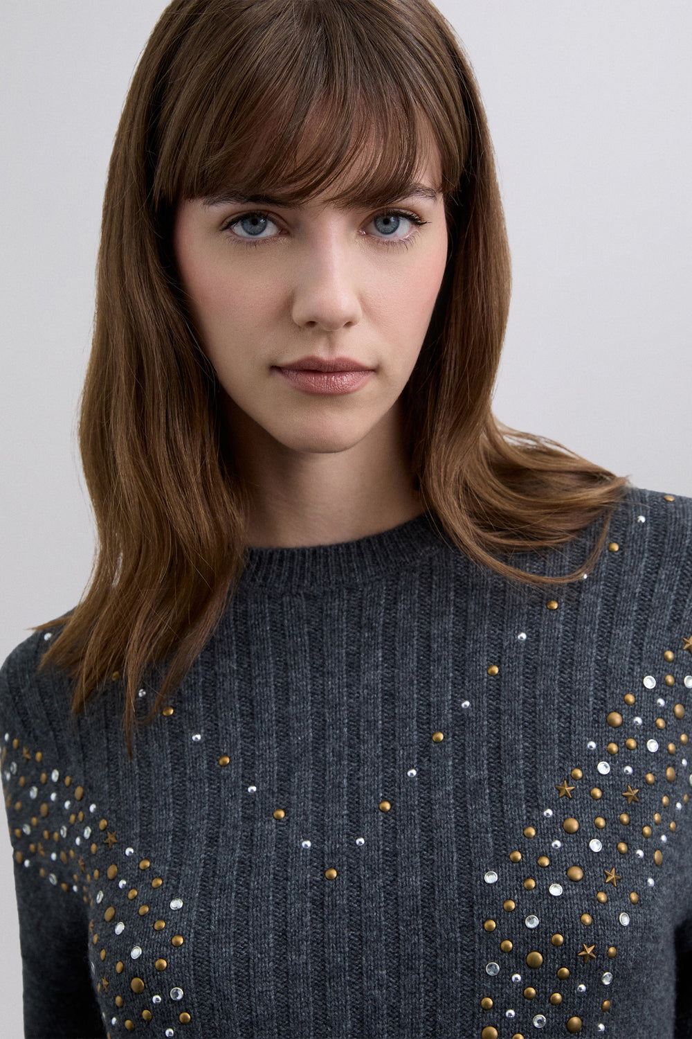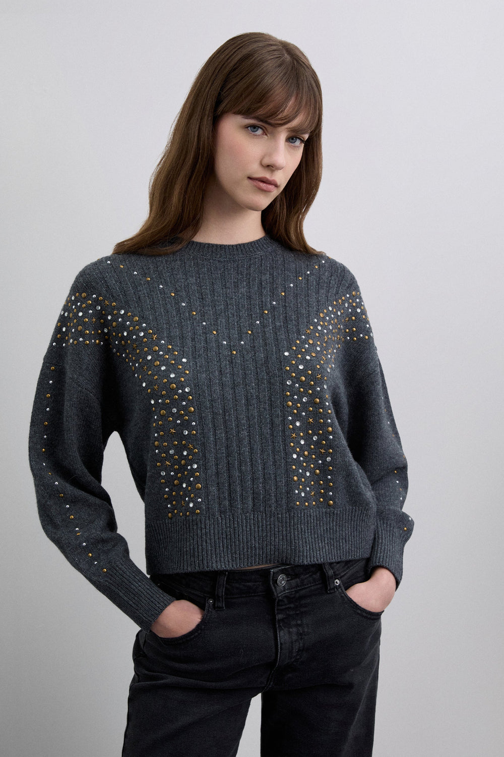 Ribbed knit sweater with stud detailing. Regular fit. Round neck. Long sleeves with ribbed cuffs.